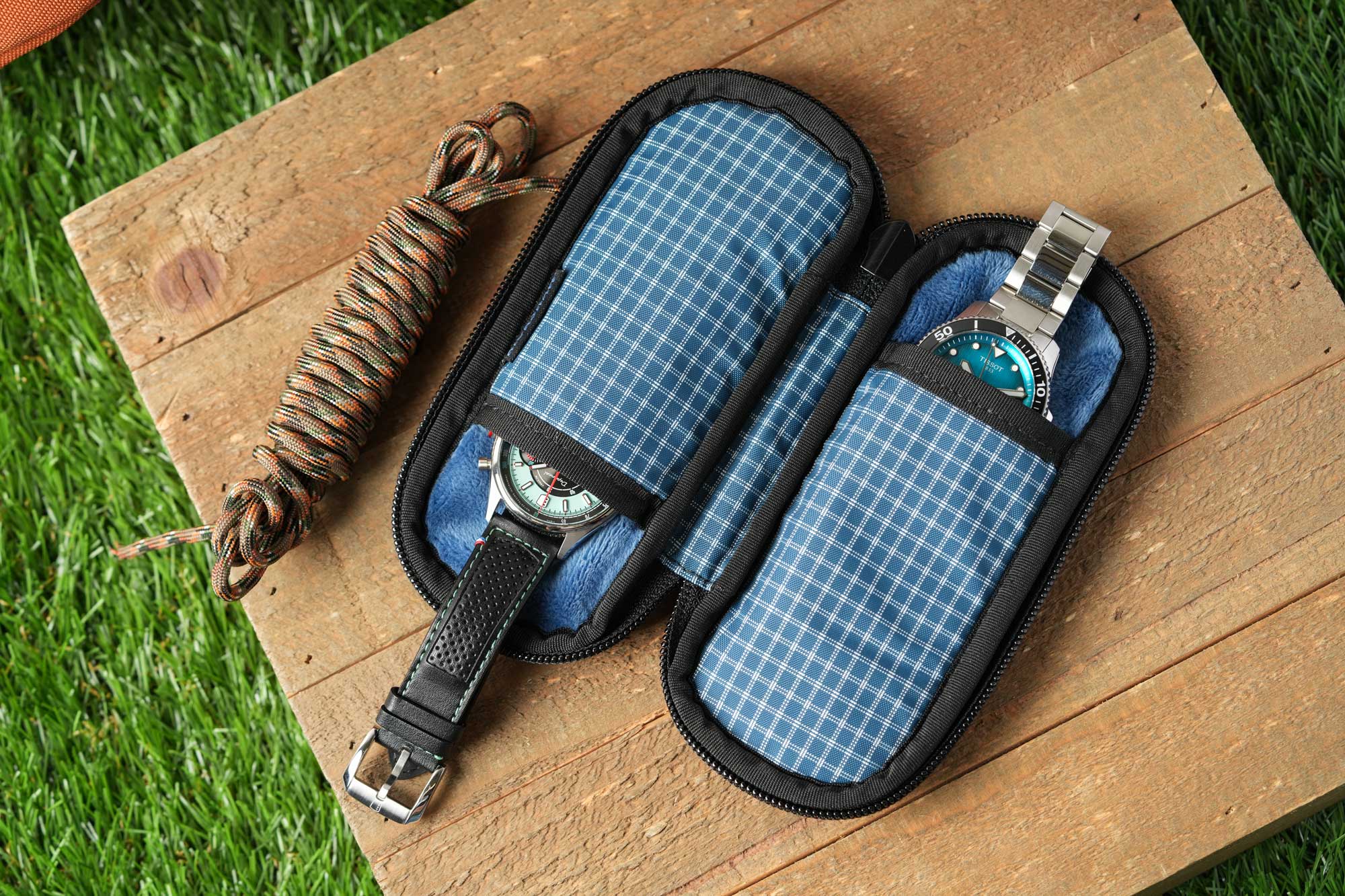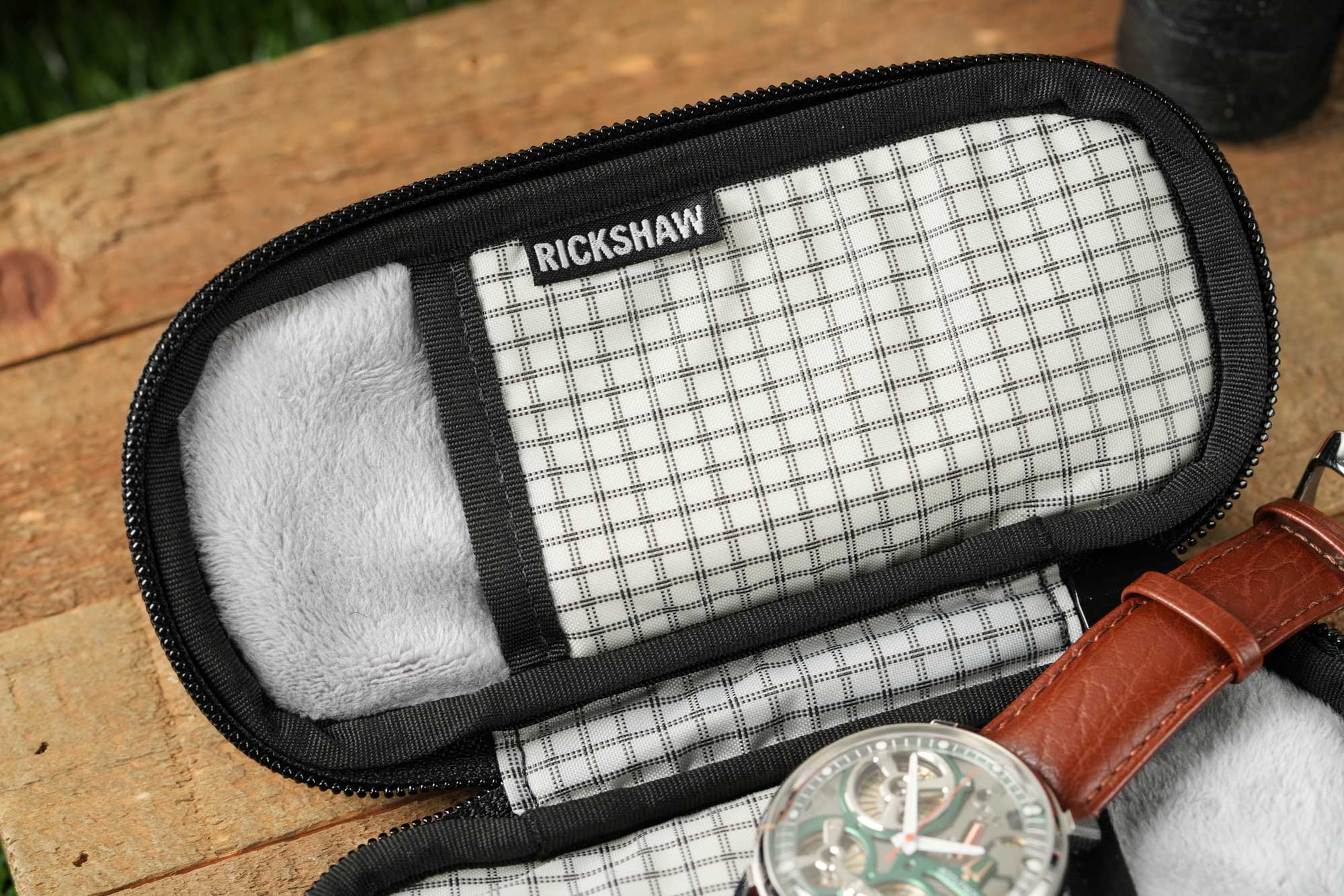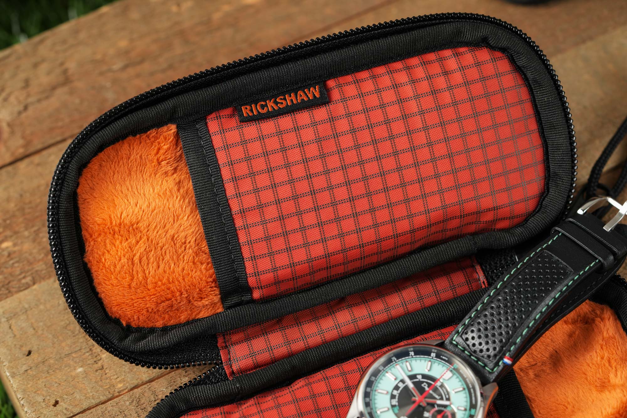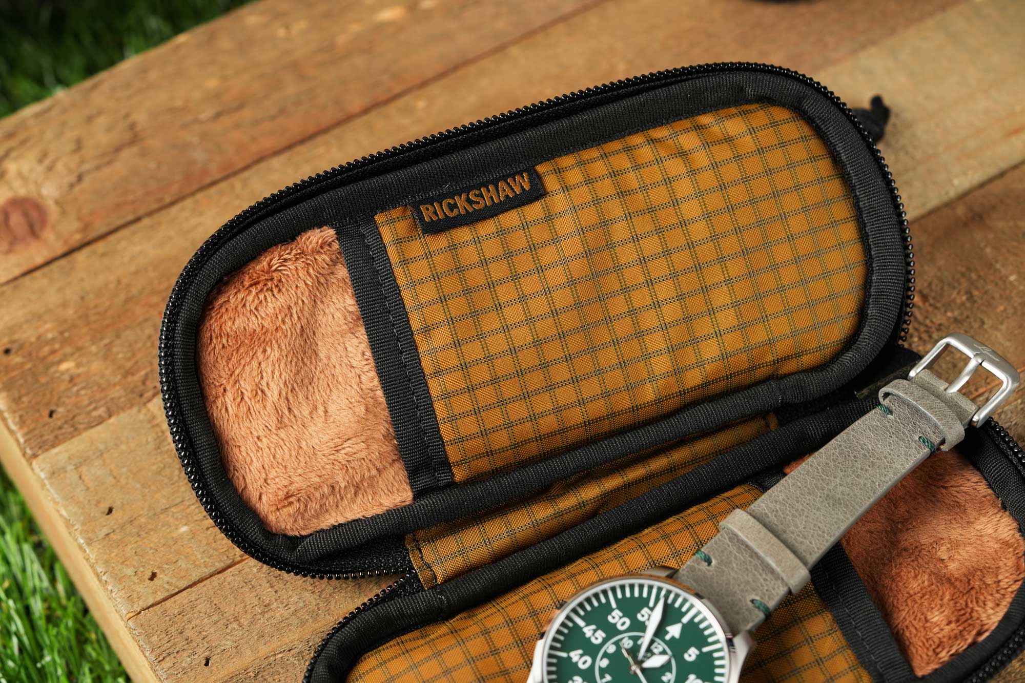 The TimeKeeper 2 Ultragrid Nylon wristwatch case is a great travel companion for watch collectors and enthusiasts. Made from scratch in Rickshaw's San Francisco factory and proudly bearing the "Made in USA" label, the TimeKeeper 2 features two pockets, each accommodating watches up to 45mm in diameter. The super-soft Royal Plush lining prevents scratches, while foam padding on both exterior faces offers excellent impact protection.  To ensure that watch crystals are not facing one another, simply insert the watches at opposite ends.