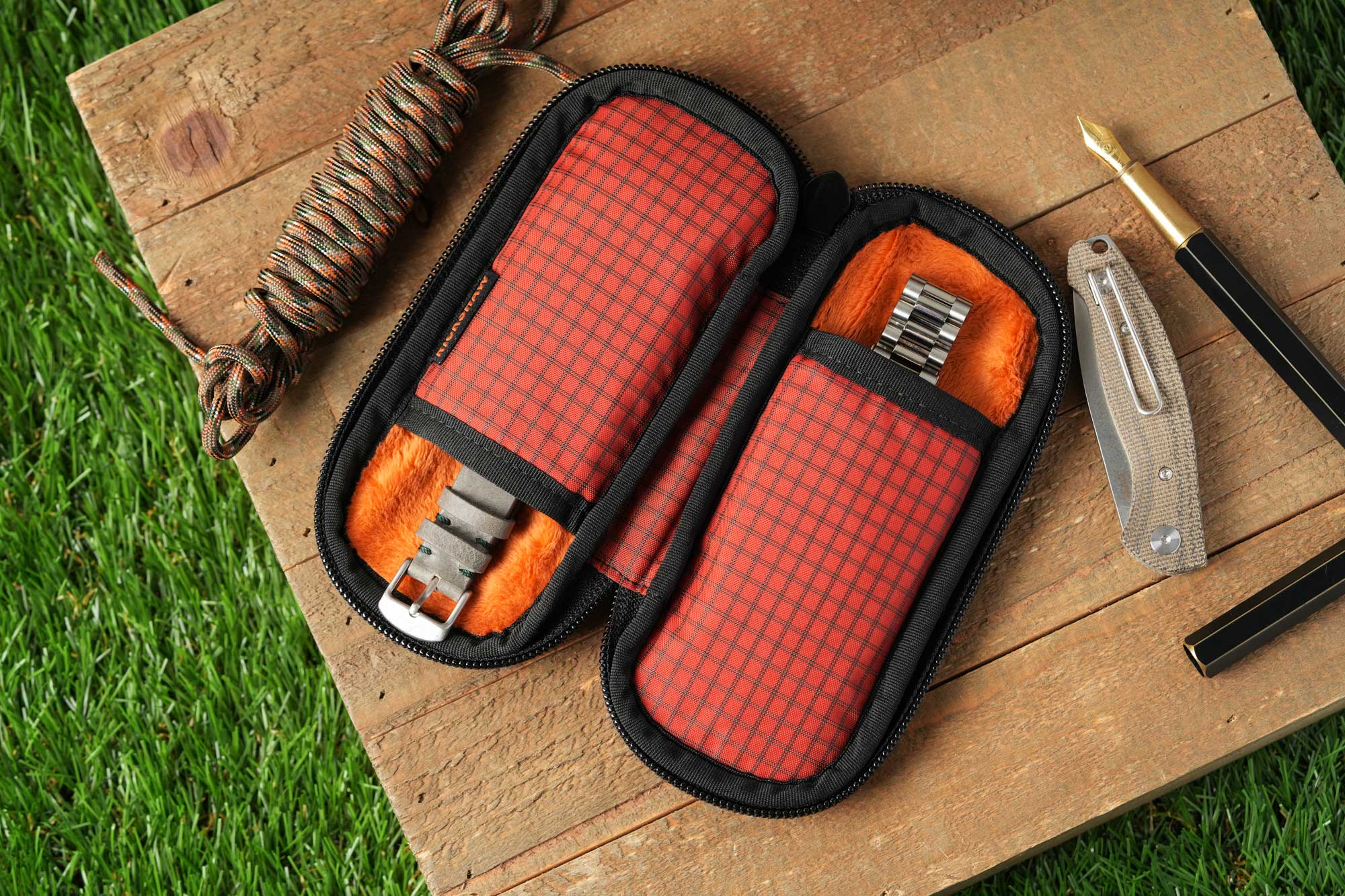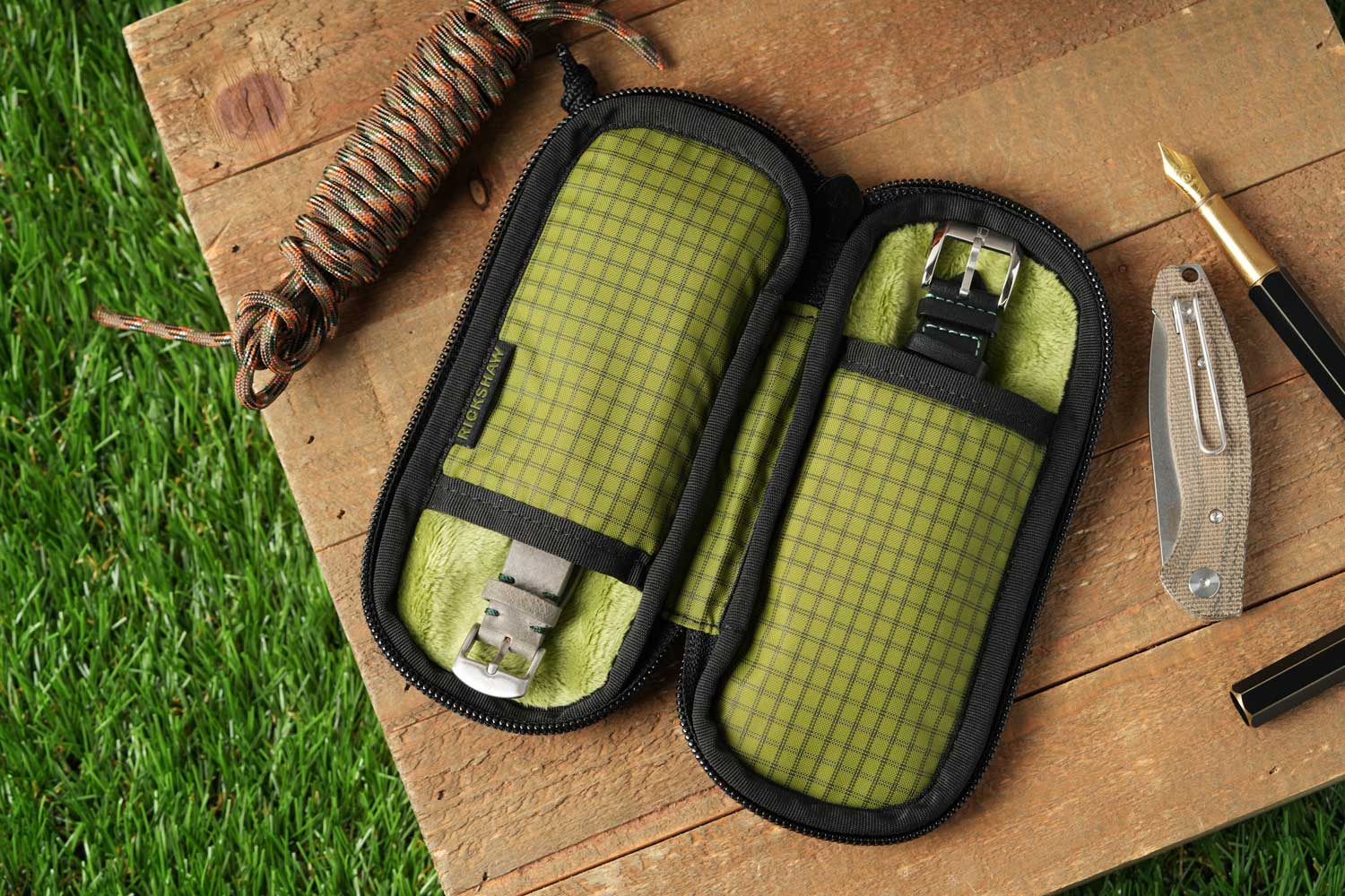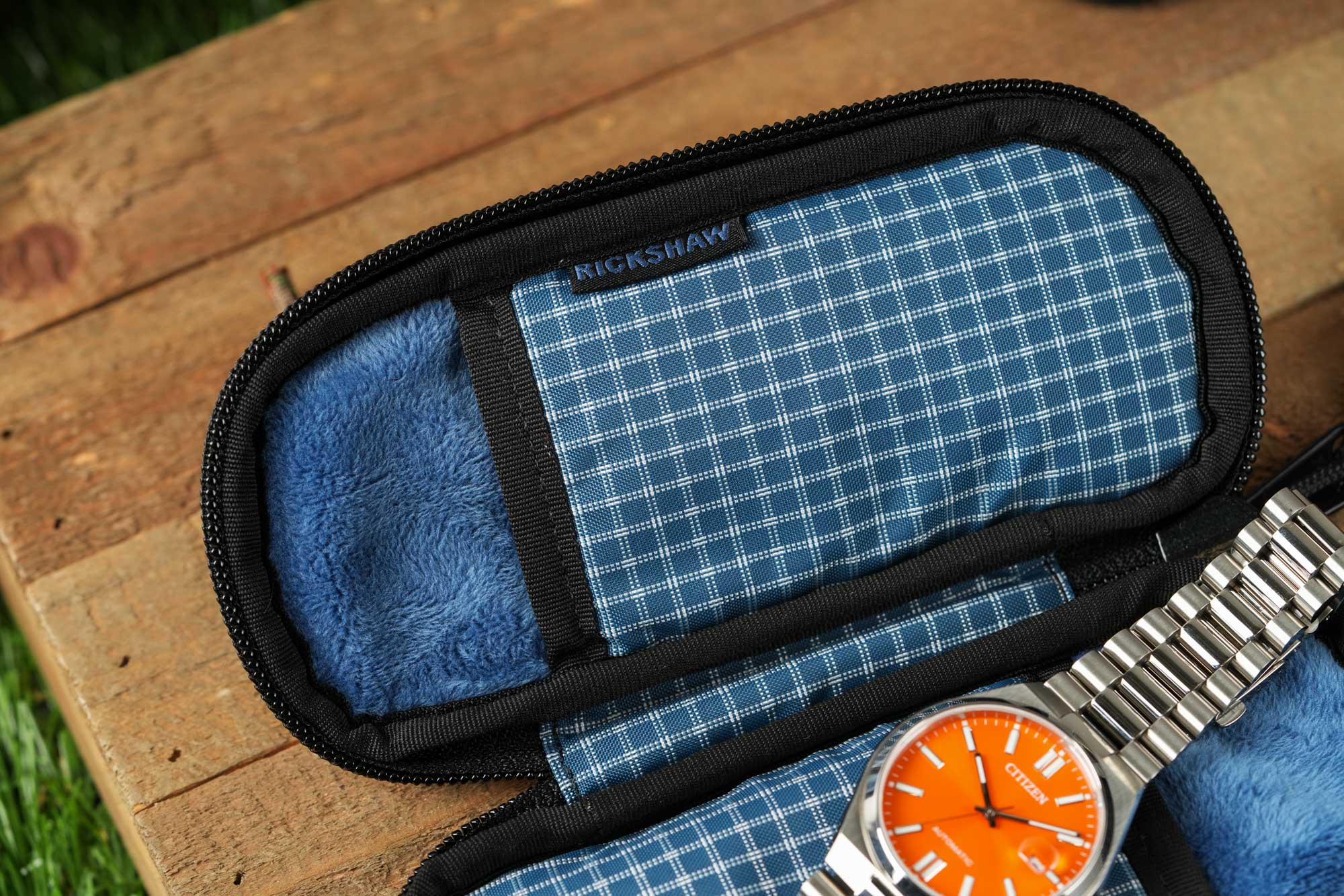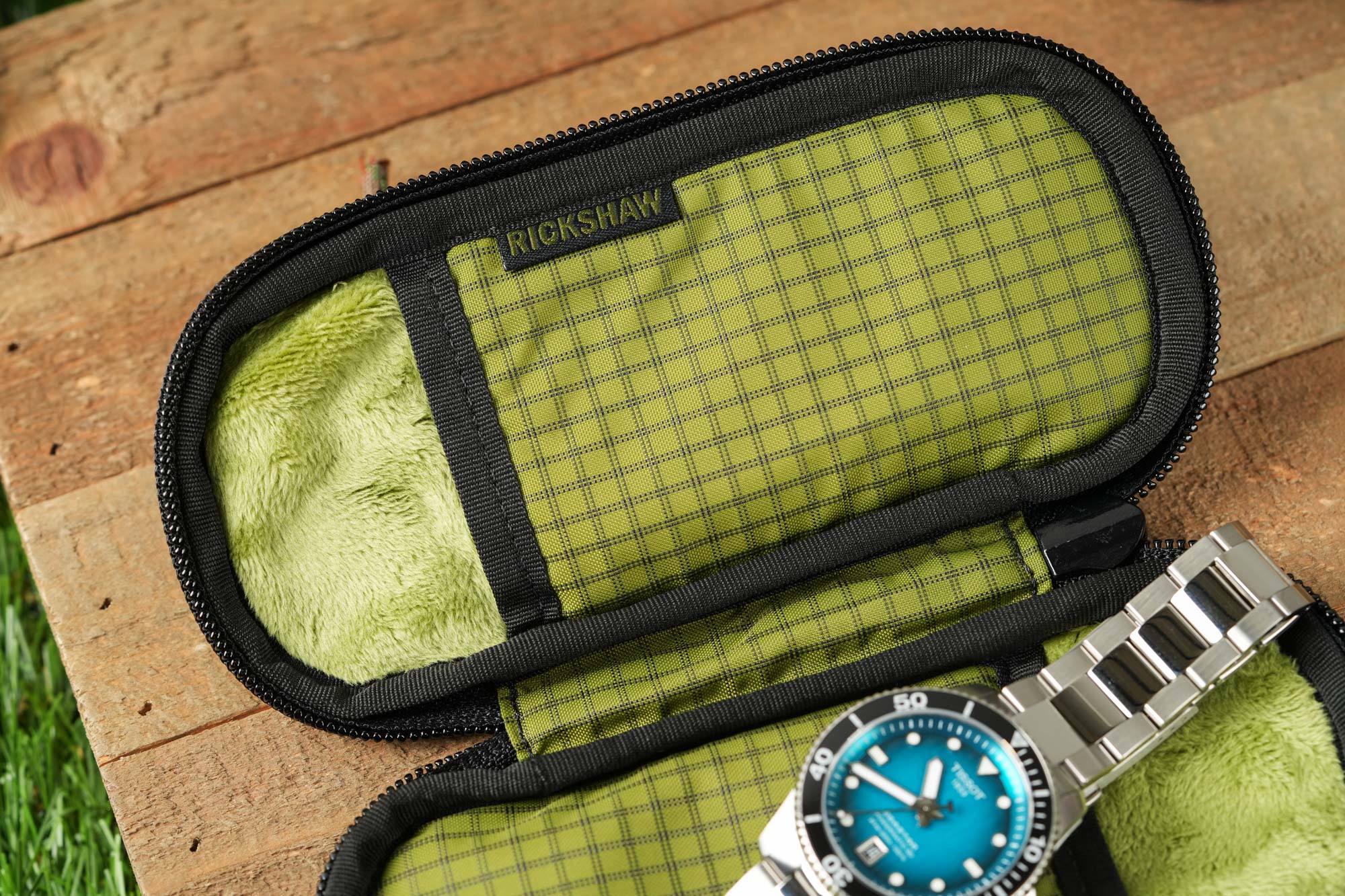 The TimeKeeper 2 Ultragrid Nylon wristwatch case is a great travel companion for watch collectors and enthusiasts. Made from scratch in Rickshaw's San Francisco factory and proudly bearing the "Made in USA" label, the TimeKeeper 2 features two pockets, each accommodating watches up to 45mm in diameter. The super-soft Royal Plush lining prevents scratches, while foam padding on both exterior faces offers excellent impact protection.  To ensure that watch crystals are not facing one another, simply insert the watches at opposite ends.