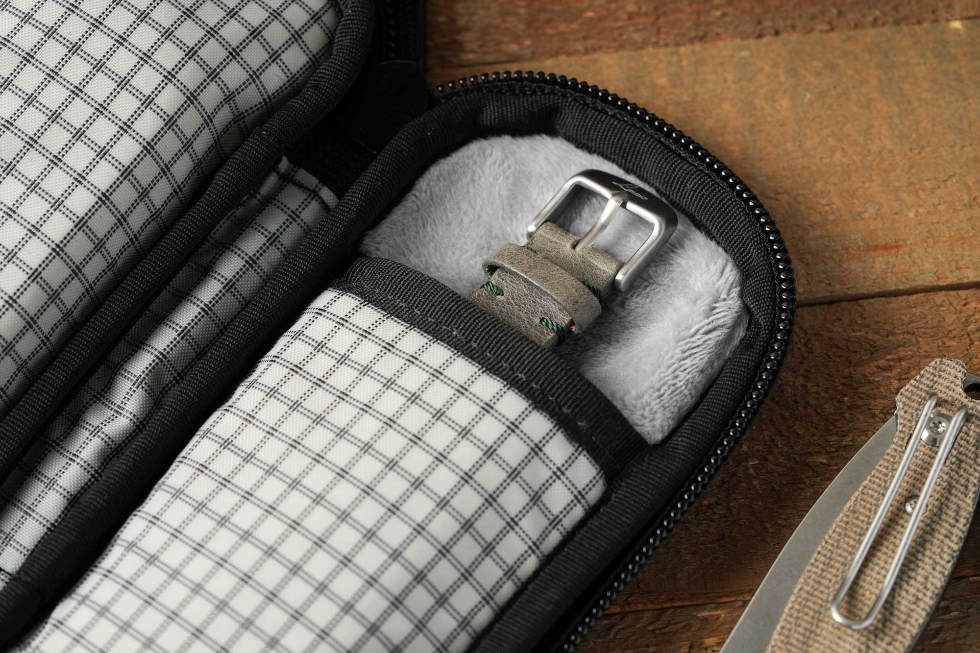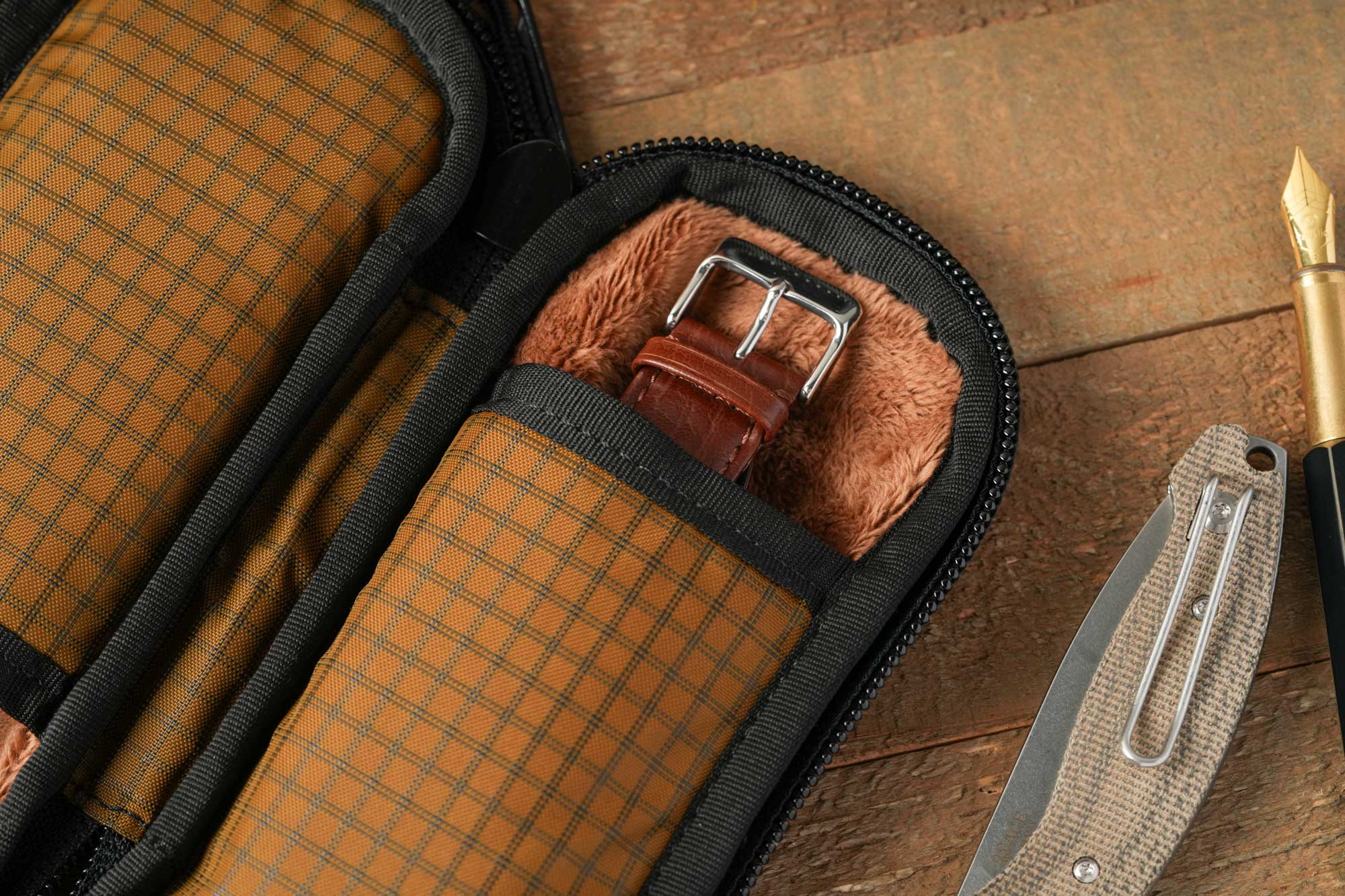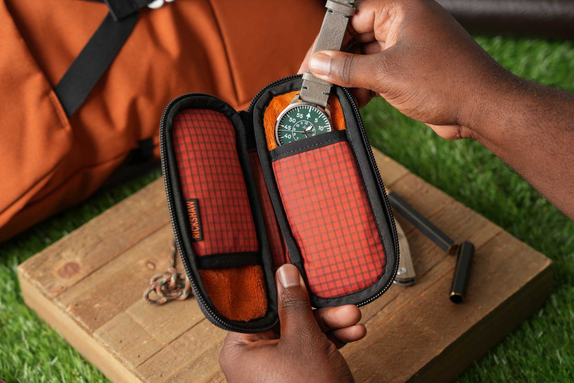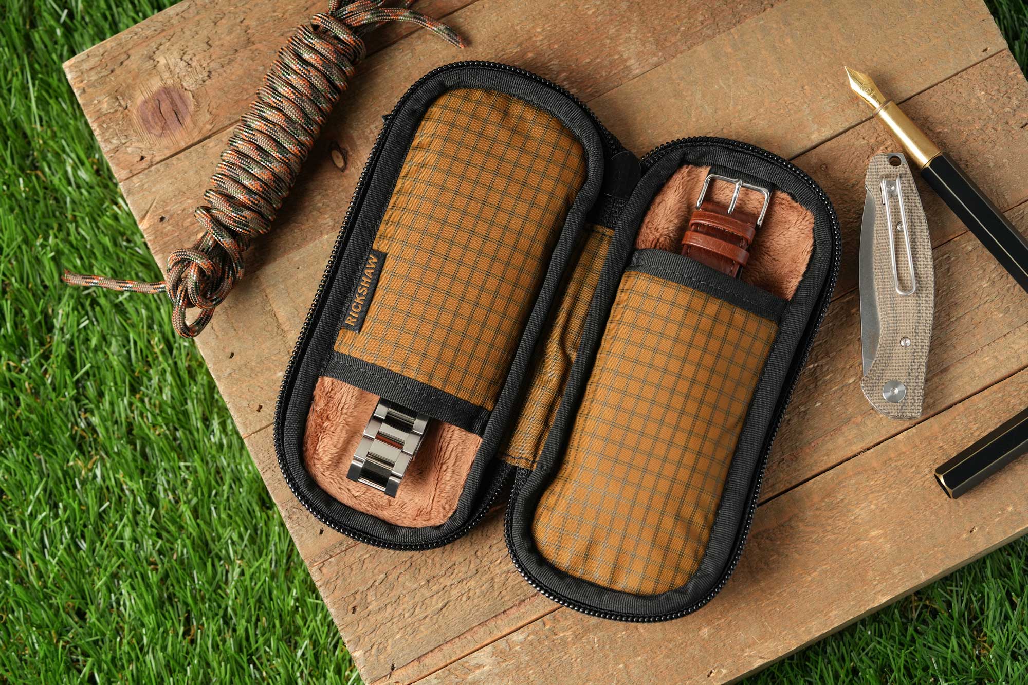 The TimeKeeper 2 Ultragrid Nylon wristwatch case is a great travel companion for watch collectors and enthusiasts. Made from scratch in Rickshaw's San Francisco factory and proudly bearing the "Made in USA" label, the TimeKeeper 2 features two pockets, each accommodating watches up to 45mm in diameter. The super-soft Royal Plush lining prevents scratches, while foam padding on both exterior faces offers excellent impact protection.  To ensure that watch crystals are not facing one another, simply insert the watches at opposite ends.