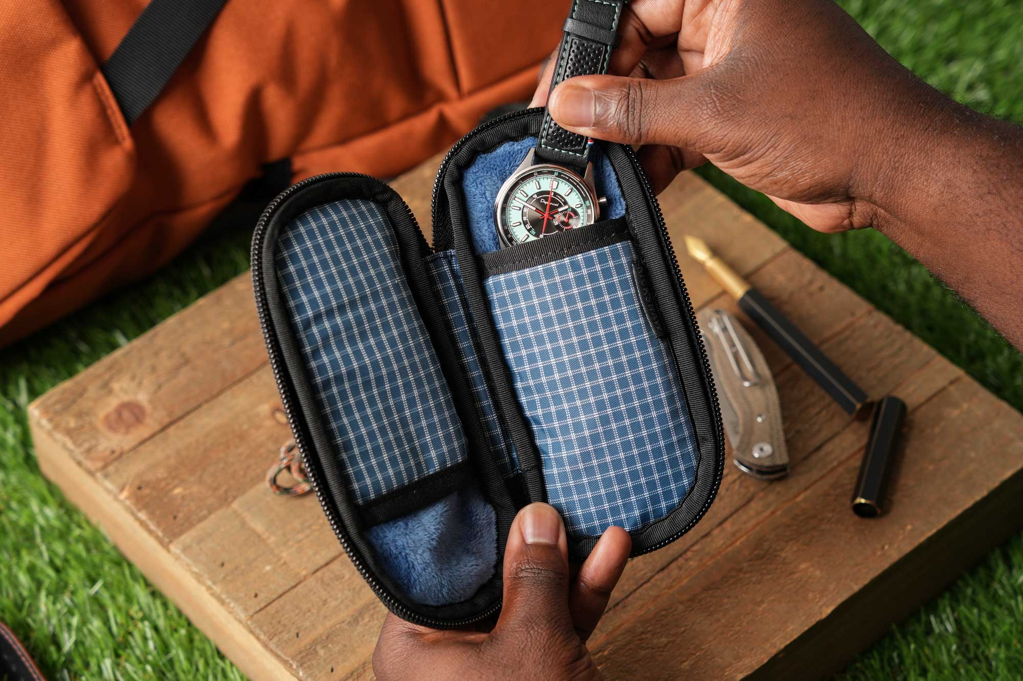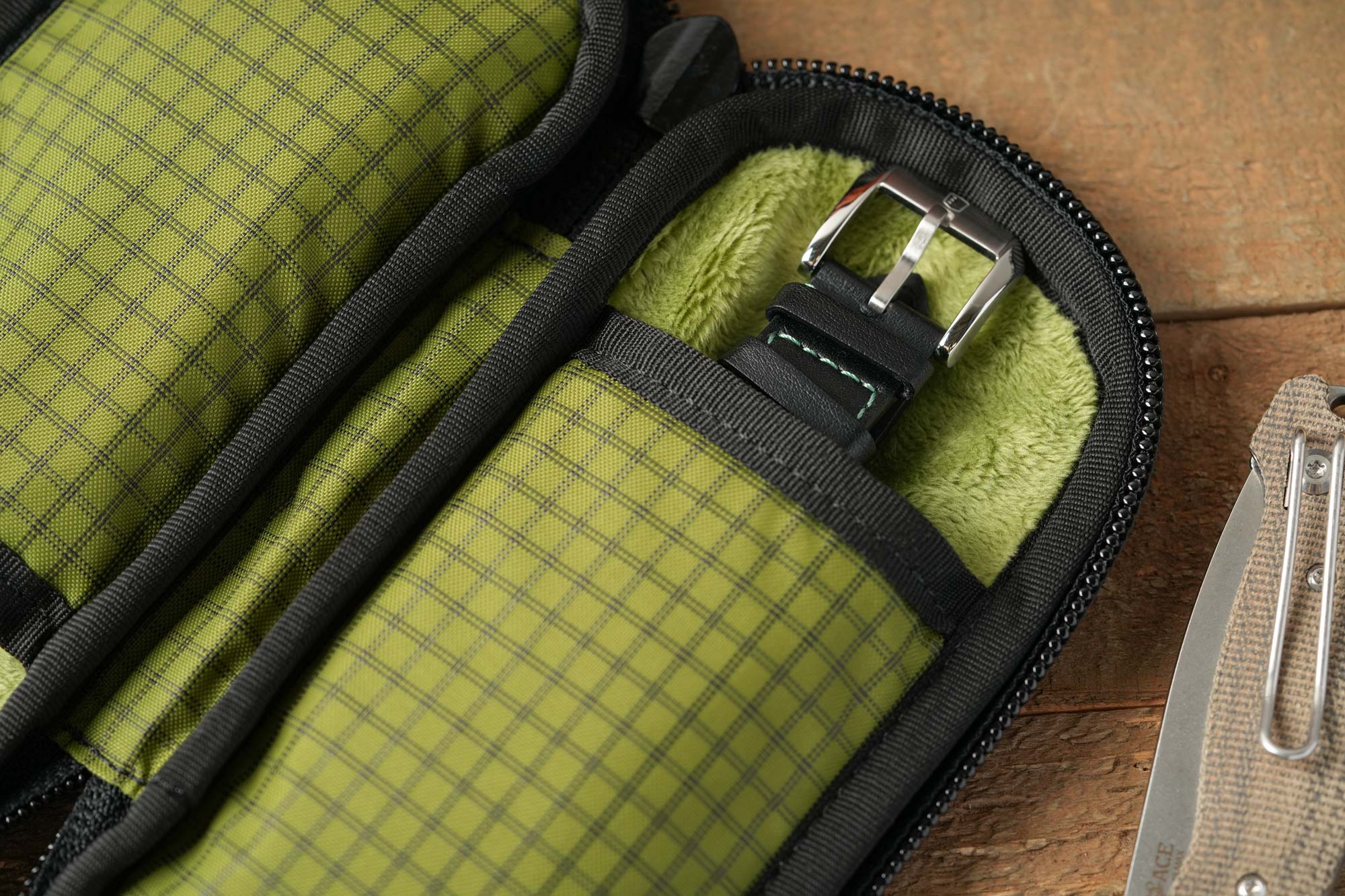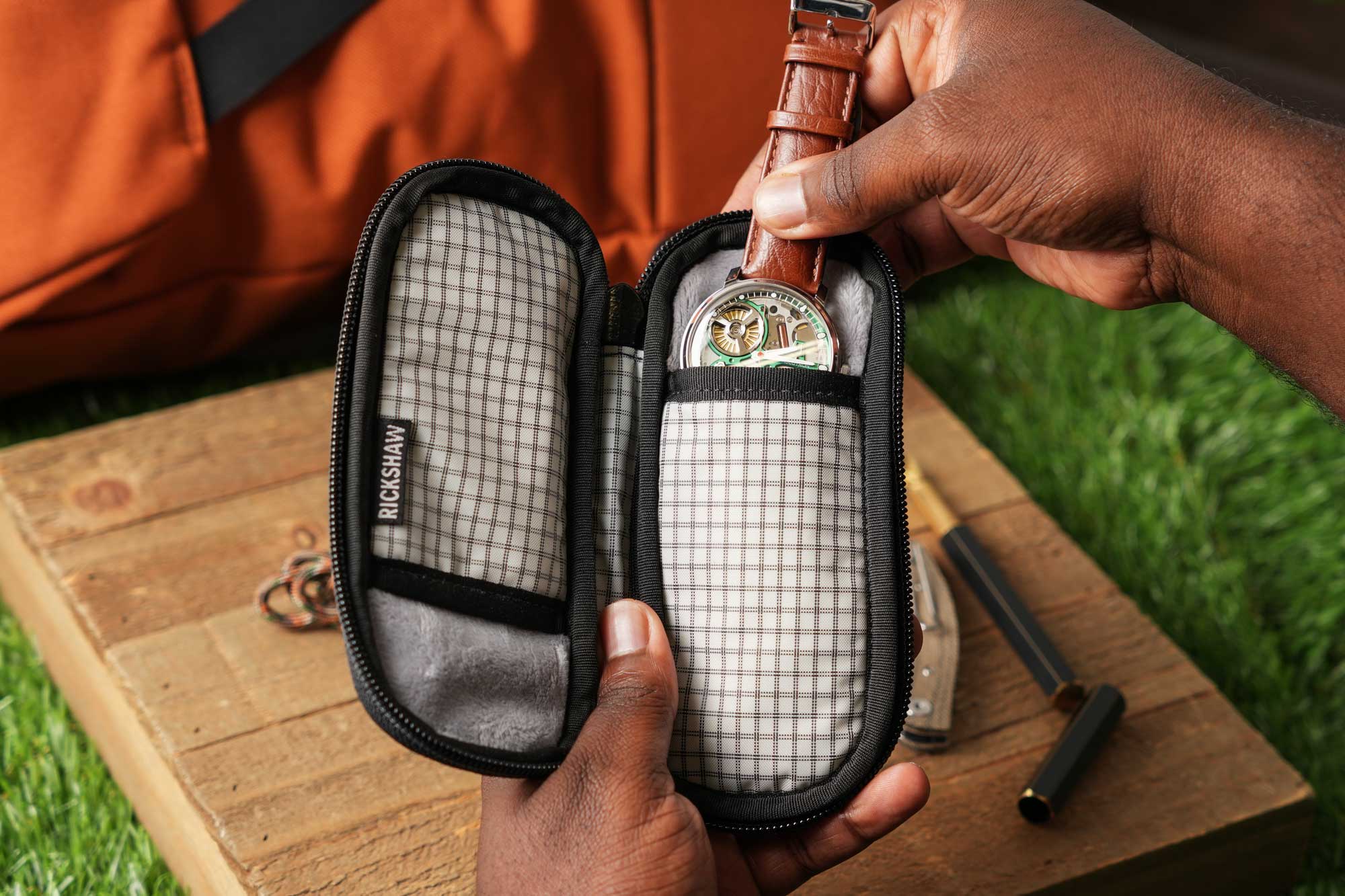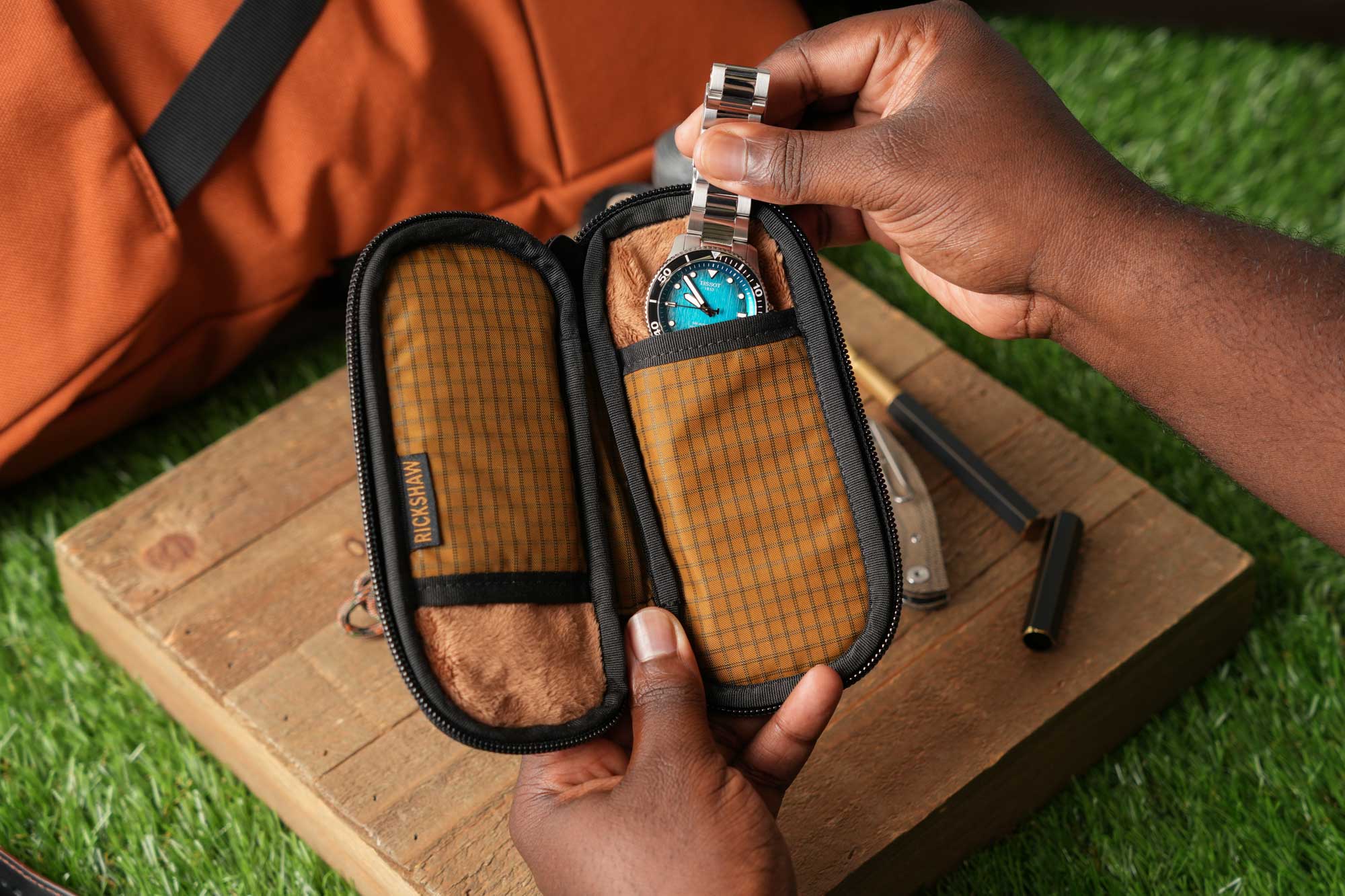 The TimeKeeper 2 Ultragrid Nylon wristwatch case is a great travel companion for watch collectors and enthusiasts. Made from scratch in Rickshaw's San Francisco factory and proudly bearing the "Made in USA" label, the TimeKeeper 2 features two pockets, each accommodating watches up to 45mm in diameter. The super-soft Royal Plush lining prevents scratches, while foam padding on both exterior faces offers excellent impact protection.  To ensure that watch crystals are not facing one another, simply insert the watches at opposite ends.