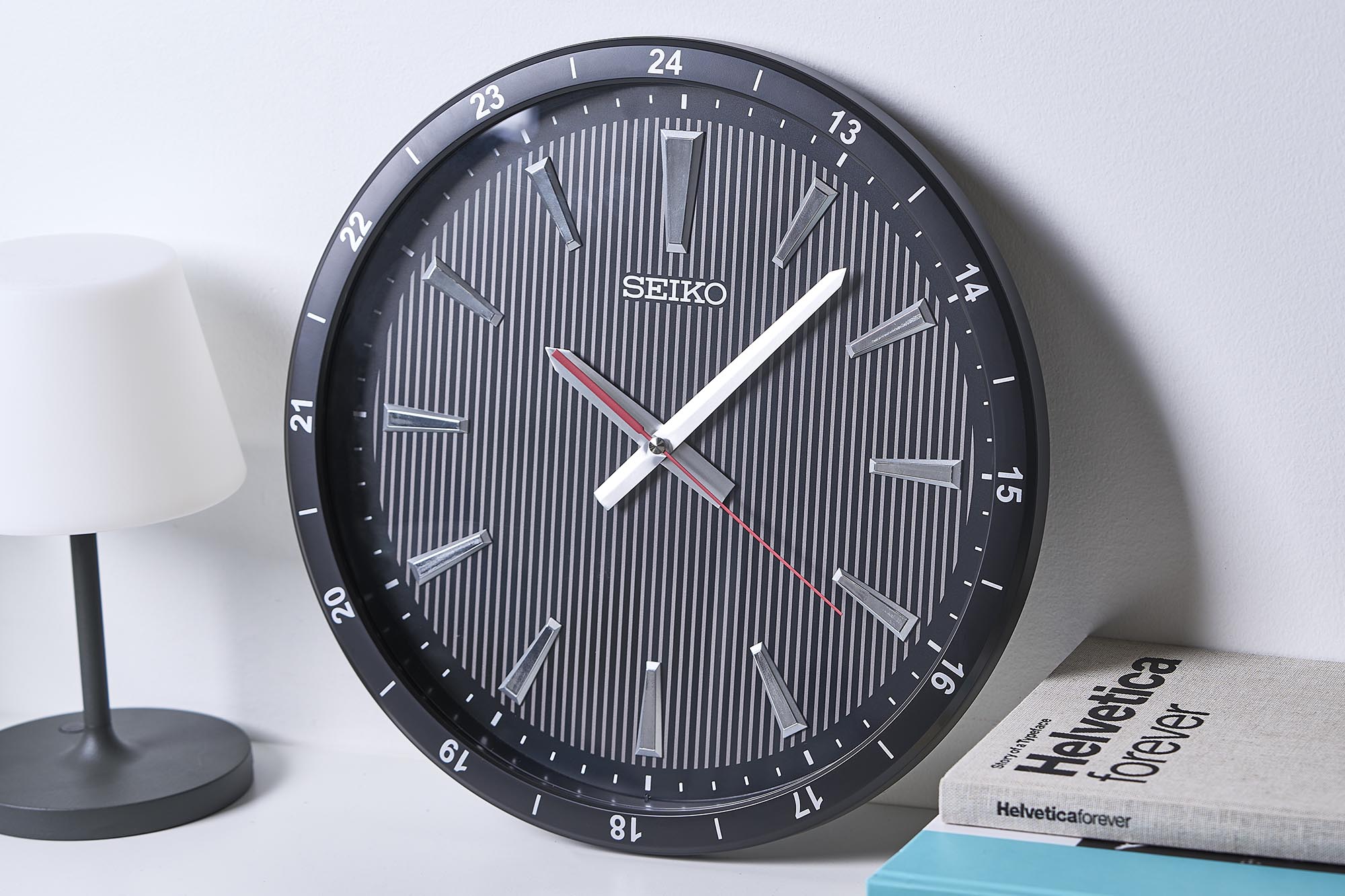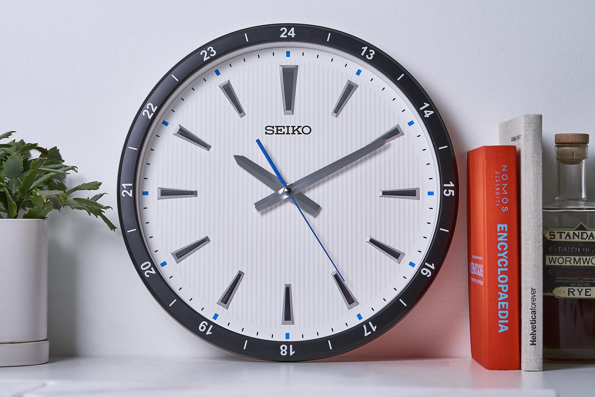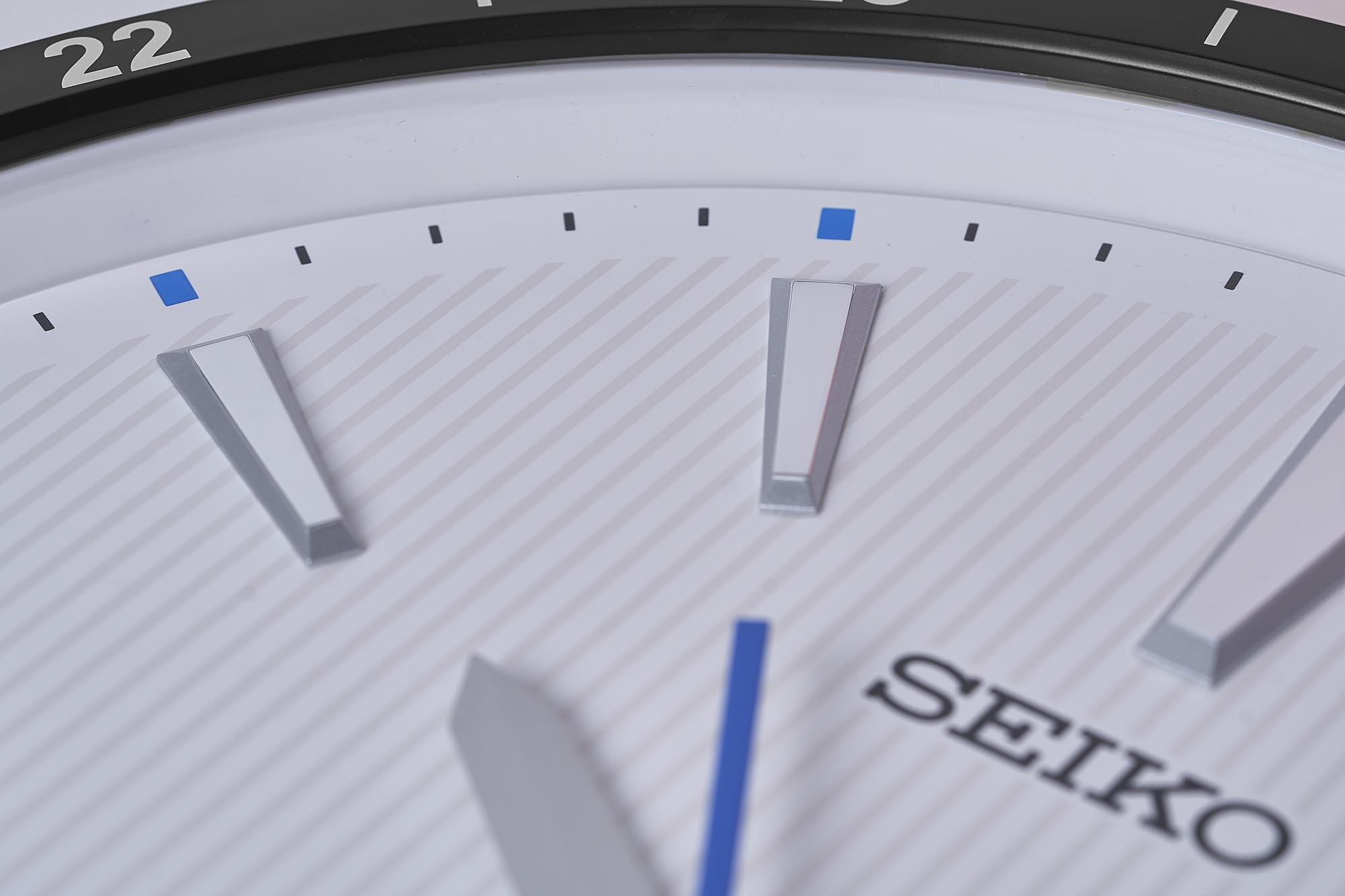 The QXA802J, QXA802K, and QXA802L clocks have white, black, and dark blue dials, respectively. A closer look reveals thoughtful and tasteful details like the subtle vertical linen texture in the center of the dial. The outer track of the clock is smooth and features minute markers with accents on each five-minute counter. The hour markers are reminiscent of elegant Seiko watches with their faceted edges, and the hands match that style. On the outer edge of the clock is a 24-hour bezel, an homage to Seiko sport watches.