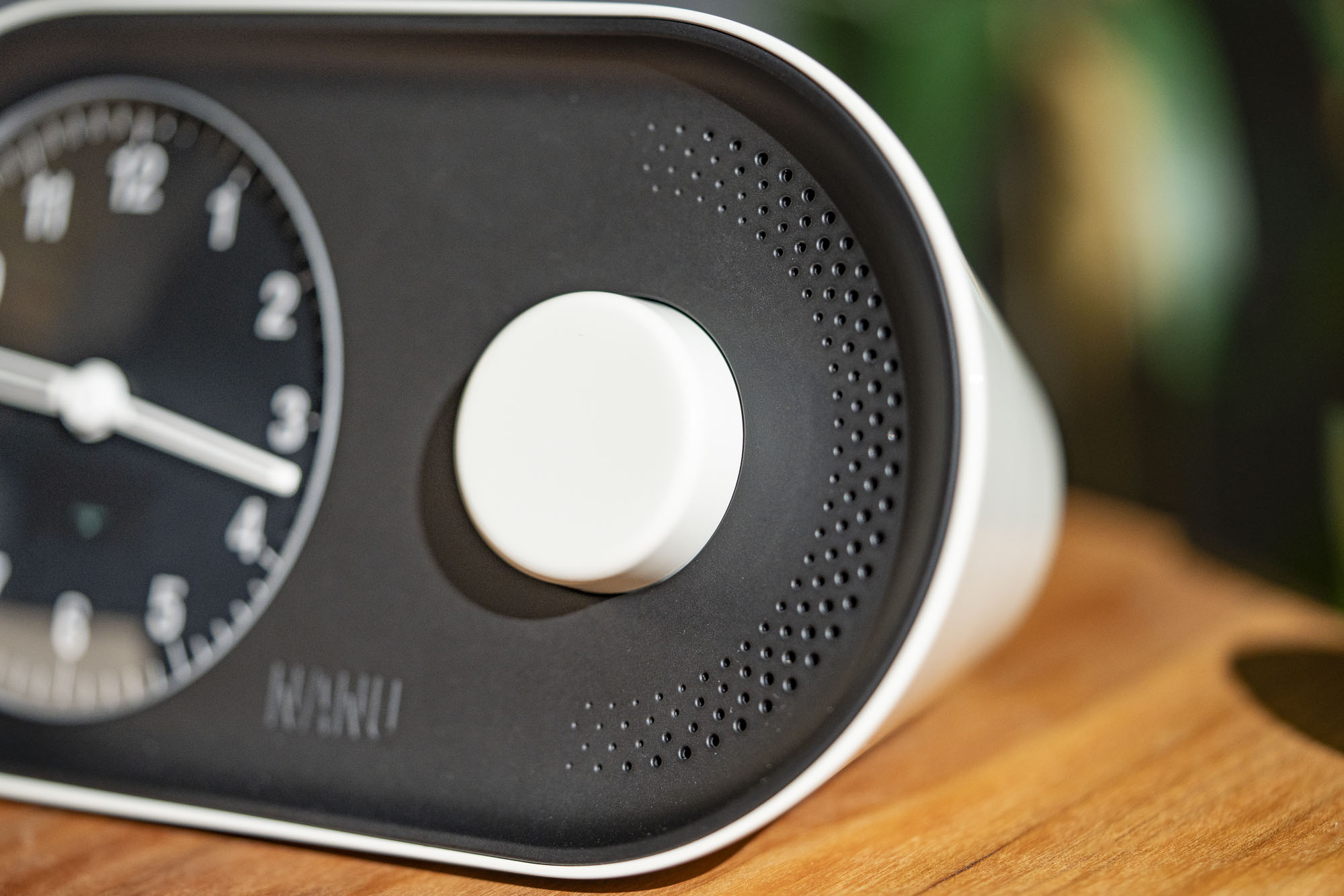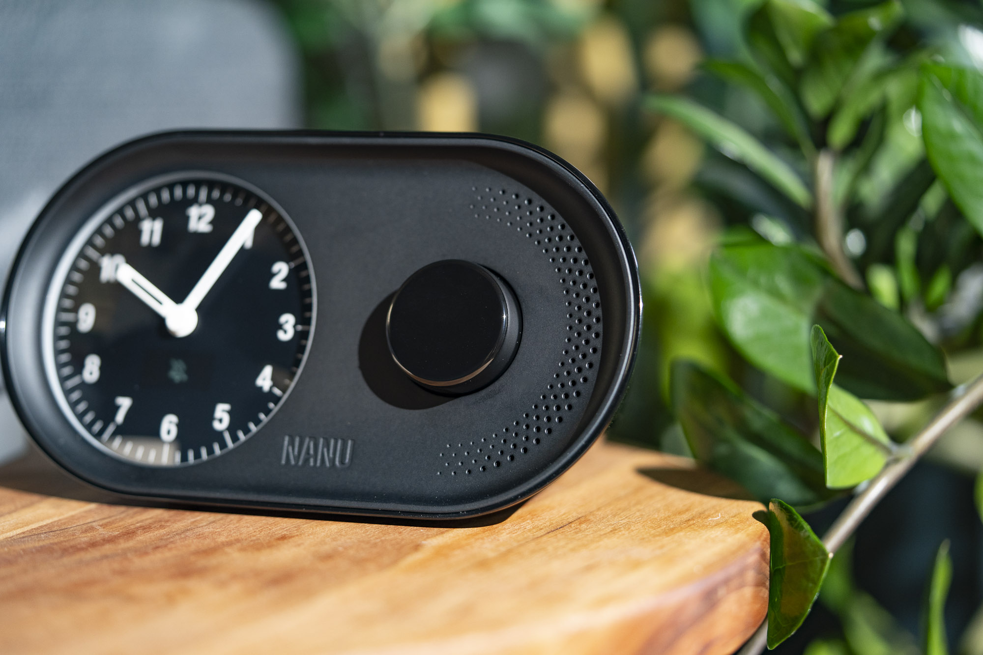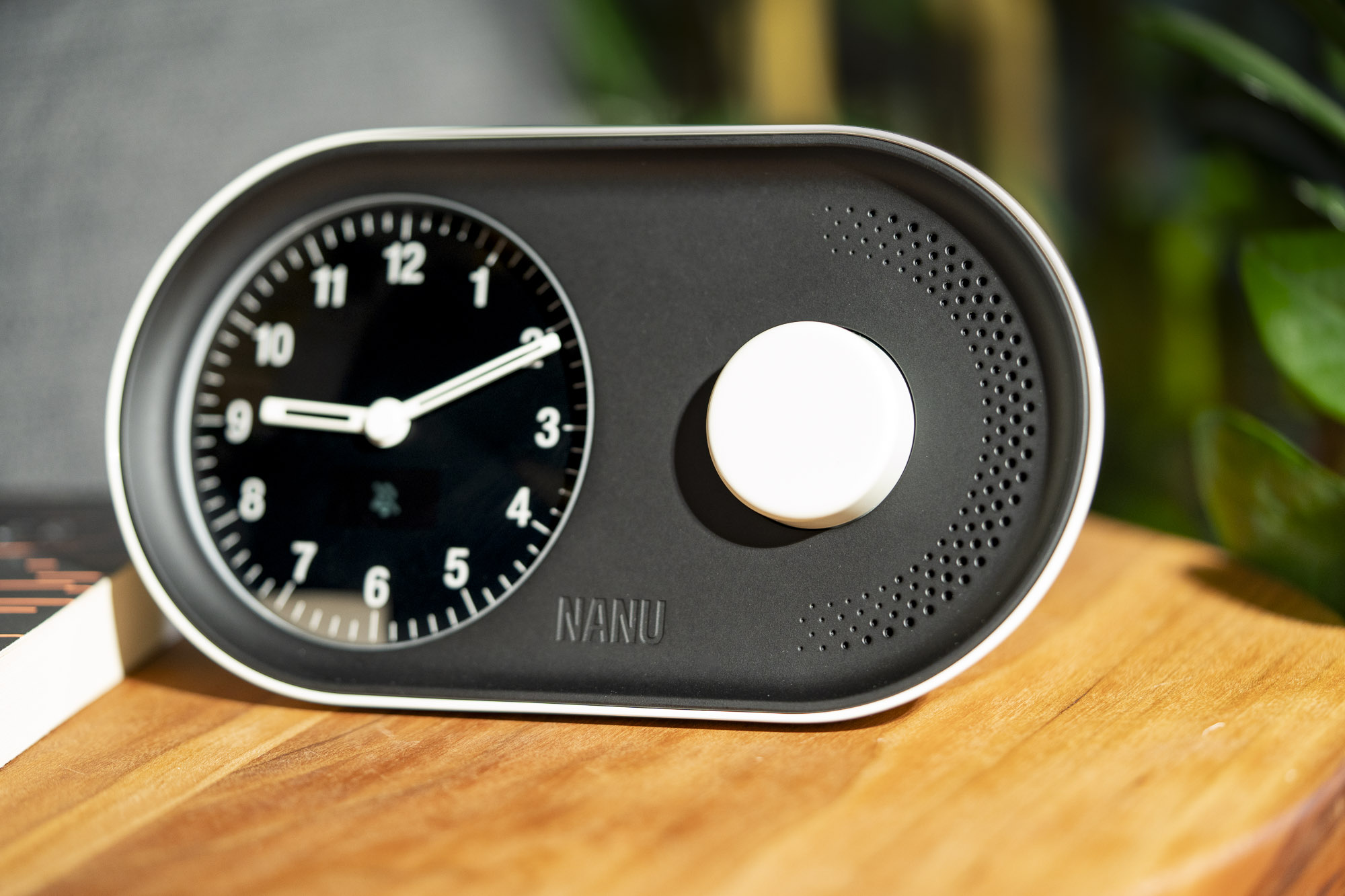 A modern desk clock with a mechanical chime