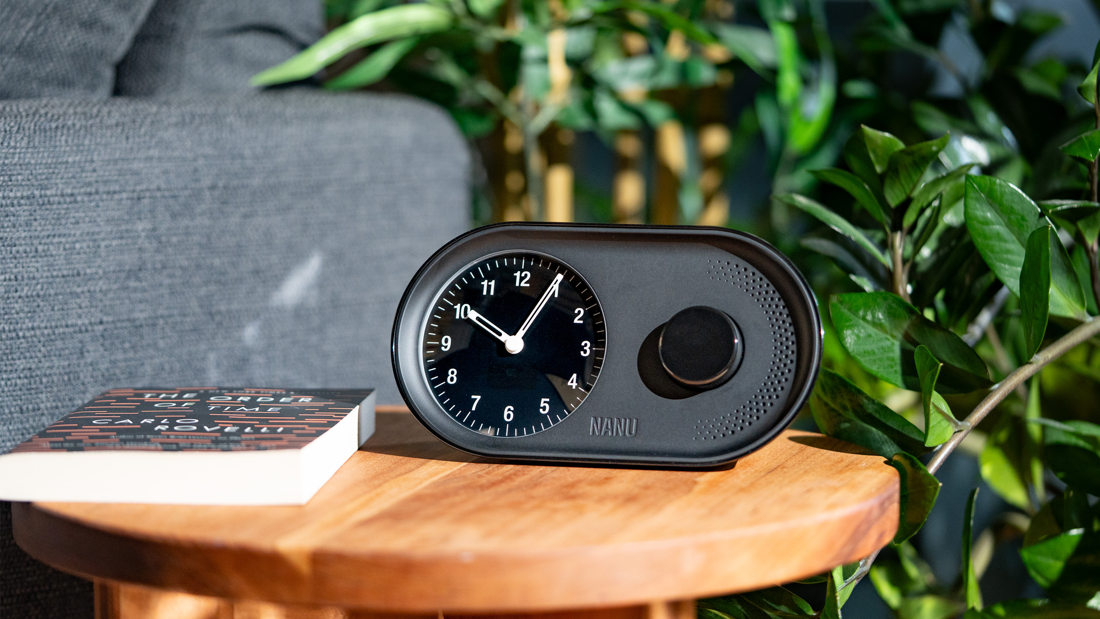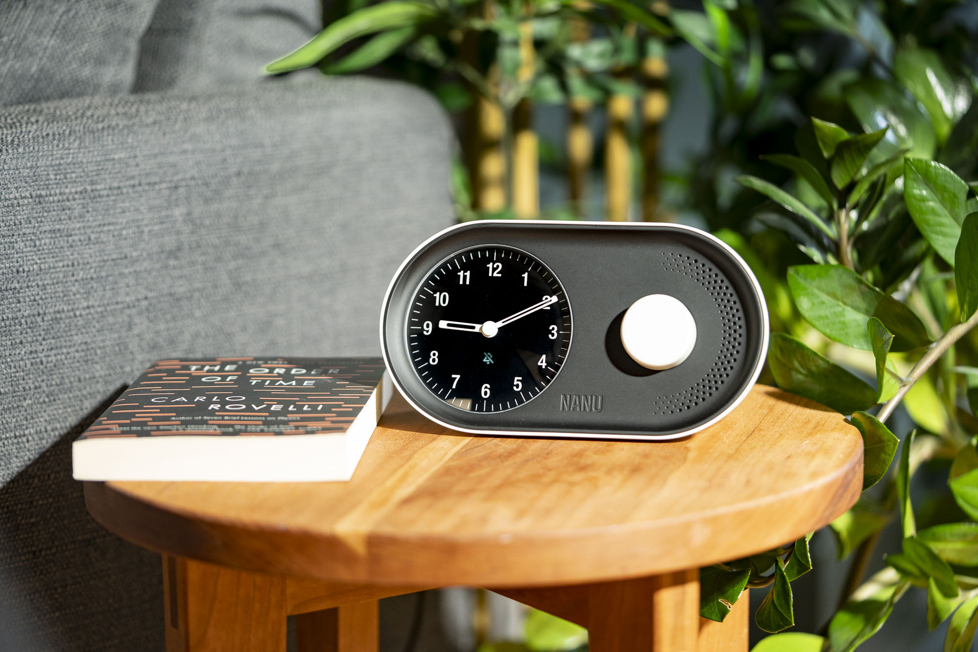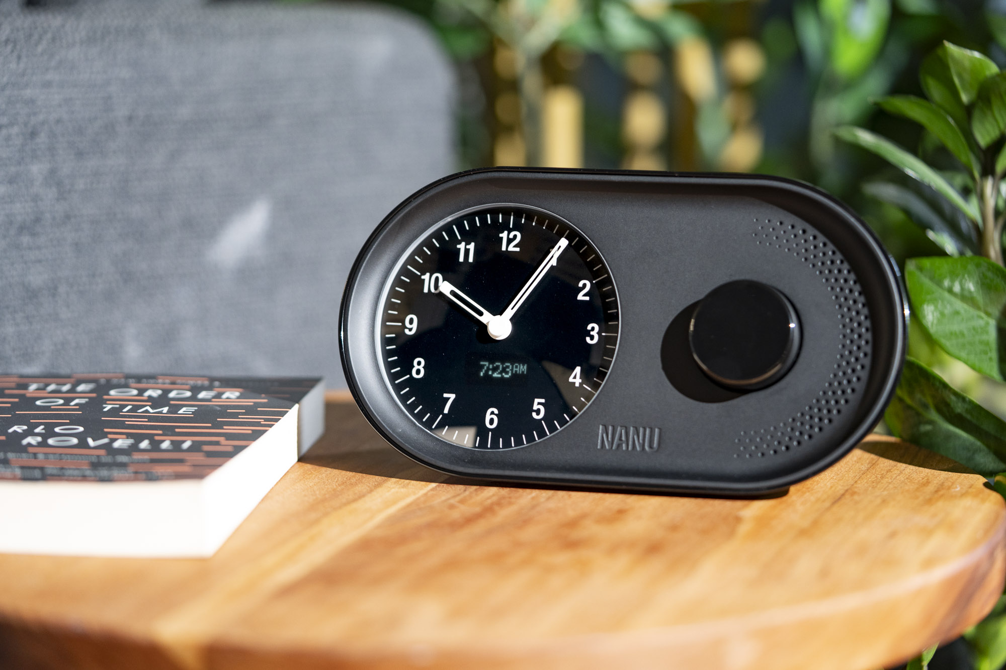 A modern desk clock with a mechanical chime
