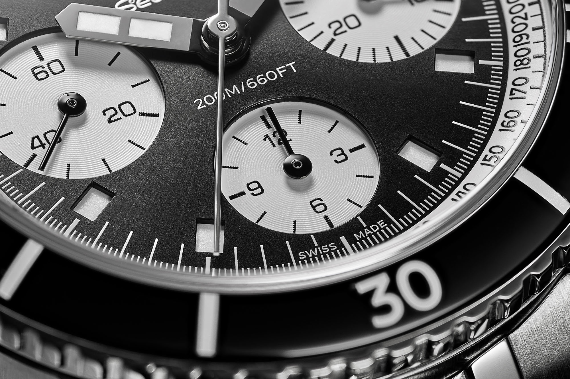 Originally launched in the late 60s, the Zodiac Sea-Chron was introduced as an evolution of the iconic Sea Wolf design. Today’s reissue features a 20-minute elapsed timing bezel and added chronograph function with a tachymeter inscribed around the edge of the dial, bringing an entirely new level of engagement, durability and utility to the newly minted Chronograph platform.