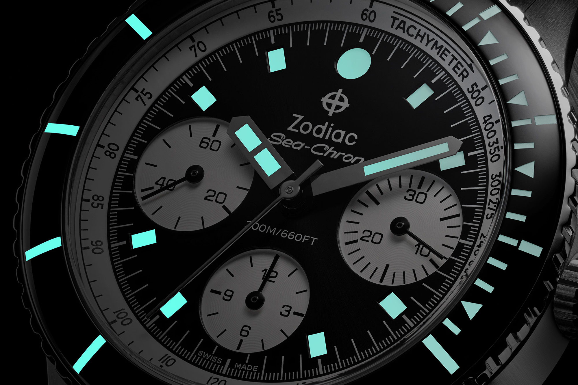 Whether you’re a sportsman, engineer, technician, physician, or in the military, the Zodiac Sea-Chron is the perfect watch for anyone who works or plays in the three dimensions of time, speed, and distance. The Zodiac Sea-Chron is visually distinguished by its three sub-dials and two pushers, which start and stop the chronograph function without interfering with the watch’s basic time-telling functionality.. This limited-run timepiece also features Super-LumiNova hands and markers for unparalleled visibility and is complemented by Zodiac’s newest iteration of the classic 5-link stainless steel bracelet.