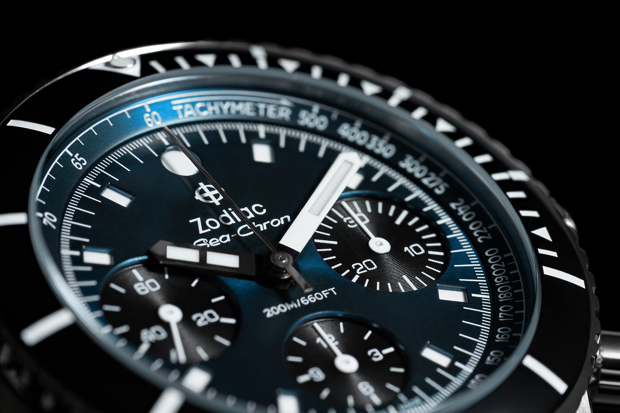 Whether you’re a sportsman, engineer, technician, physician, or in the military, the Zodiac Sea-Chron is the perfect watch for anyone who works or plays in the three dimensions of time, speed, and distance. The Zodiac Sea-Chron is visually distinguished by its three sub-dials and two pushers, which start and stop the chronograph function without interfering with the watch’s basic time-telling functionality.. This limited-run timepiece also features Super-LumiNova hands and markers for unparalleled visibility and is complemented by Zodiac’s newest iteration of the classic 5-link stainless steel bracelet.