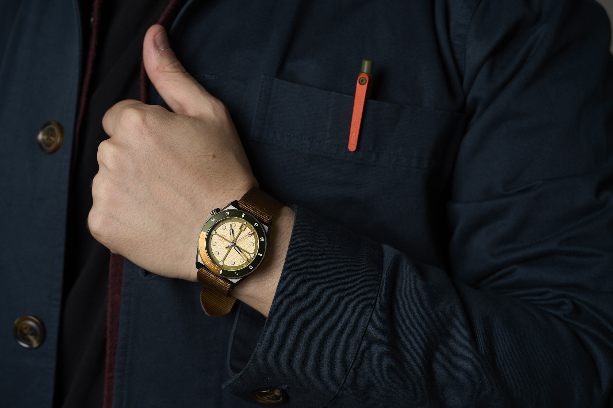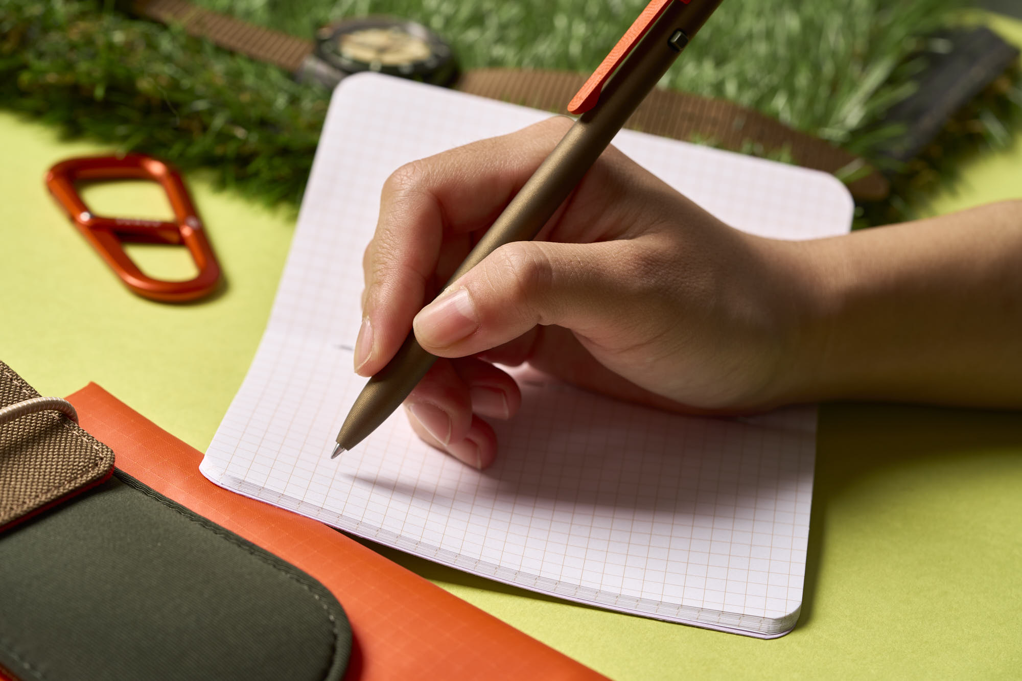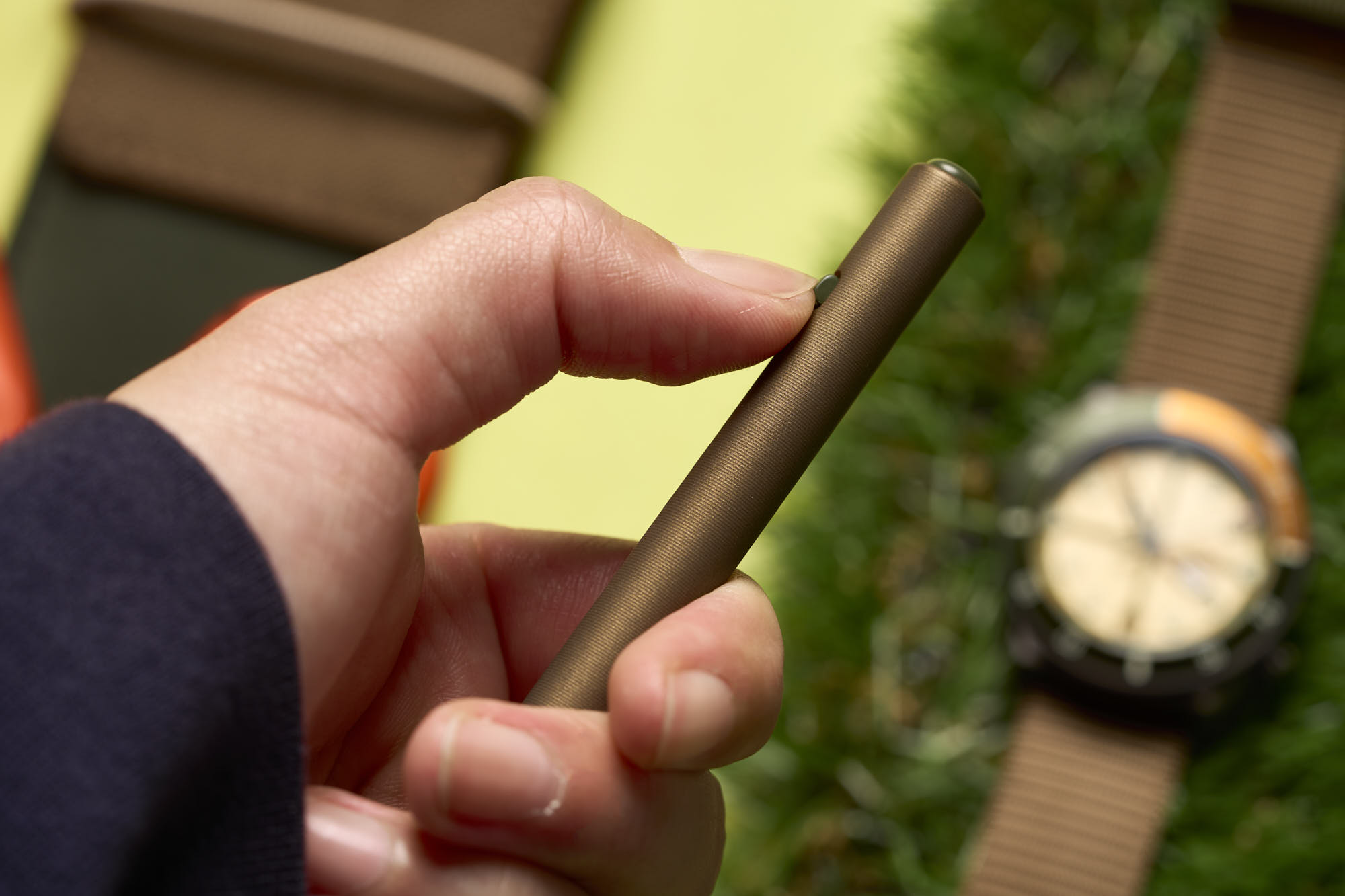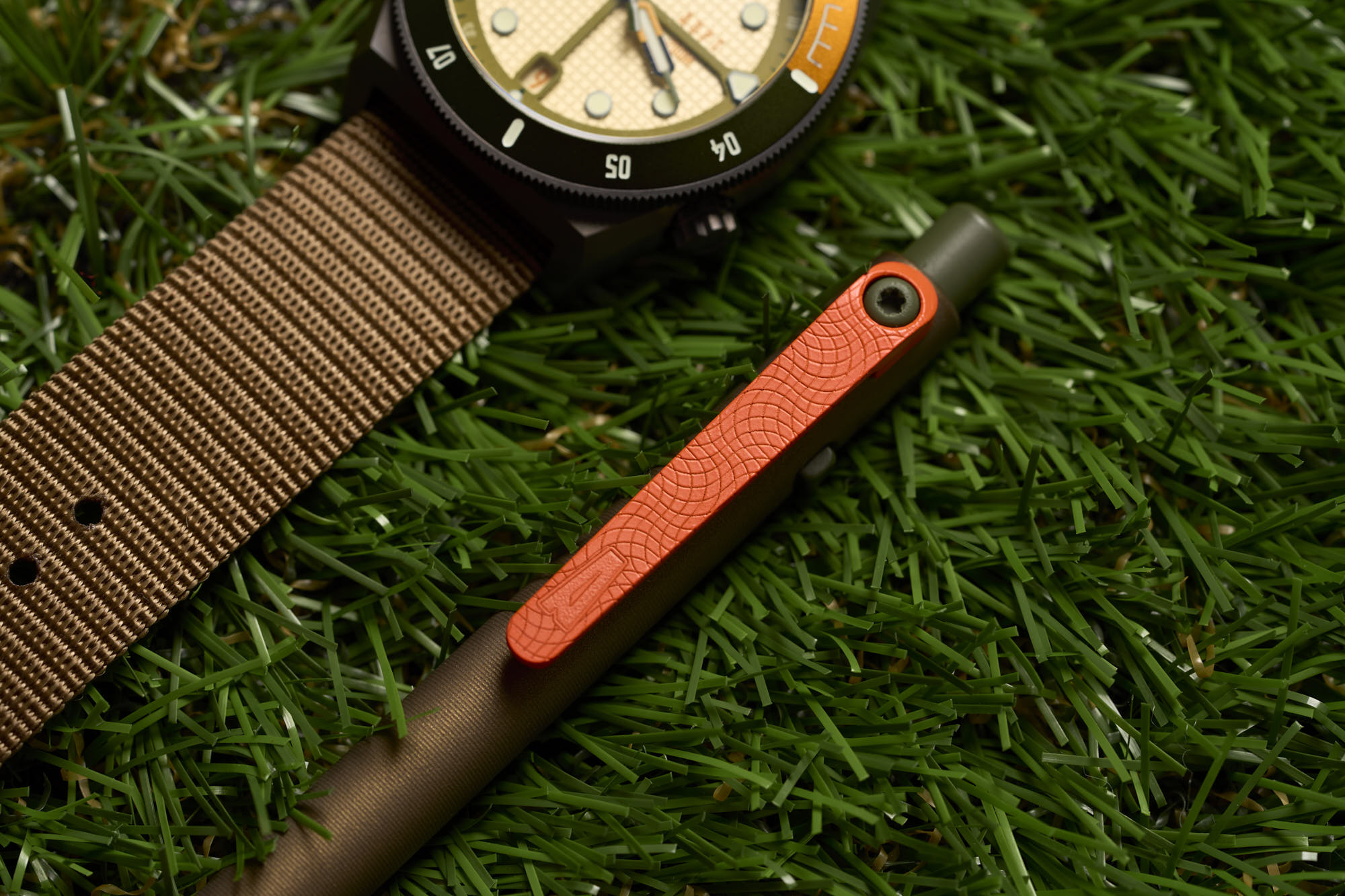 Tactile Turn makes some really impressive pens, all designed and machined down to the screws and springs in America. Since ADPT (“adapt” All Day, Purpose, and Terrain) got its start by manufacturing the only US-Made nylon watch straps, teaming up with Tactile Turn on a custom, colorful, pen seemed like a natural combination. The Tactile Turn x ADPT Harvest Slim Side Click is cerakoted (a baked-on ceramic finish) in a combination of olive green, coyote brown, and flame orange, matching perfectly with our other ADPT gear. The green is a deep, muted earthy tone and is found on the pusher, side click, and clip screw, while the coyote brown shaft has a subtle metallic luster. The matte flame orange clip stands out, making it easy to find the pen on your desk, and adds an accent to your pocket when clipped on.