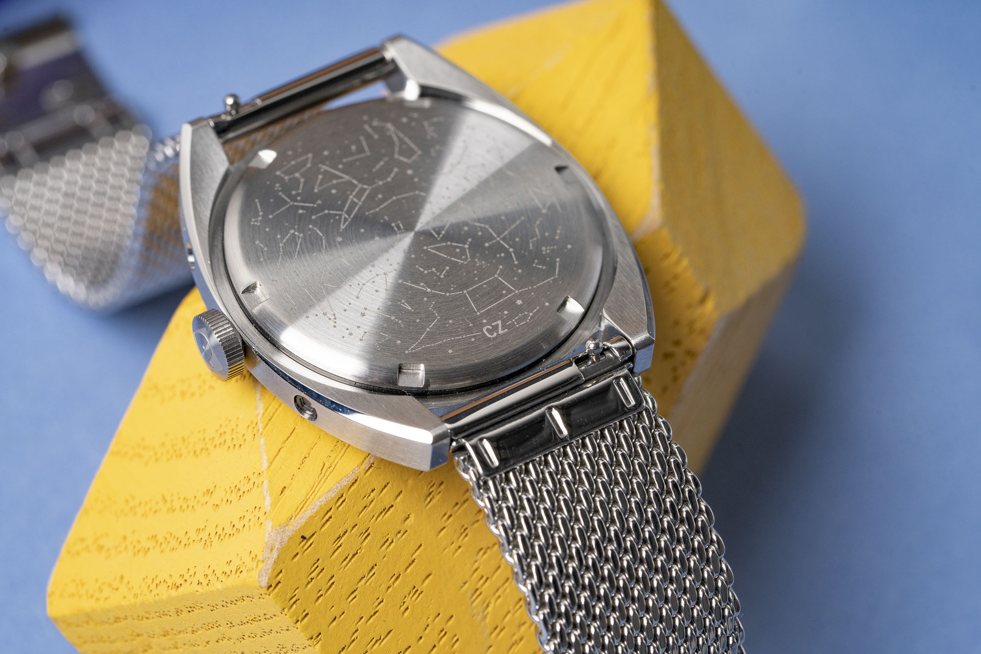 Maintaining the 35mm case crafted from 316L stainless steel, the Zapata Modul reserves it's key point of differentiation in the dial. It features a gloss lacquer finish over a sunburst engraving, creating a dynamic texture that shifts with light. Star-shaped markers and blurred numerals add a dreamlike quality to the design, capturing the ethereal essence of Zapata's artwork.