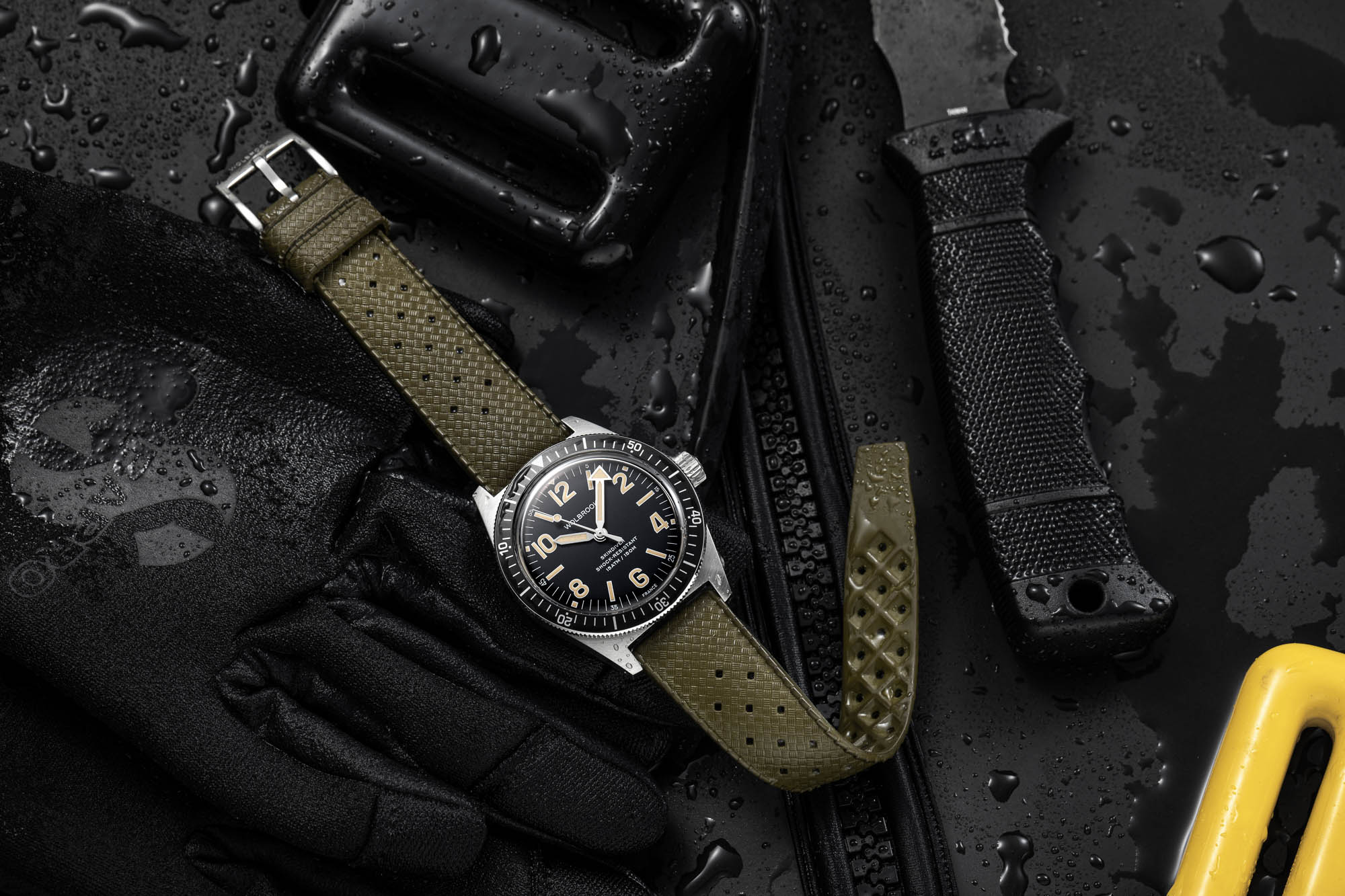 The watch features a 40mm stainless-steel case with drilled lugs, a 48mm lug-to-lug, and a slim 13mm profile, offering a balanced wrist presence suited for daily use or weekend adventure. A box-style sapphire crystal adds vintage charm while enhancing durability, and the matte black dial provides crisp contrast against either the aged-tone or green Super-LumiNova indices. With 150m water resistance, a screw-down crown, and the option of a Tropic-style rubber strap or stainless-steel beads-of-rice bracelet, the Skindiver Automatic maintains true dive-tool capability without sacrificing comfort or versatility.