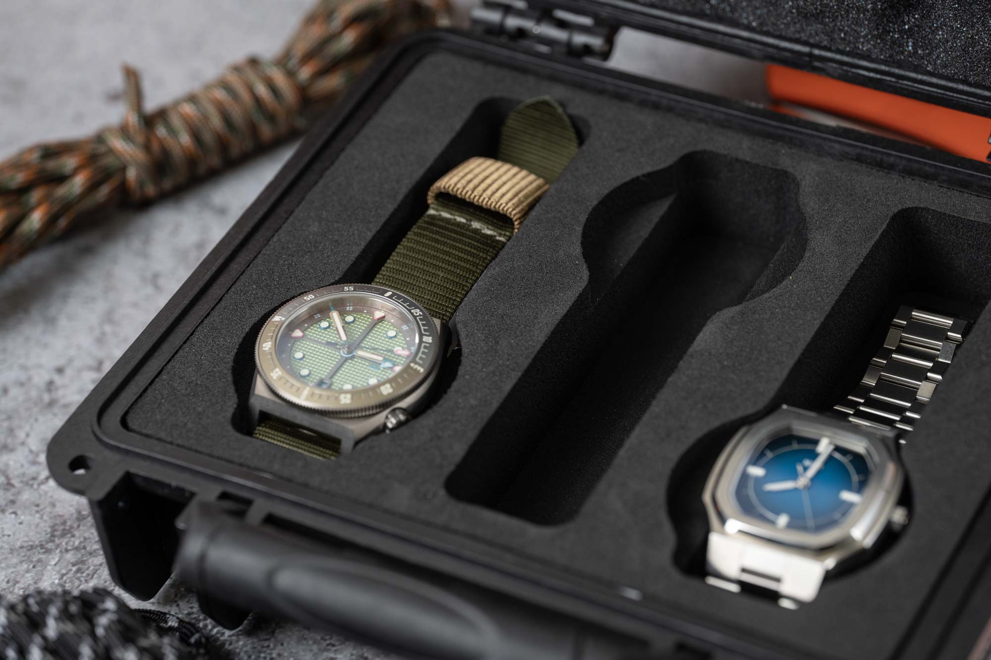 This new case allows you to travel with up to three watches in a well built, shock resistant container made of PP (polypropylene) Fibers and IP67 rated. Internally, the topside of your watches are protected by soft egg crate foam while the watches are secured by a custom EVA (Ethyl Vinyl Acetate) foam insert. Each cutout measures about 48mm across with room to accommodate a 26mm strap or bracelet.