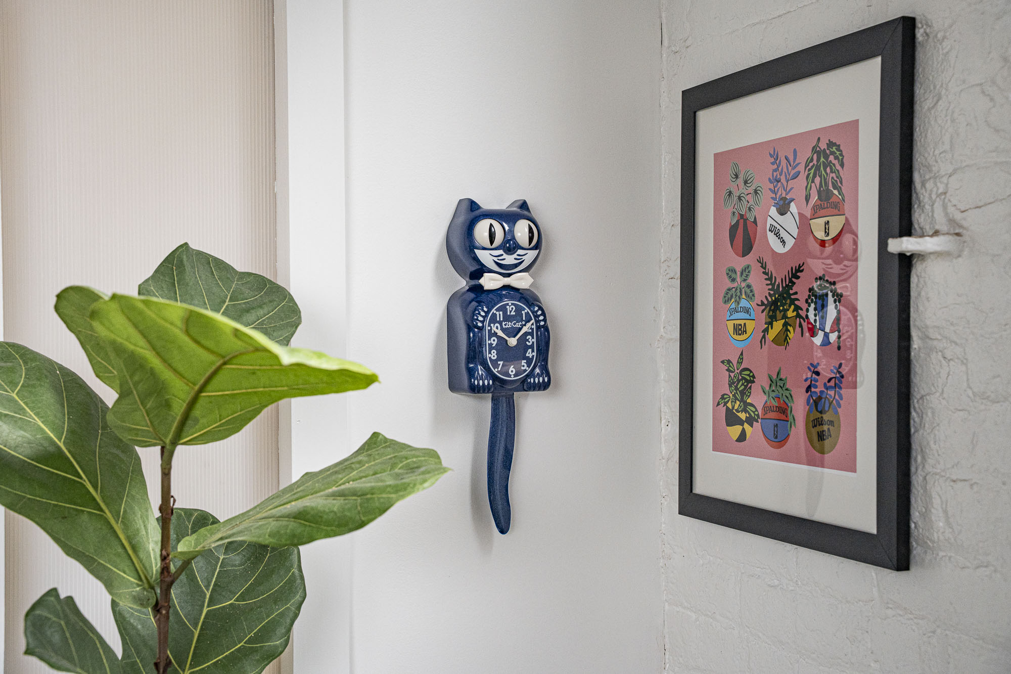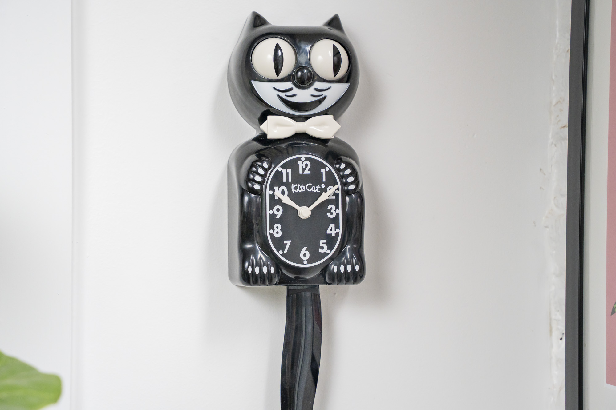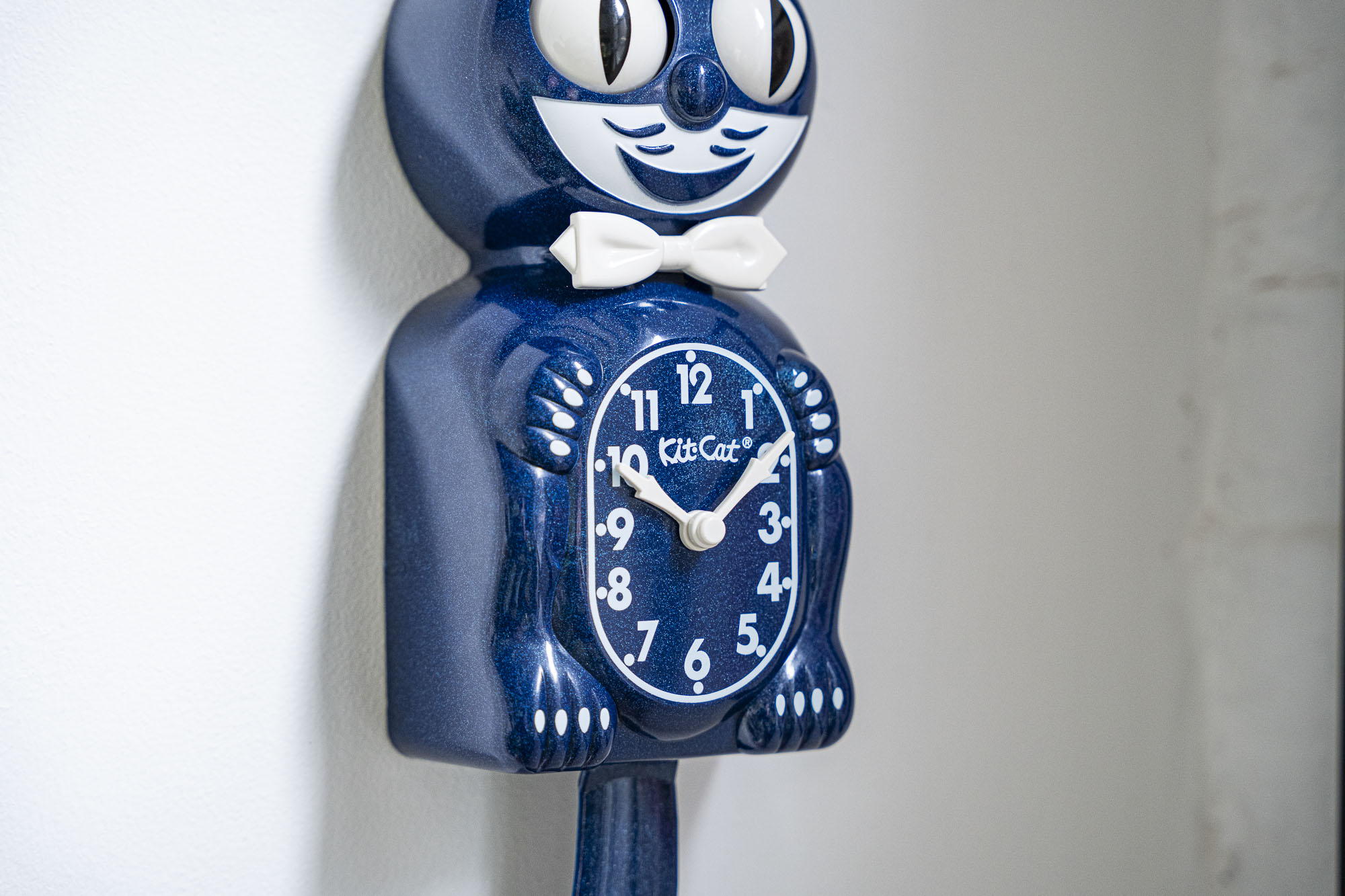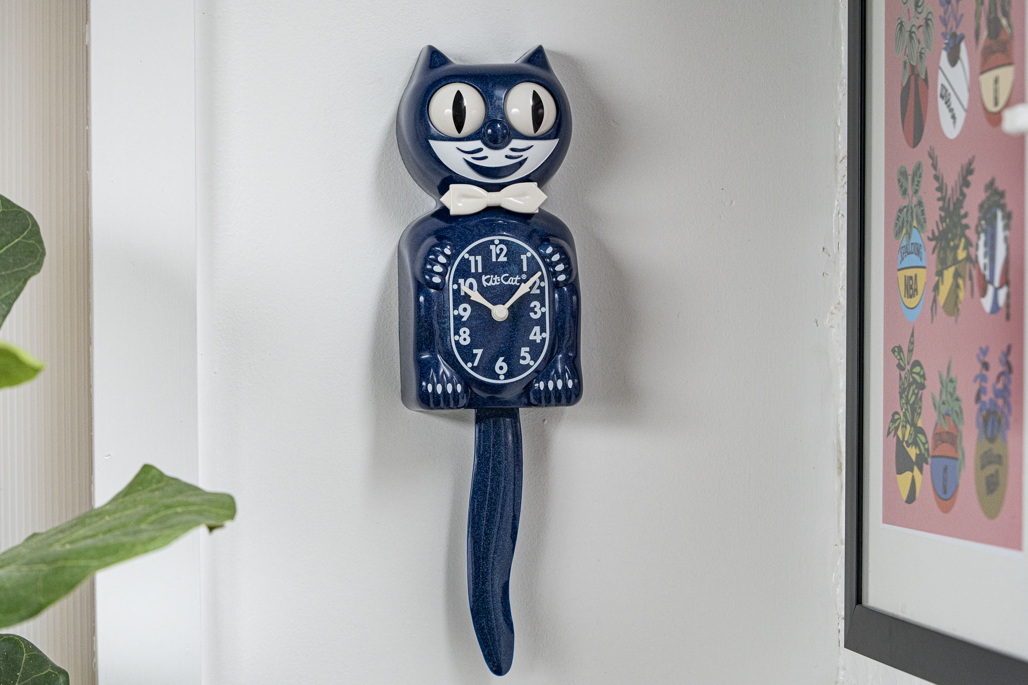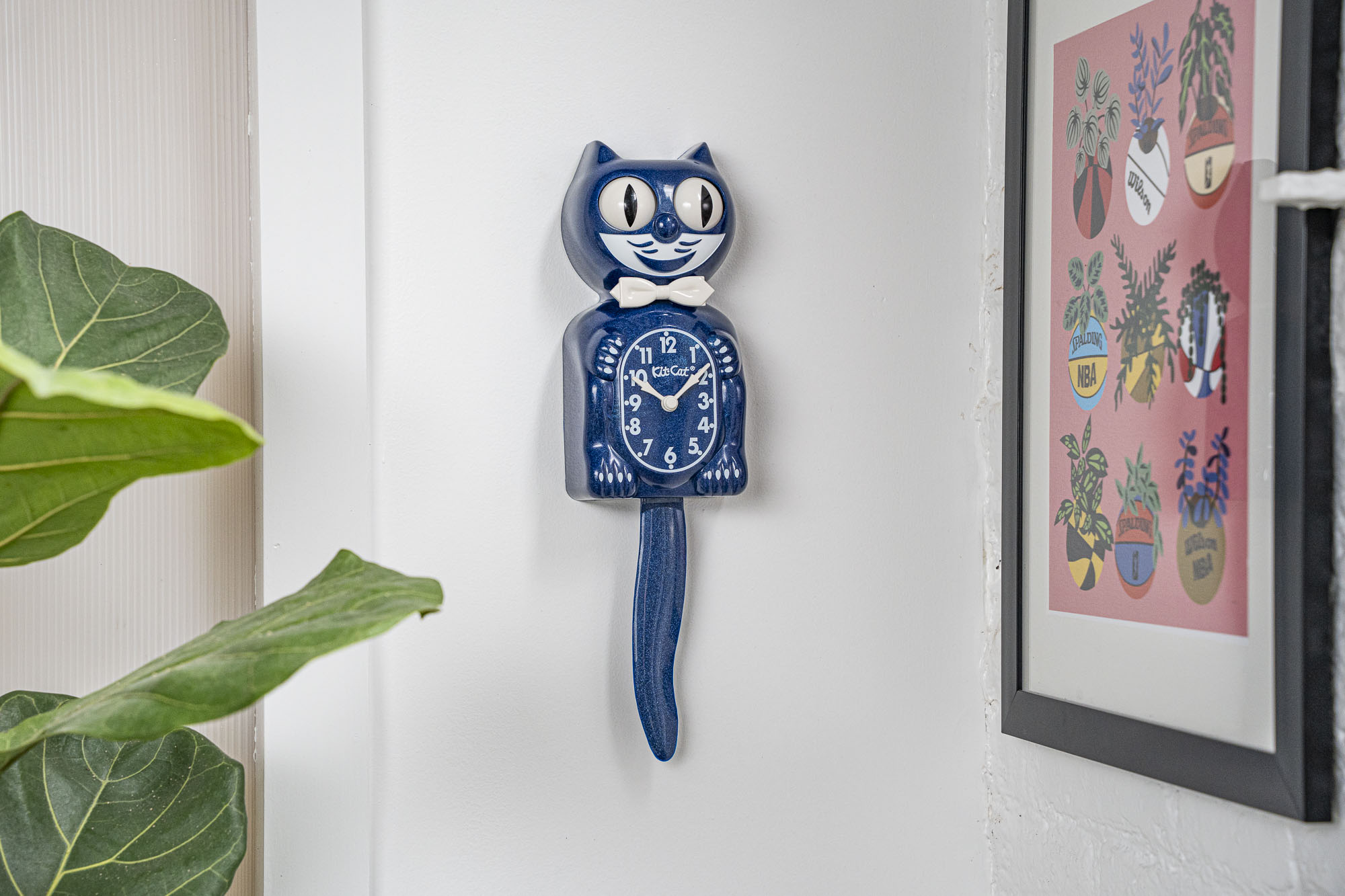Crafted with precision, the Kit-Cat Klock showcases a sleek black or blue plastic case that complements its playful demeanor. The clock operates on two C batteries (not included), ensuring reliable timekeeping without the need for winding or electrical cords.