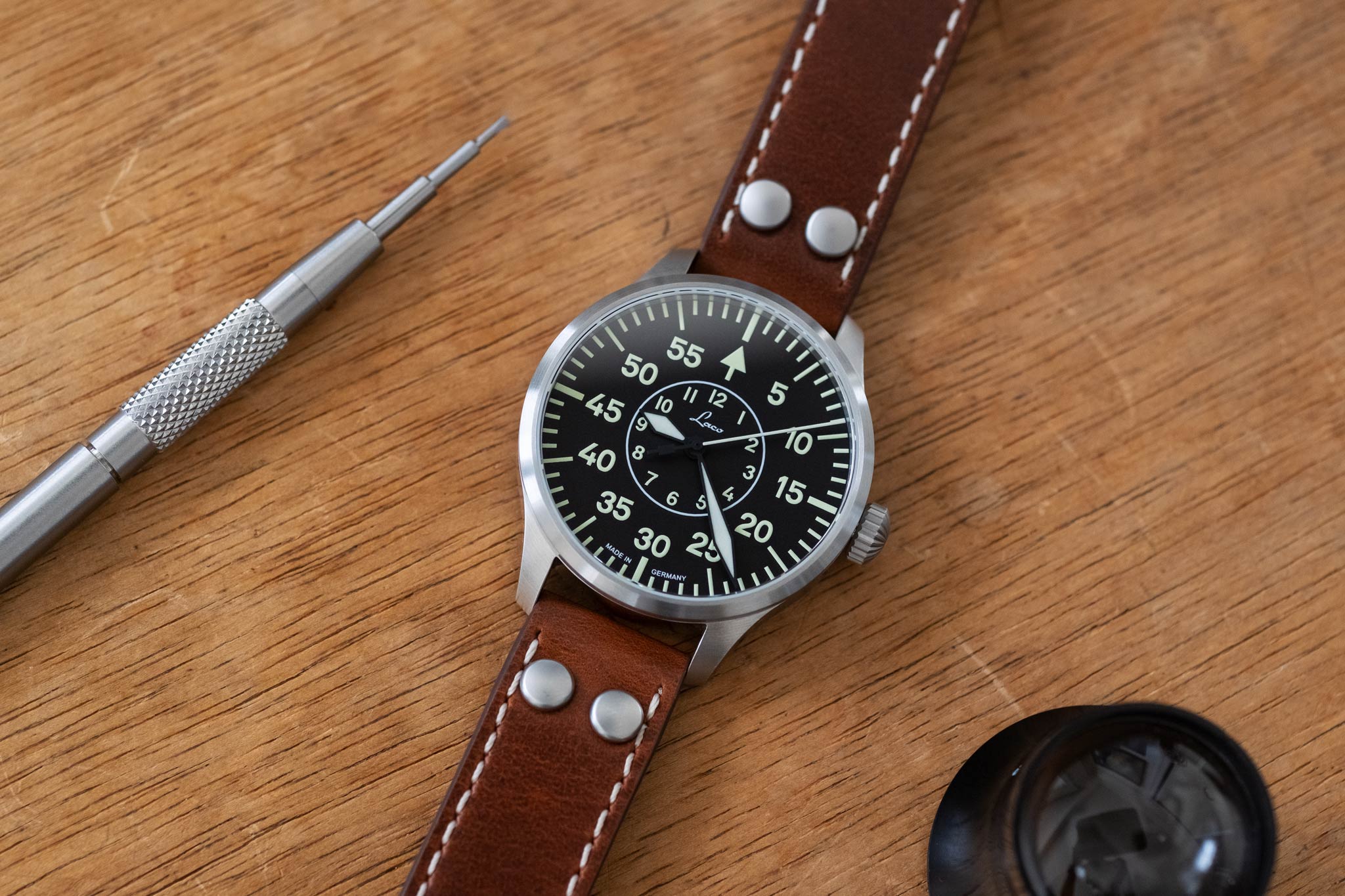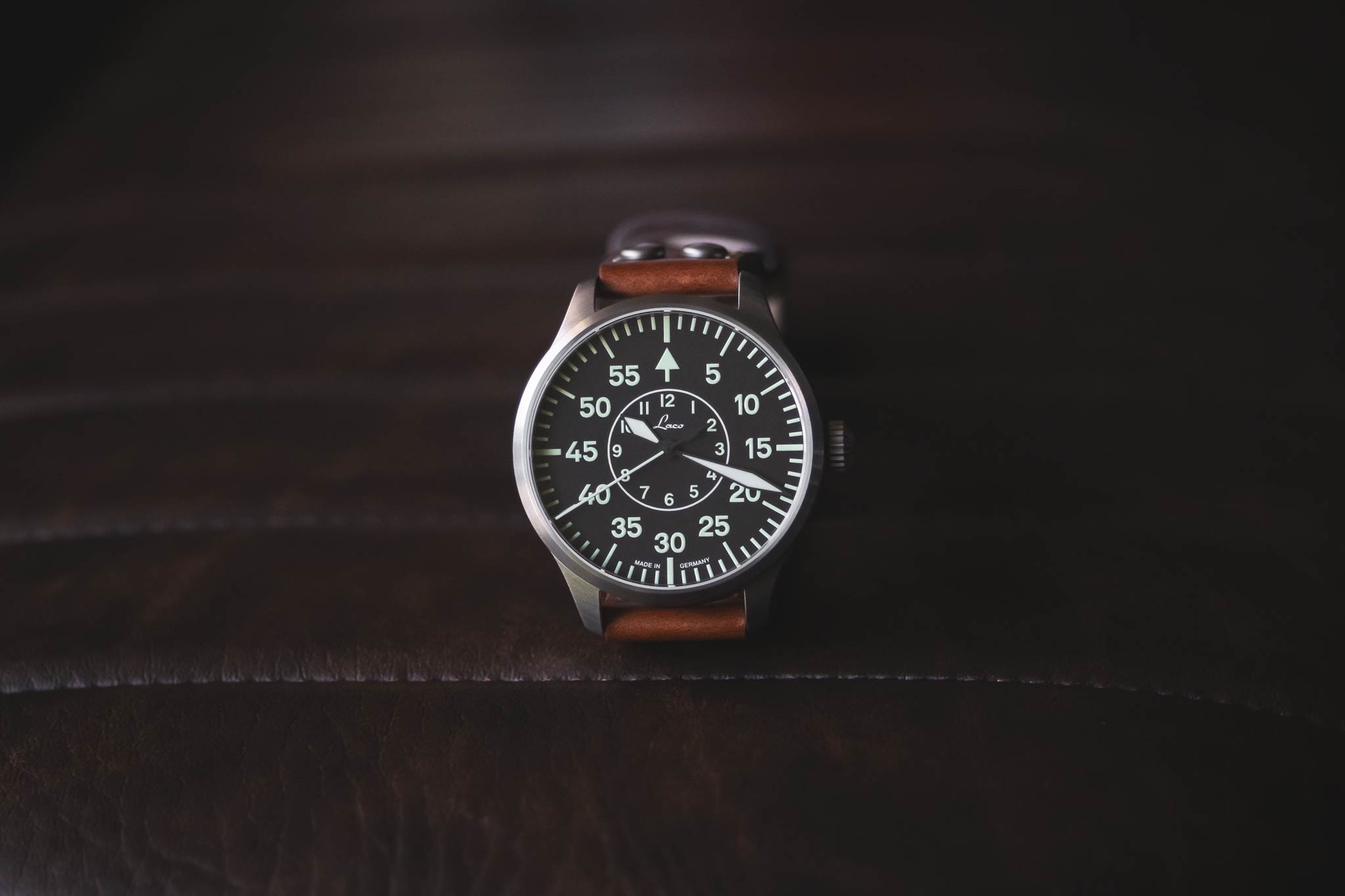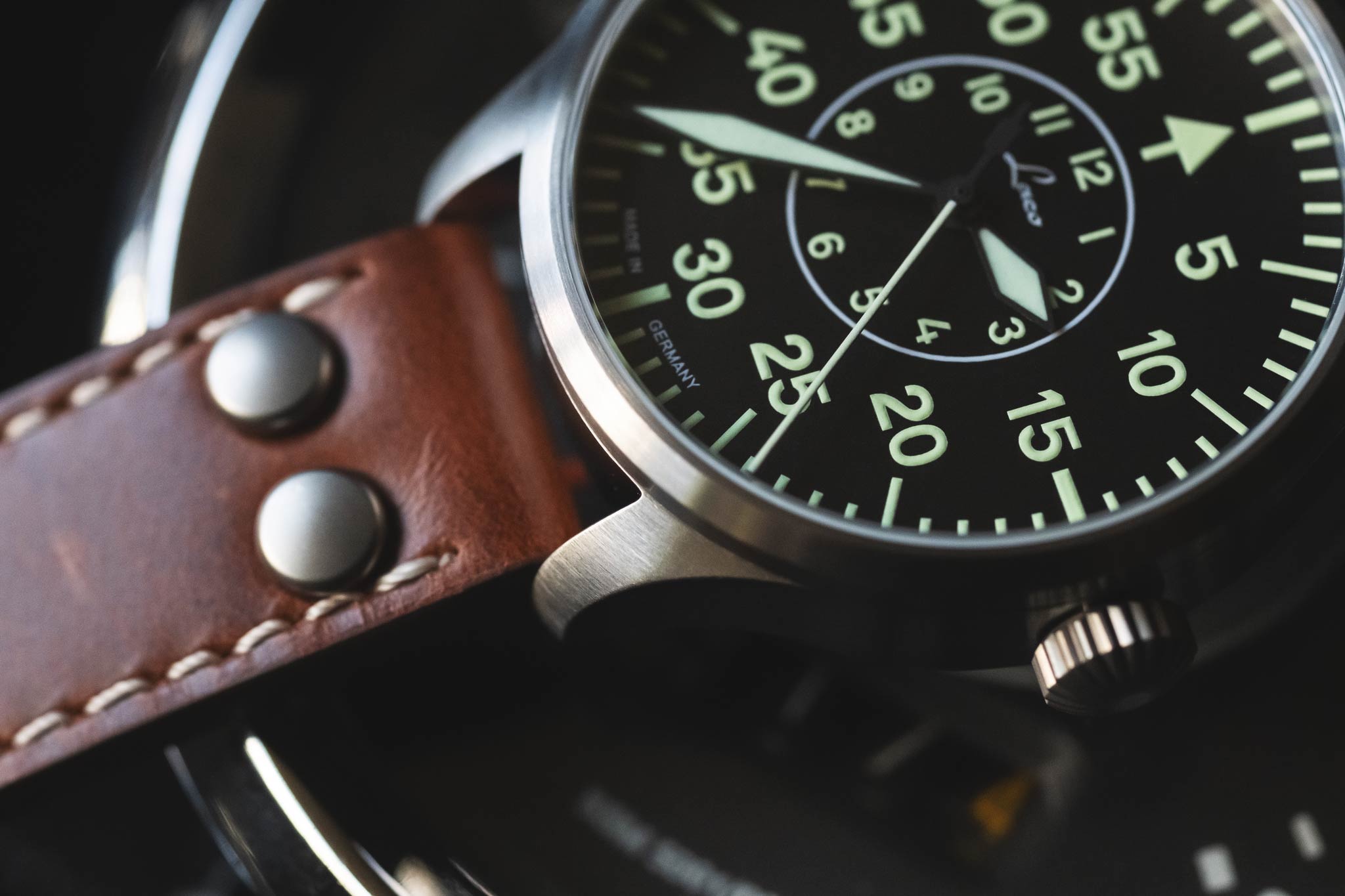 In the 1940's, only a handful of companies were selected to manufacture pilots watches for the German Airforce. Laco was one of these companies, and today they bring that heritage to their watches. You'll notice that their "original" series all feature "FL23883" engraved into the case, on the side opposite from the crown. This number indicates the watch was made to military specification for pilots.
