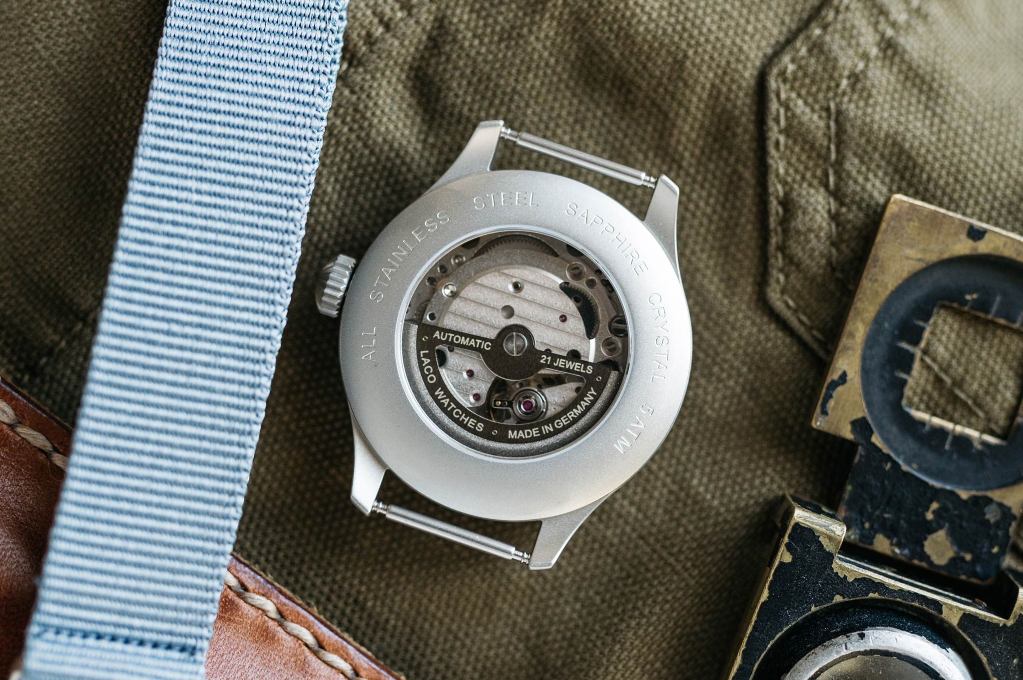 In the 1940's, only a handful of companies were selected to manufacture pilots watches for the German Airforce. Laco was one of these companies, and today they bring that heritage to their watches. You'll notice that their "original" series all feature "FL23883" engraved into the case, on the side opposite from the crown. This number indicates the watch was made to military specification for pilots.
