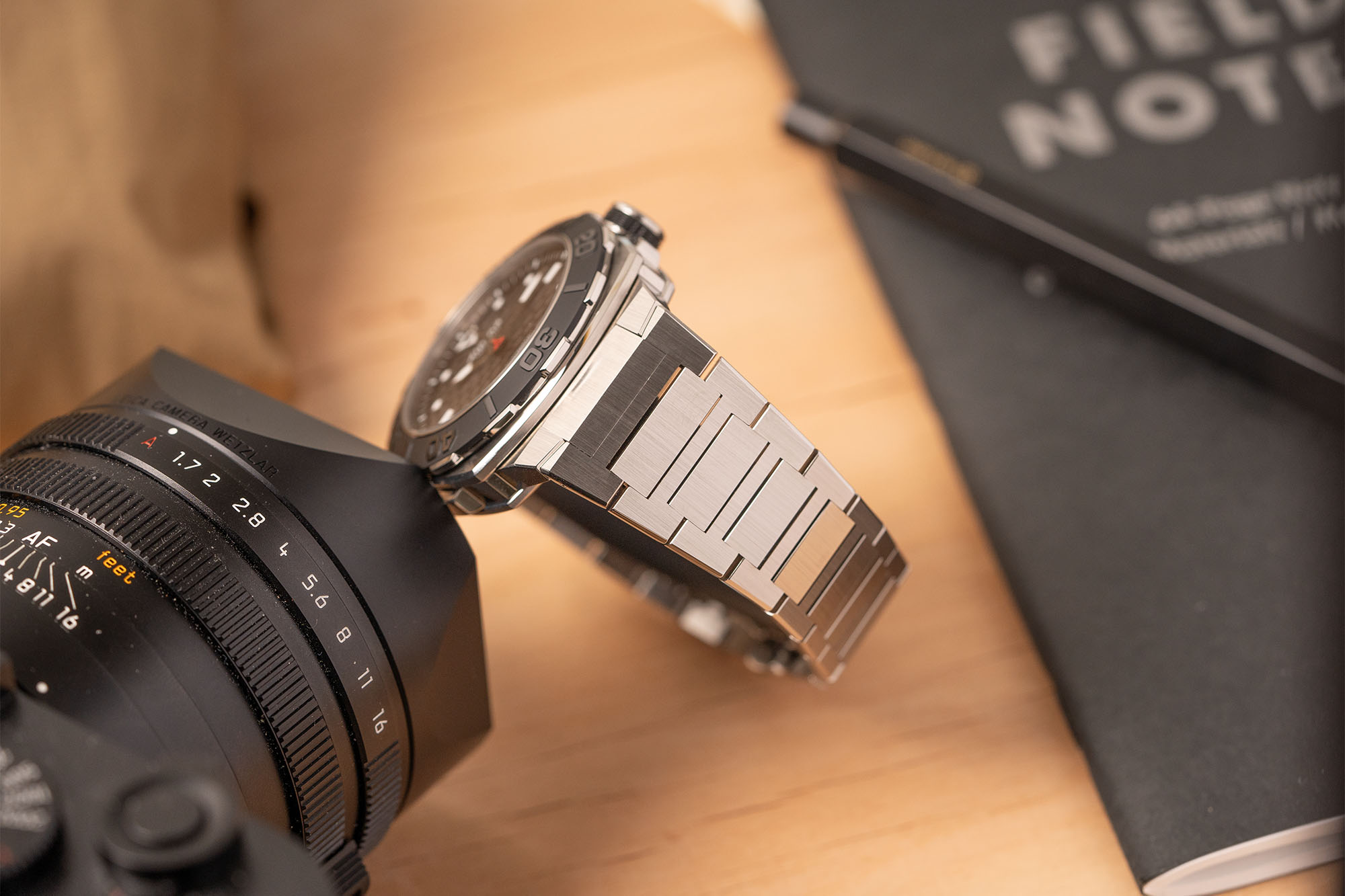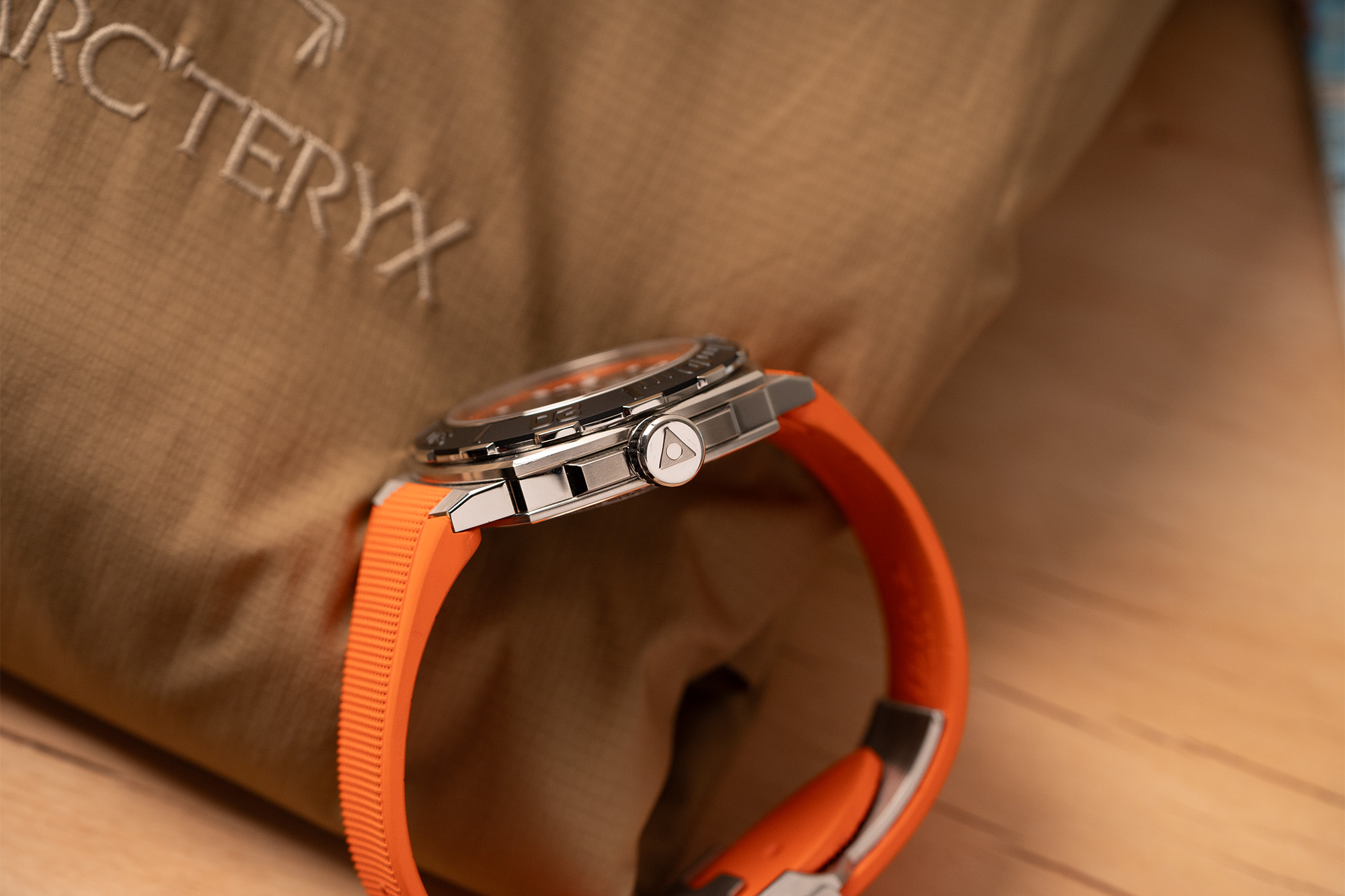 The Seastrong Diver Extreme features a unique stepped 39mm square case with an impressive 300m of water resistance. Due to the lug-to-lug being so close to the case width, the Diver Extreme wears well on nearly any wrist. Each of its three dial variations features bold triangular serrations, resulting in a dial texture unique to the model. The Seastrong Diver Extreme is available in black, blue, and orange dials and is paired with either a semi-integrated stainless steel bracelet or strap depending on the dial.