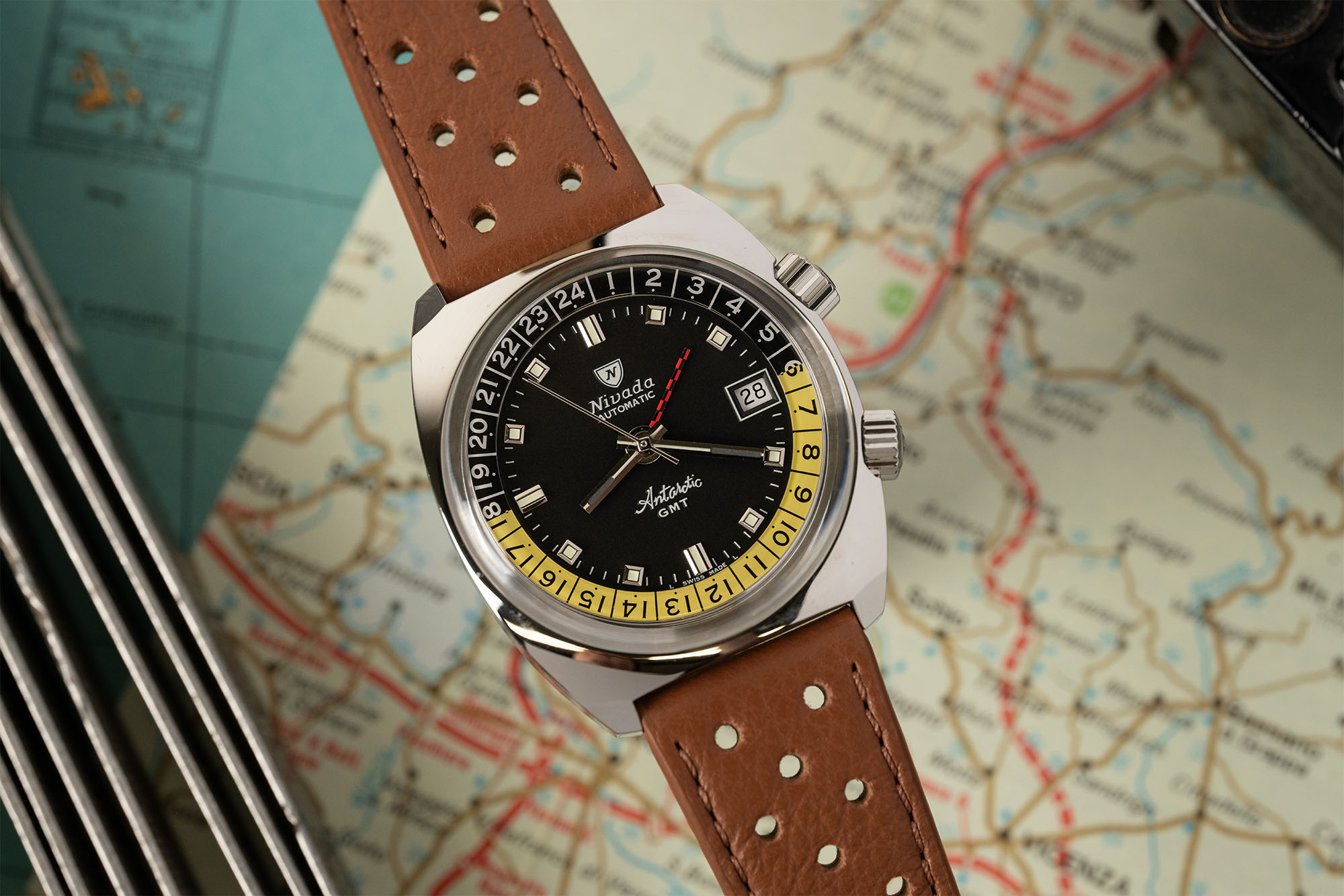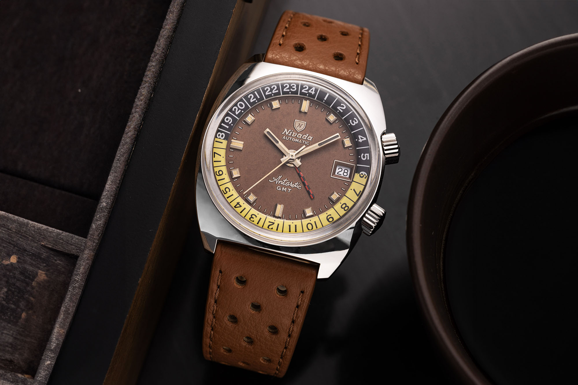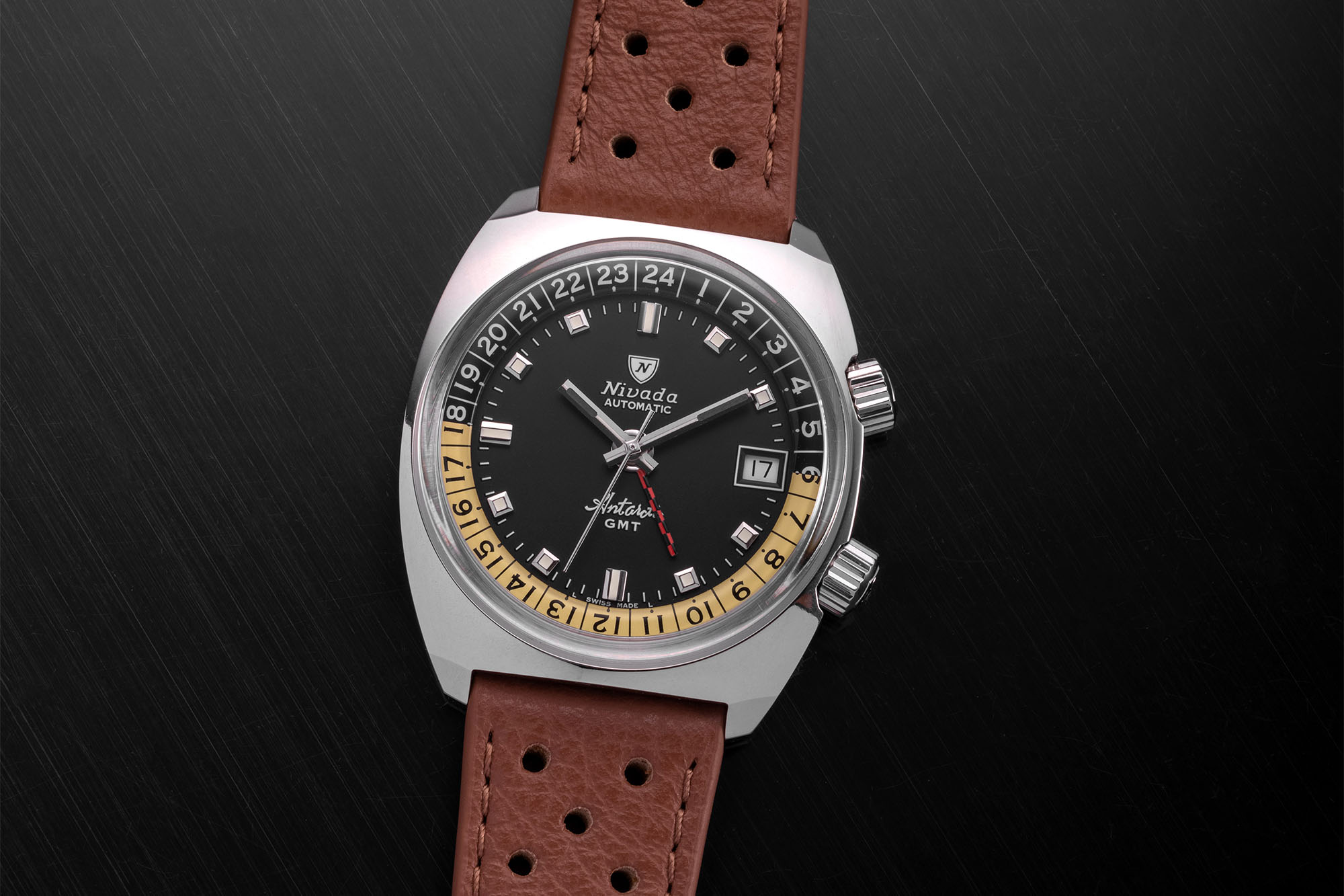 The revitalized Nivada Grenchen has made a splash through its startlingly accurate reissues of its famous Chronomaster, Chronoking, Depthmaster, and Antarctic collections. With their latest release, they’ve gone back to the Jet Age with the Antarctic GMT, a rare reference produced for just a few years in the early 1970s.