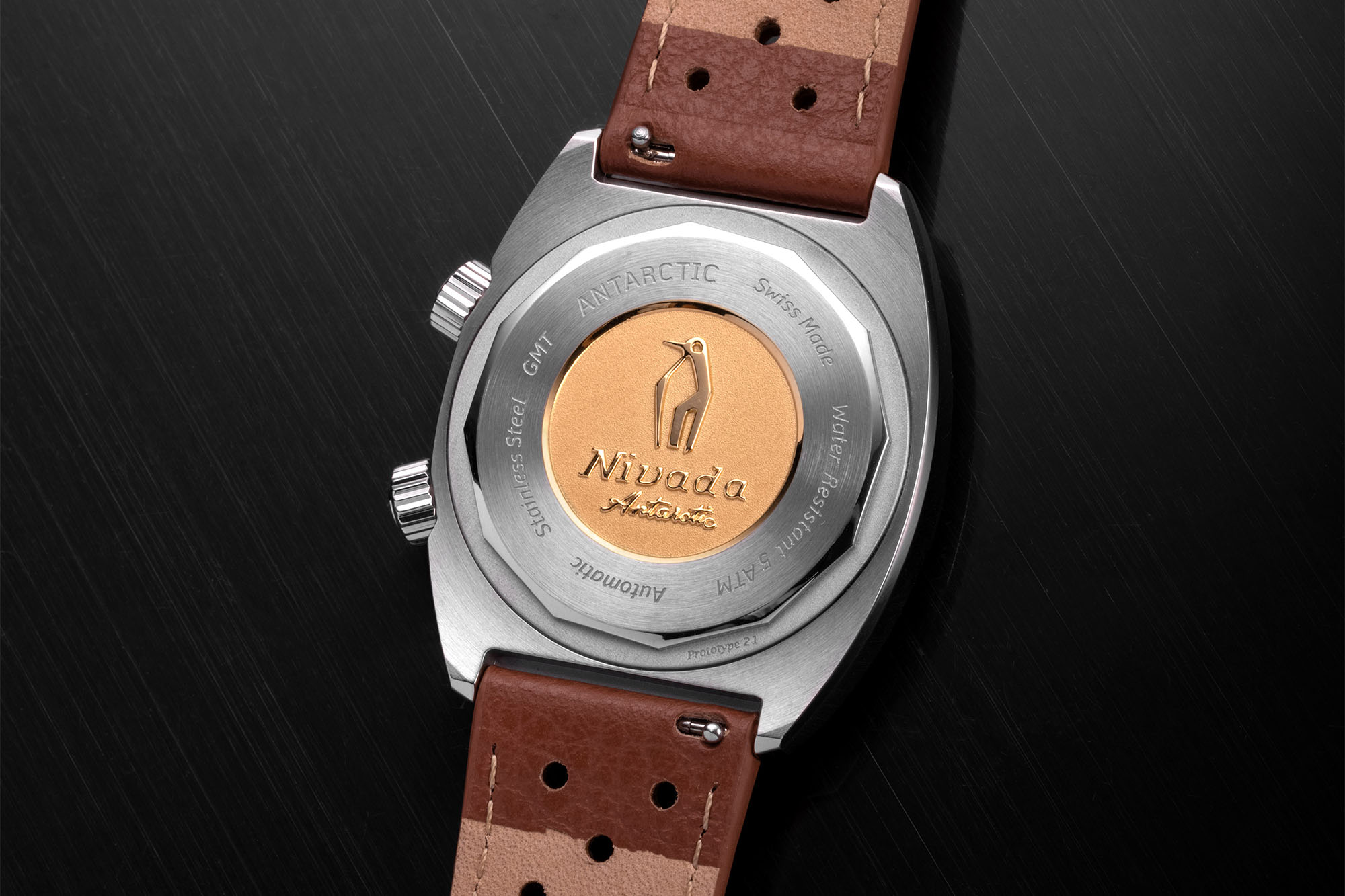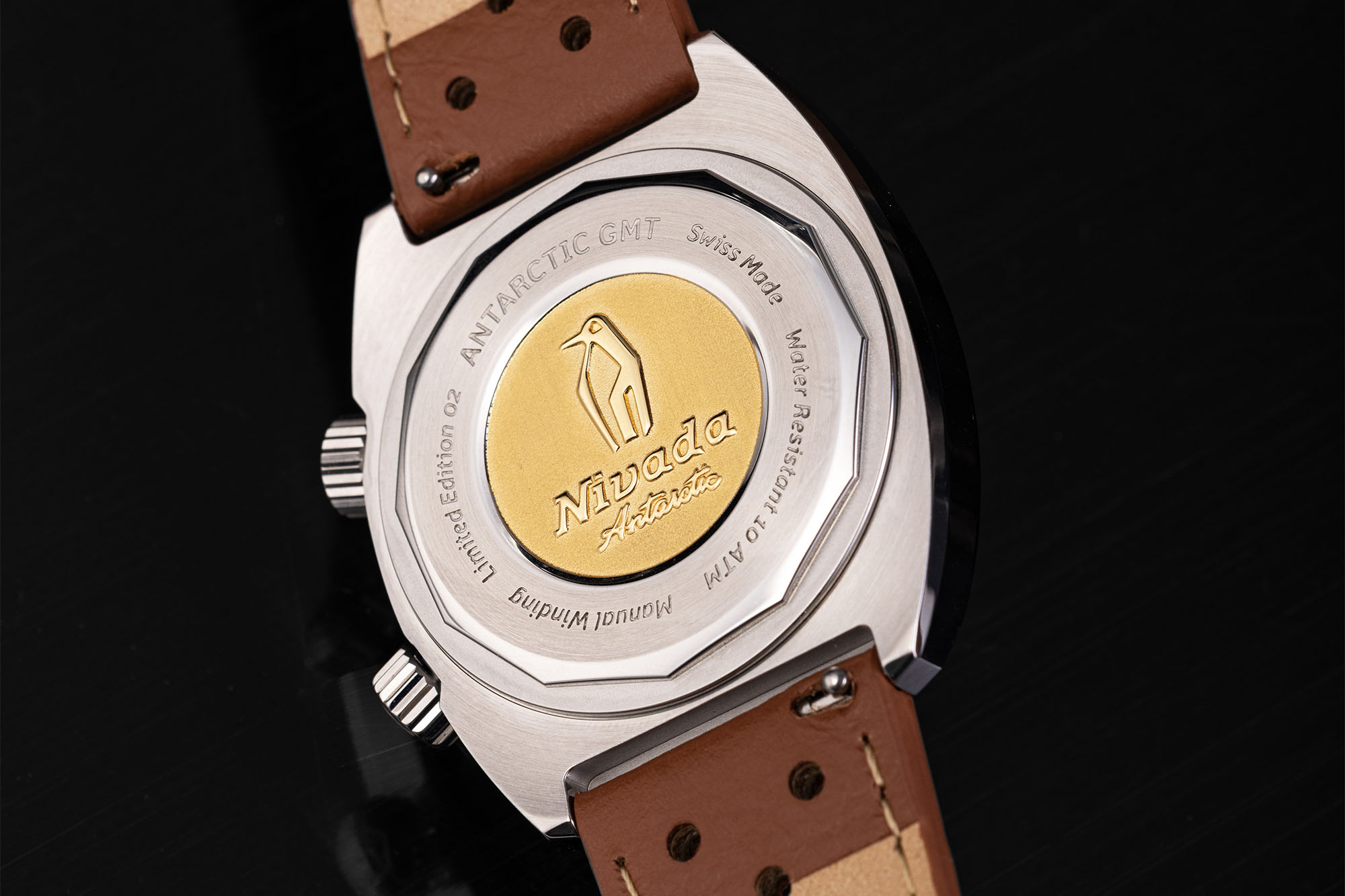Underneath the Antarctic's engraved Penguin caseback is a Soprod C125, a Swiss-made automatic caliber featuring an independent 24-hour hand “caller” GMT complication, date, 25 jewels, hacking, hand winding, a frequency of 28,800 beats per hour, and a power reserve of at least 42 hours.