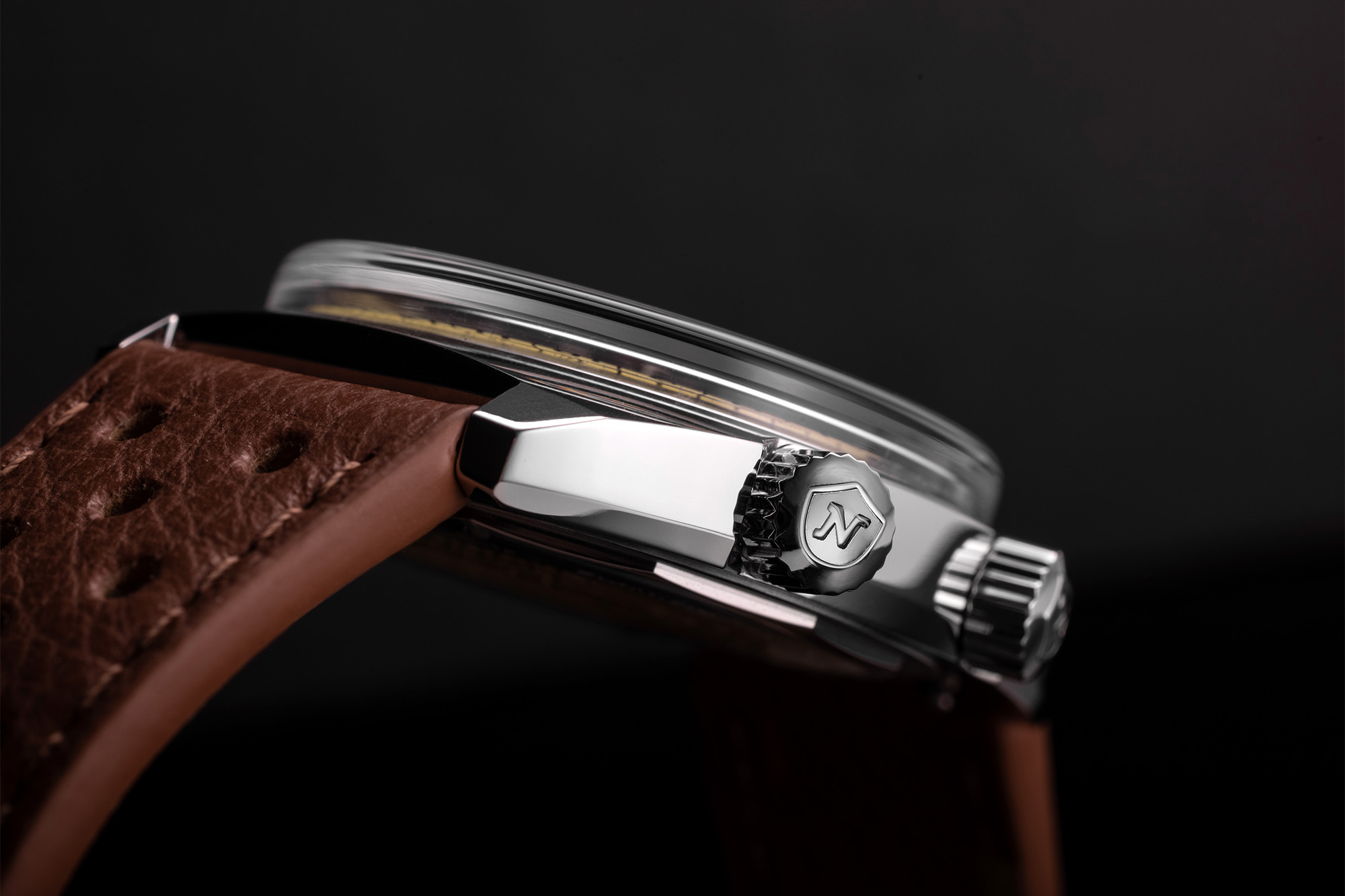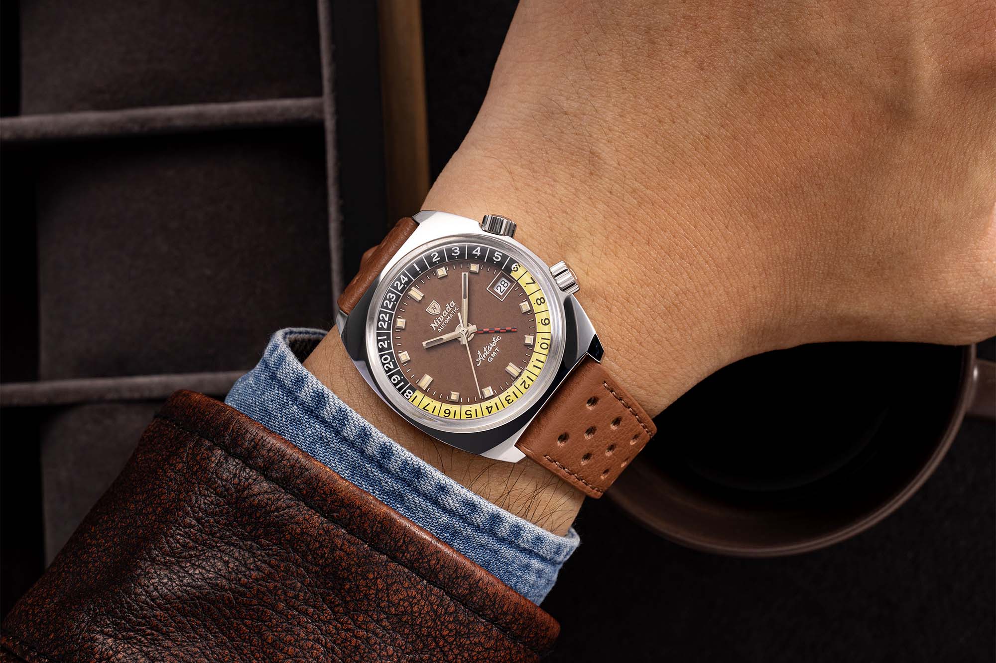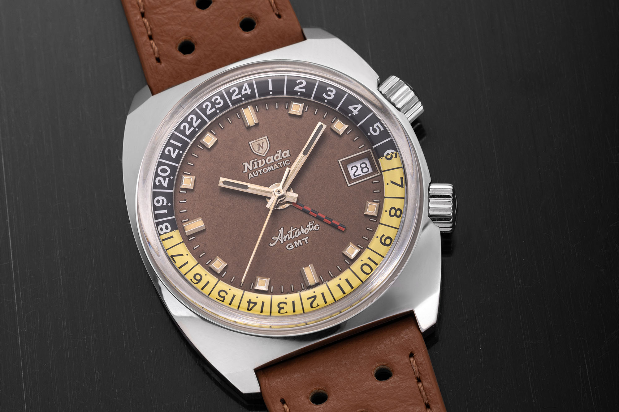 The revived Antarctic GMT features a brushed 36mm cushion-shaped stainless steel case true to the 1970s original. This simple design is radically accented by the Antarctic GMT's twin crowns, based on the original EPSA Super-Compressor case, though the reissue does not use this technology. The GMT scale is rendered through an internal rotating bezel operated by the top crown. Its dual-tone black and yellow scale is true to the past, offering a unique splash of color. The Antarctic GMT is available in black and tropical dial variants, the latter a limited edition of just 99 pieces, and is paired with a matching brown leather racing strap that oozes vintage charm.