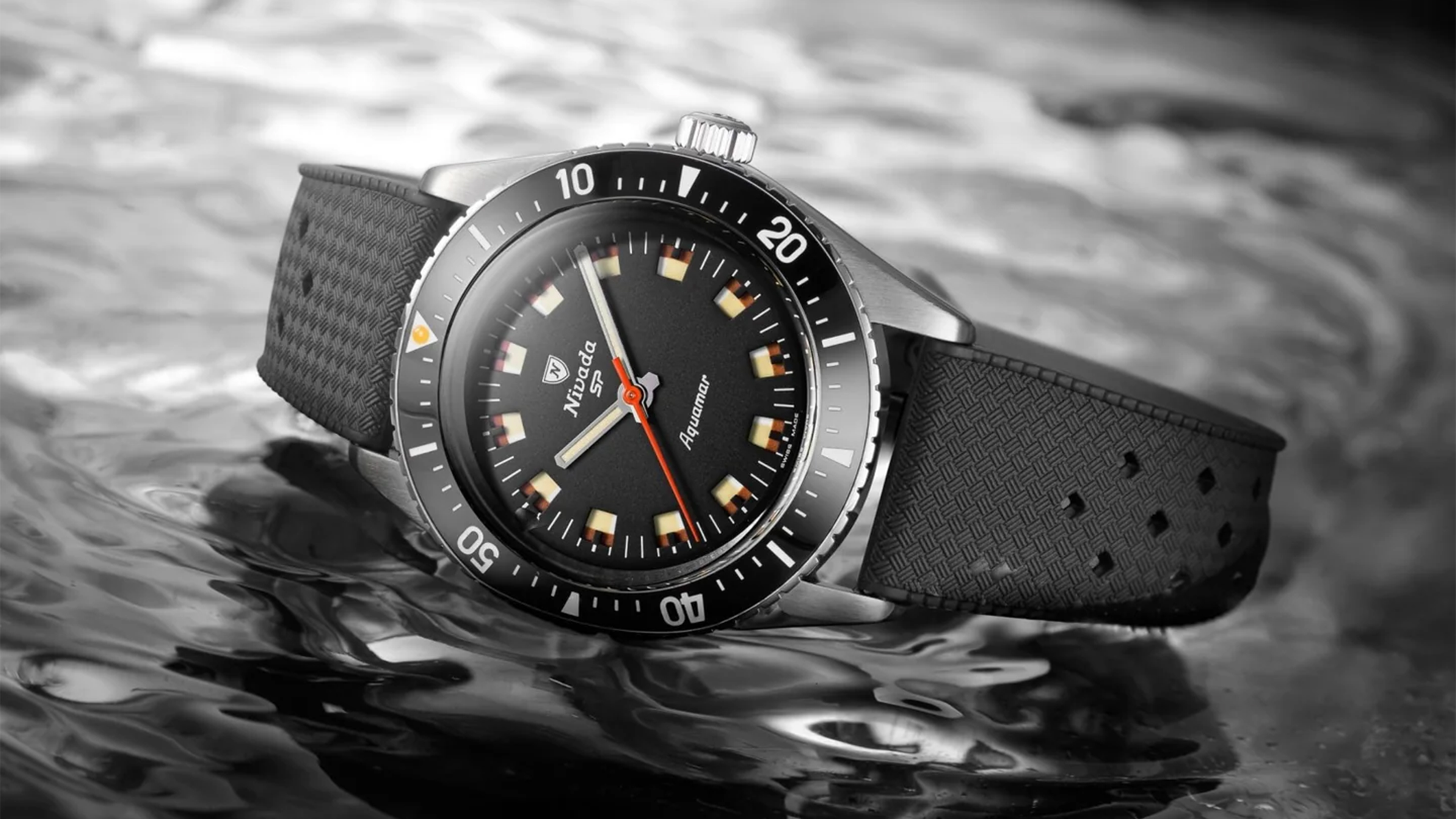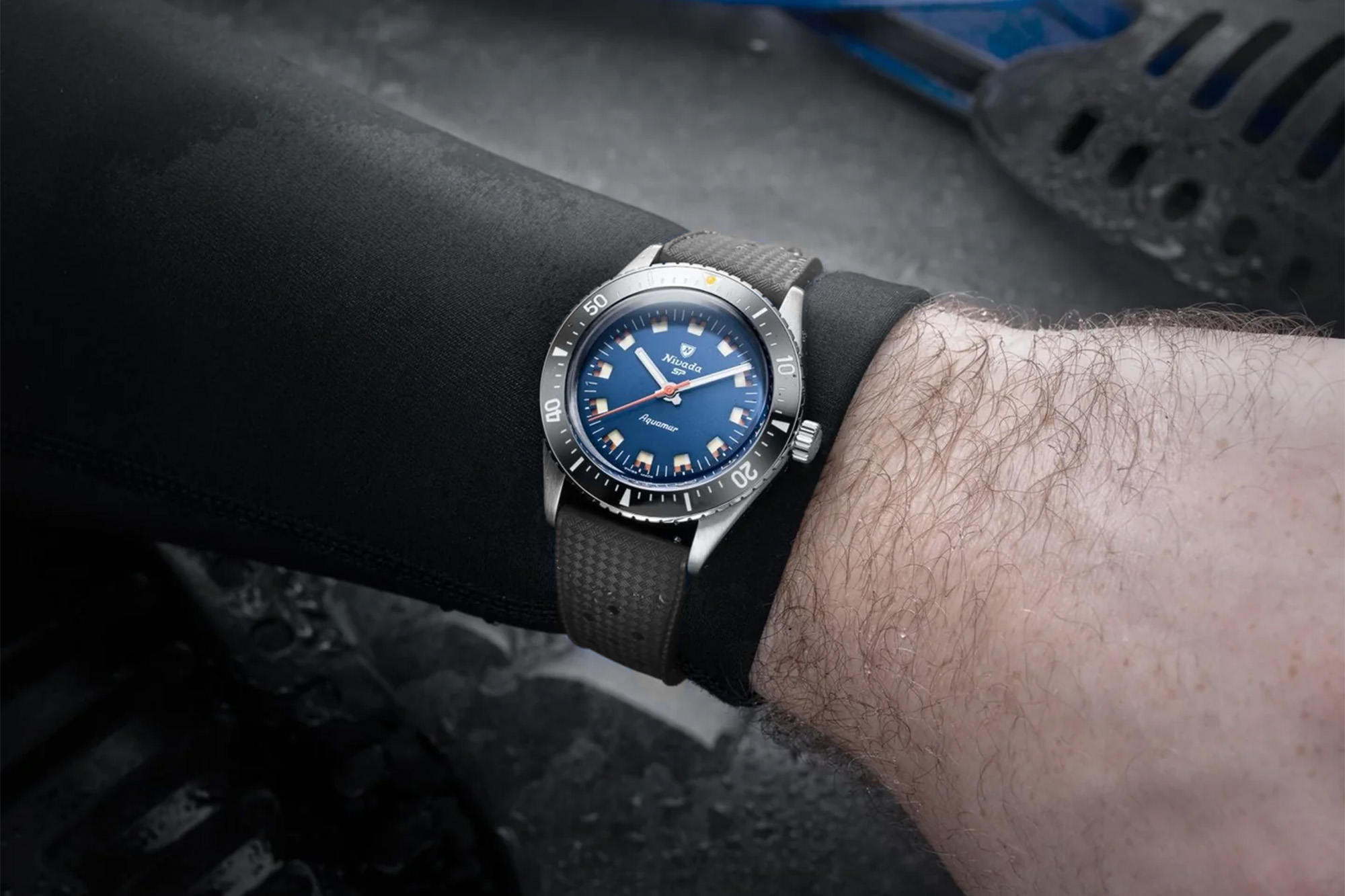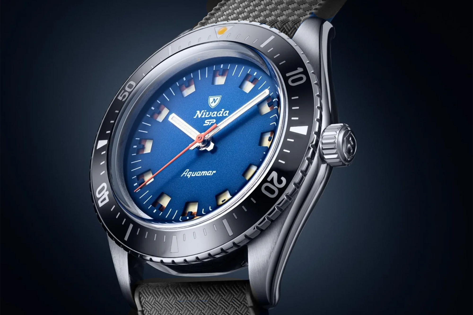 Celebrating the brand’s legacy rooted in the legendary Antarctic expedition, the Nivada Grenchen Antarctic Diver Aquamar revives a classic 1960s dive aesthetic with modern engineering and unexpected flair. Offered in matte blue and matte black dial variants, each model showcases a vintage-style sandwich dial with dual-tone Super-LumiNova that shifts daily via a clever roulette-style calendar disc — toggling between crisp white and faux patina bronze glow.