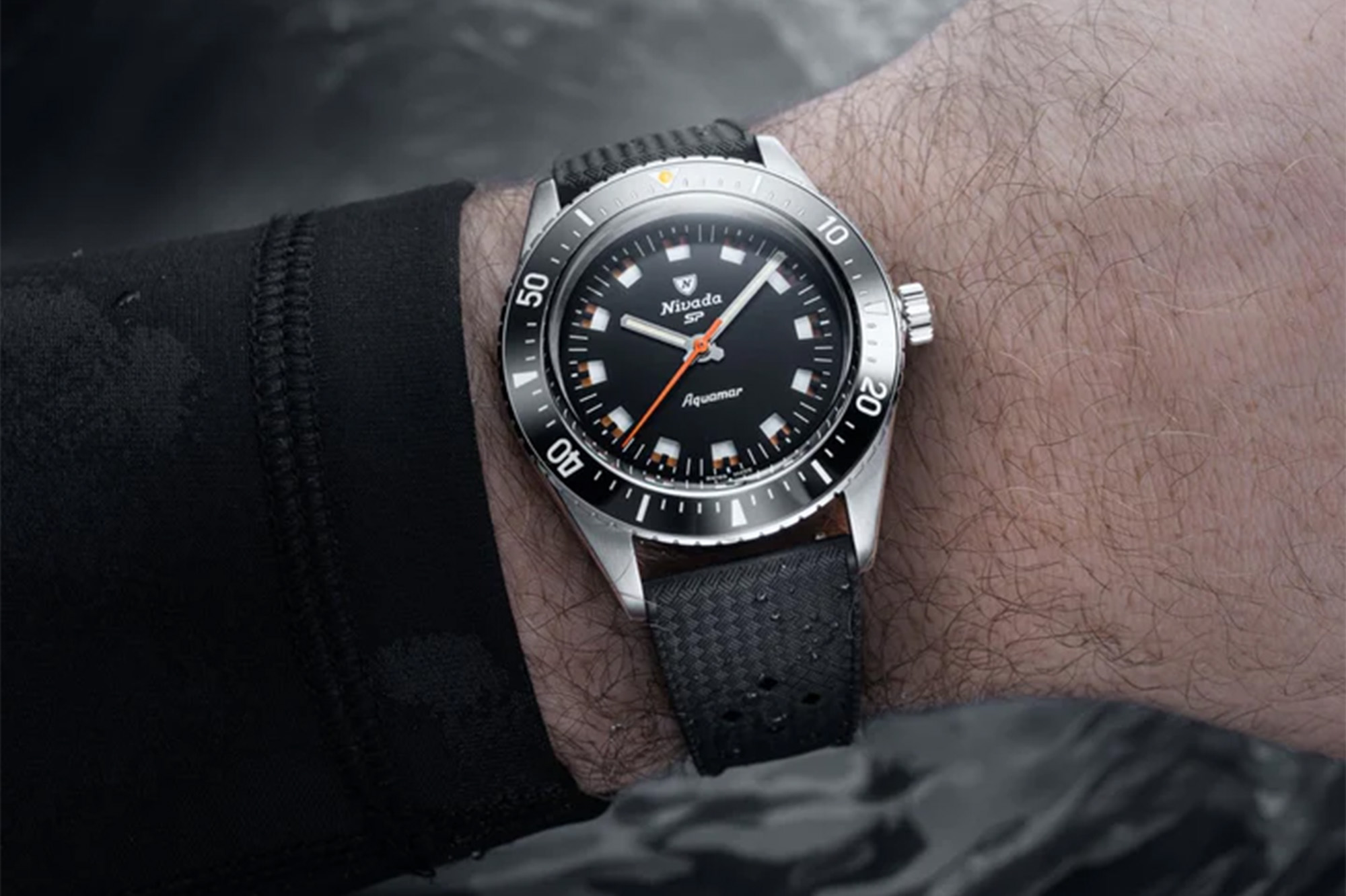 Housed in a perfectly balanced 38 mm stainless steel case with a bi-directional black ceramic bezel, double-domed sapphire crystal, and depth rating of 200 m, the Aquamar combines vintage sizing with professional specs. Inside beats the Swiss Soprod P024 automatic movement (28,800 vph), offering hacking seconds, a 38-hour power reserve, and reliability fit for modern explorers.