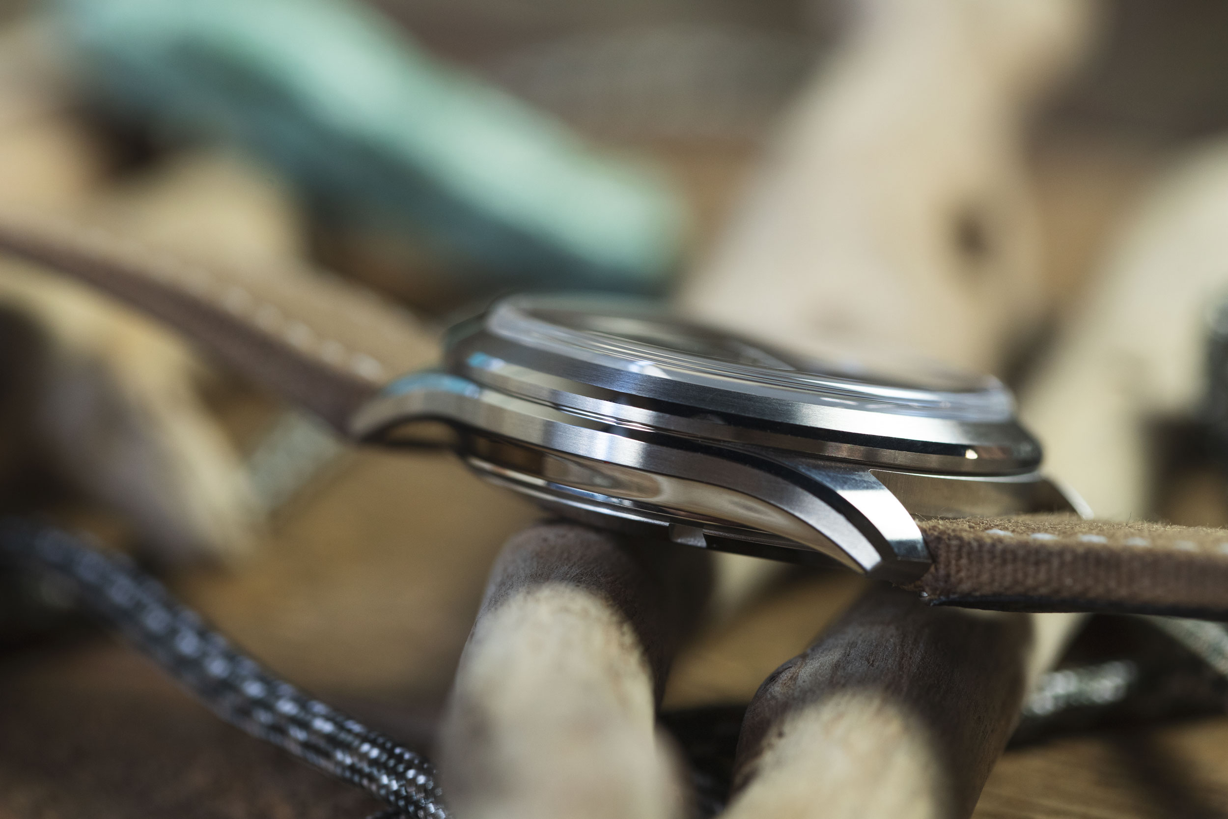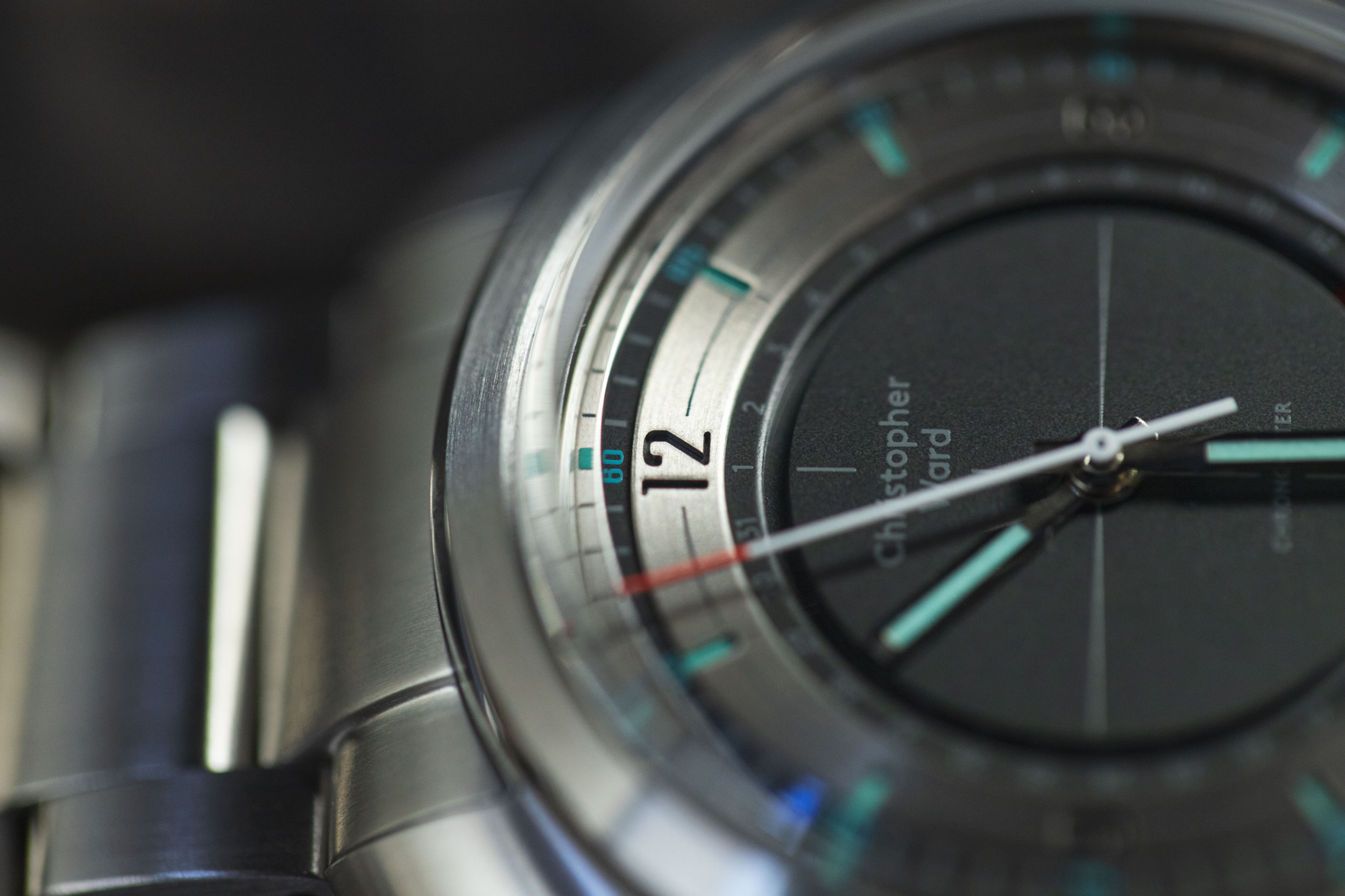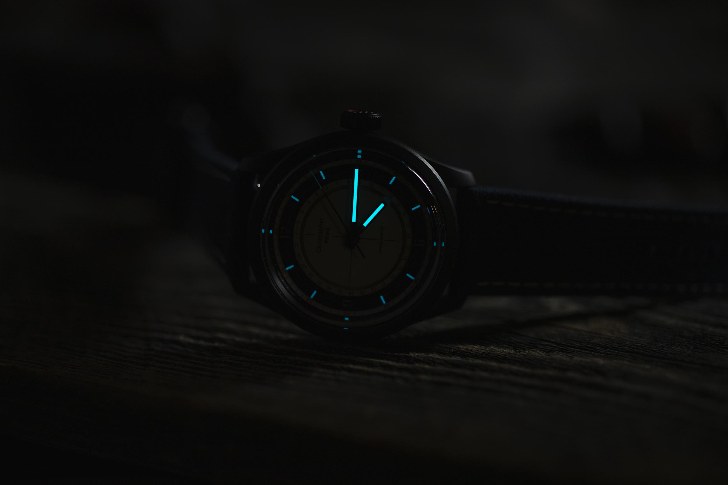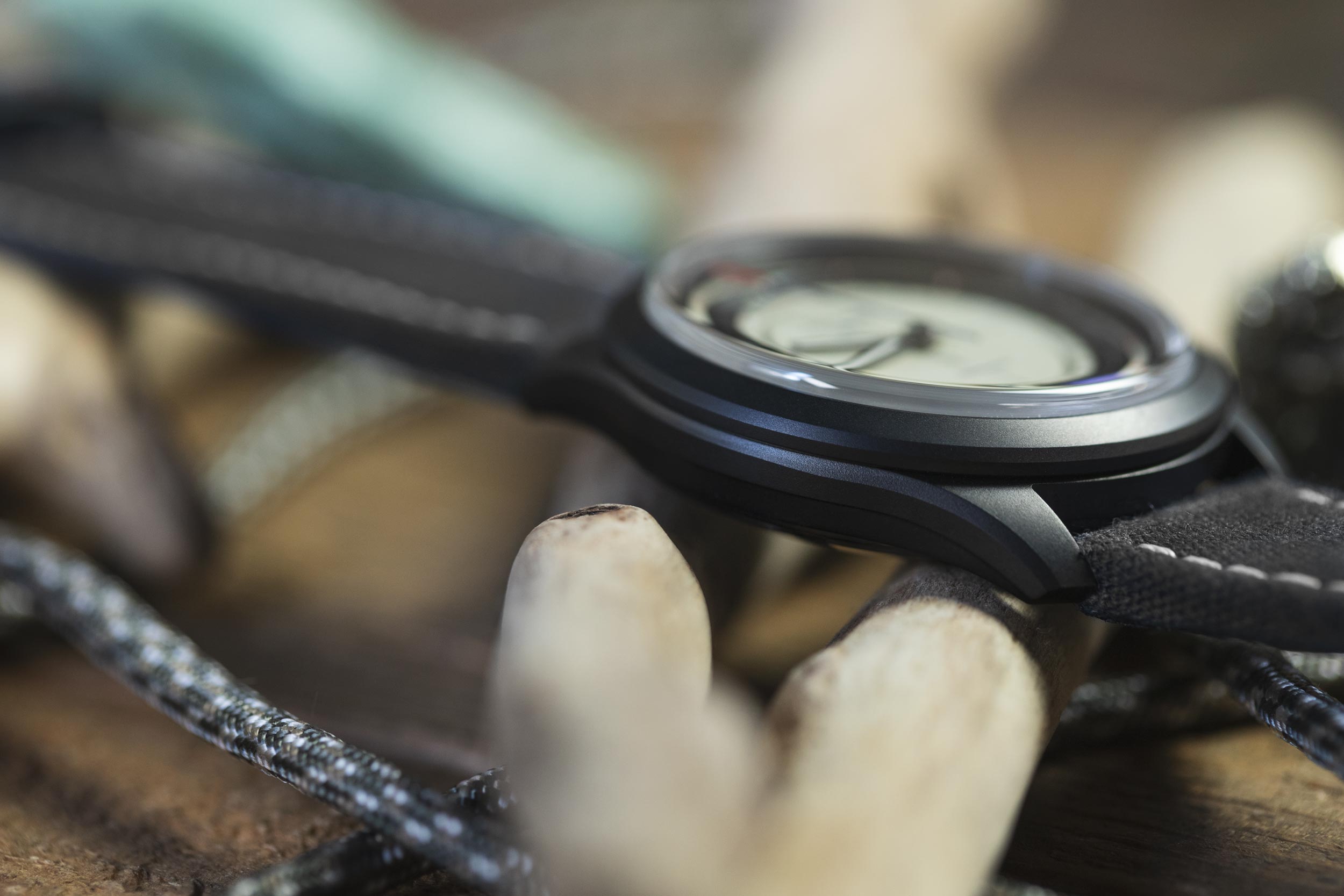 The dials were a collaborative effort between Worn & Wound and Christopher Ward. What emerged was a toolish sector-dial with an adventurous spirit. Concentric rings of raised metal alternate with valleys of matte color creating varying levels of height and visual weight. The metal rings match the cases around them, bringing industrial materiality into the dial. Punched out numerals in a military-inspired type mark the 3, 6, 9, and 12 hours, while lume plots at every hour and on the robust metal hands make sure there is clear visibility in low light as well. In lieu of a traditional date window, there is a pointer-date disk that frames the center of the dial. One cool and metallic, the other dark and warm, the Sandstorm and Sandstorm Blackouts offer excitingly different takes on the concept.