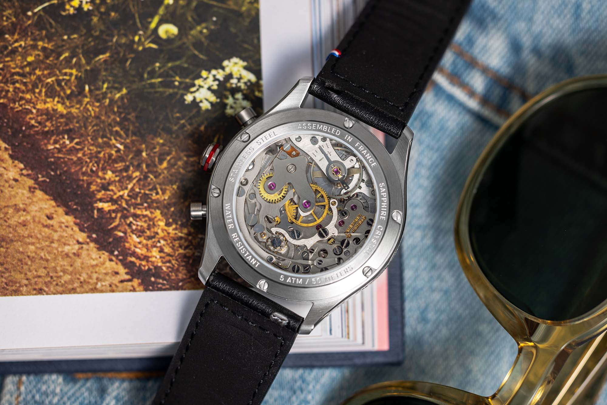 Powering the watch are restored vintage Valjoux 92 movements. Originating from the 1950s and 60s, the Valjoux 92 introduced innovative technology with its oscillating pinion, providing a simpler and more efficient coupling mechanism for the chronograph. Despite its simpler coupling mechanism, the Valjoux 92 retains its column wheel for actuation. It boasts 17 jewels, an 18,000 bph beat rate, and a 39-hour power reserve. For the collaboration, Depancel's watchmakers restored and modified the movements, visible through a display case back, a feature not found on vintage Valjoux 92 watches.