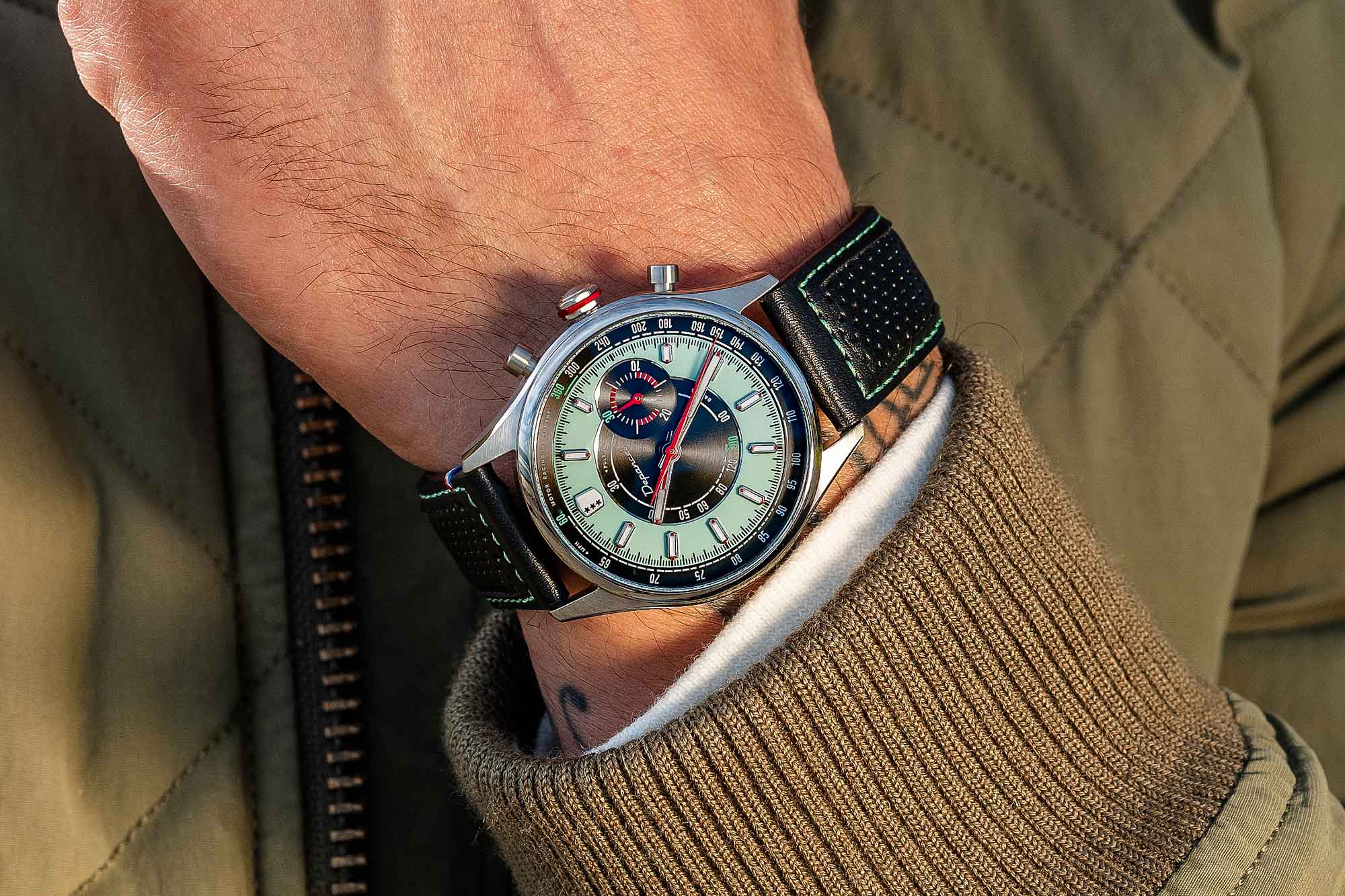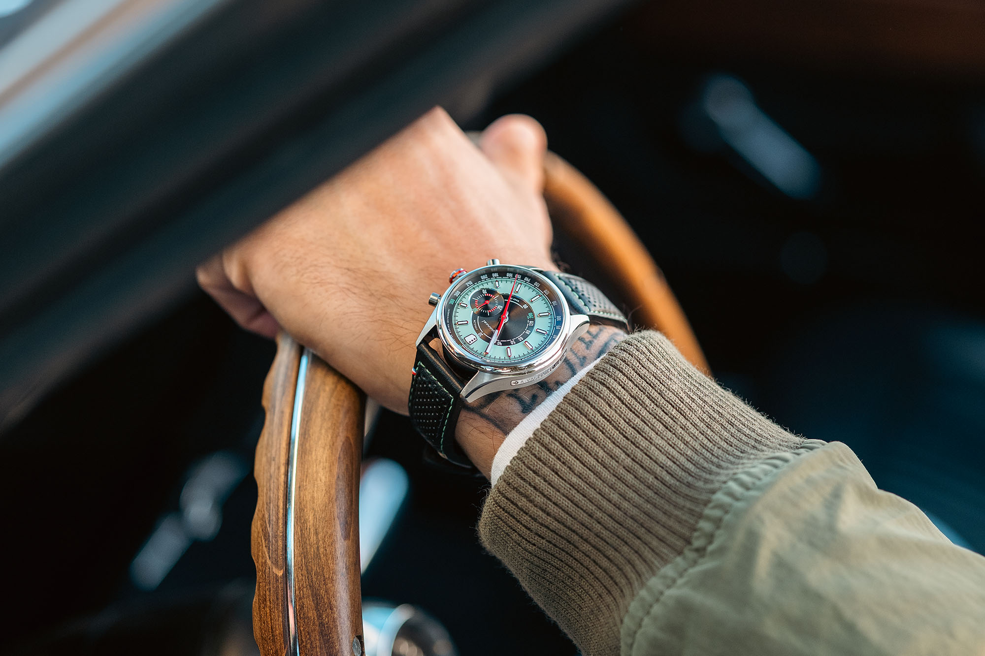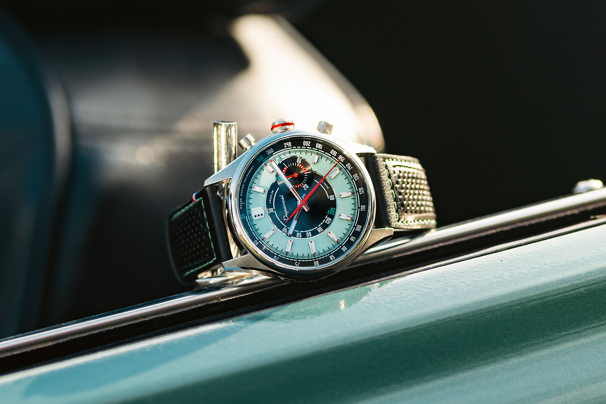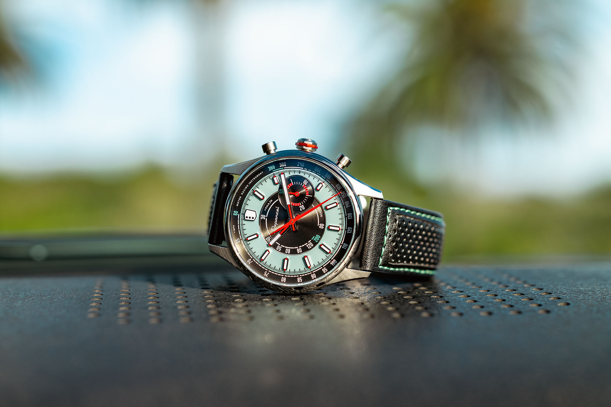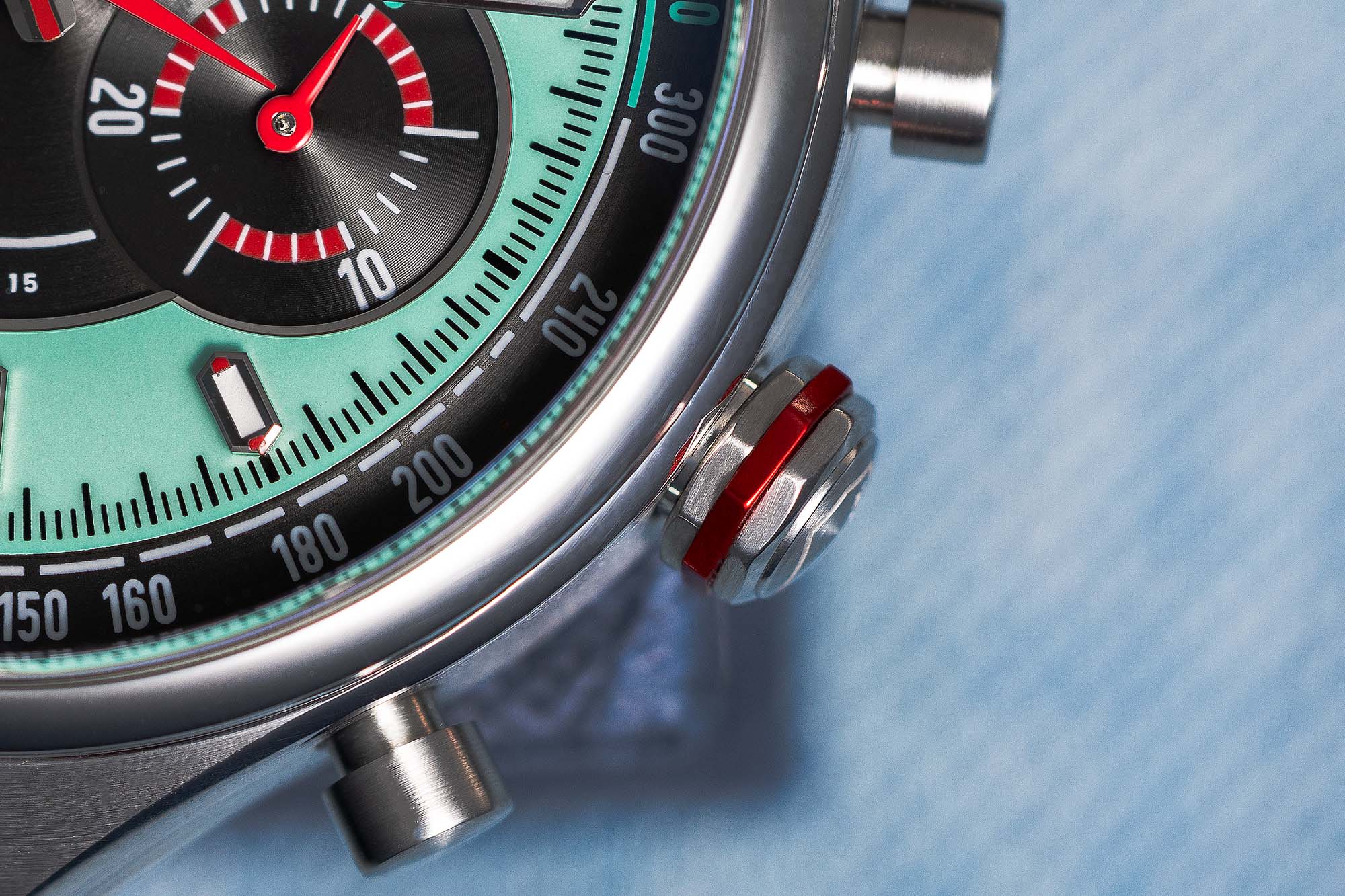 In a further departure from convention, the collaboration removes the running seconds sub-dial and hand, creating a single-eye chrono design. The choice of mint green as the primary dial color was inspired by classic American cars. Rendered in gloss lacquer that contrasts the otherwise brushed, dark metallic surfaces, the mint green brings a cool, carefree style to the timepiece.