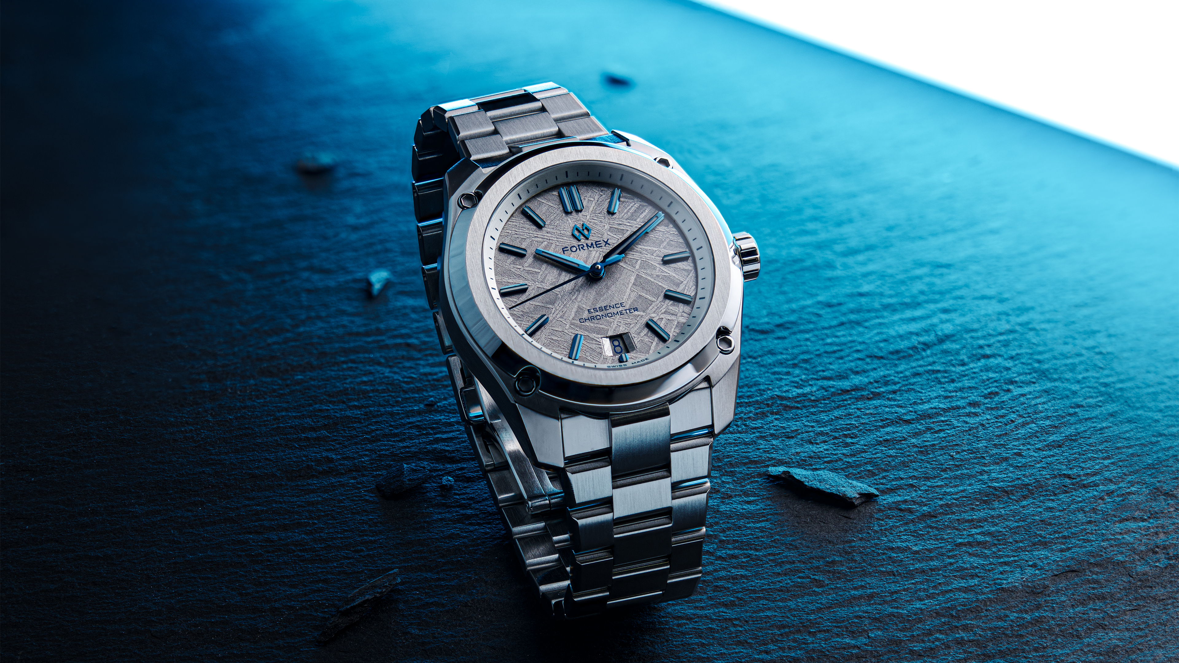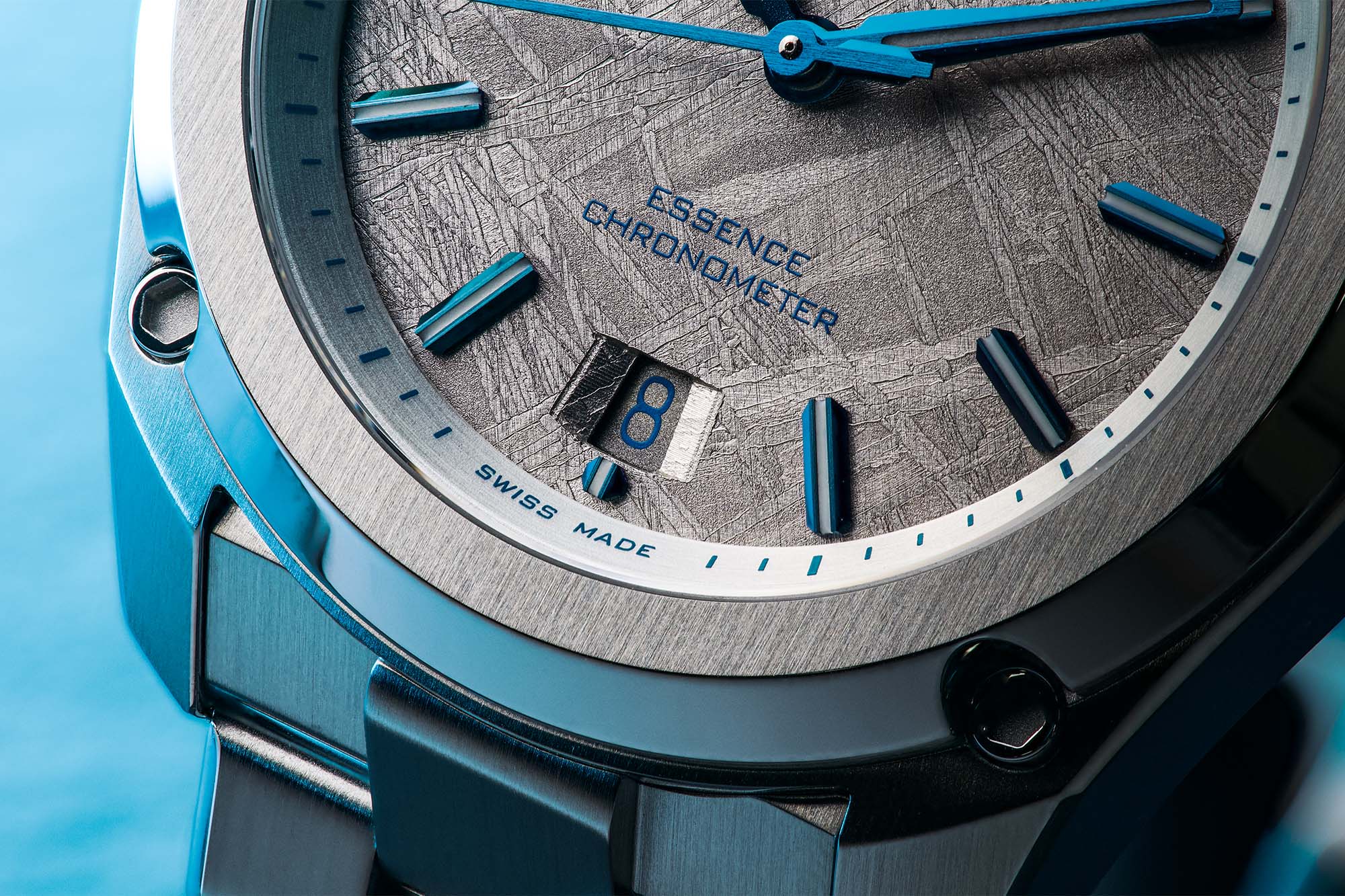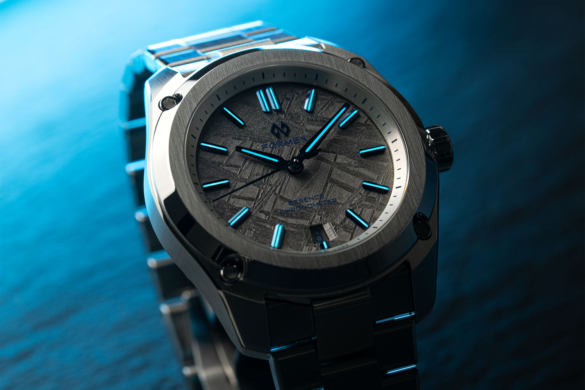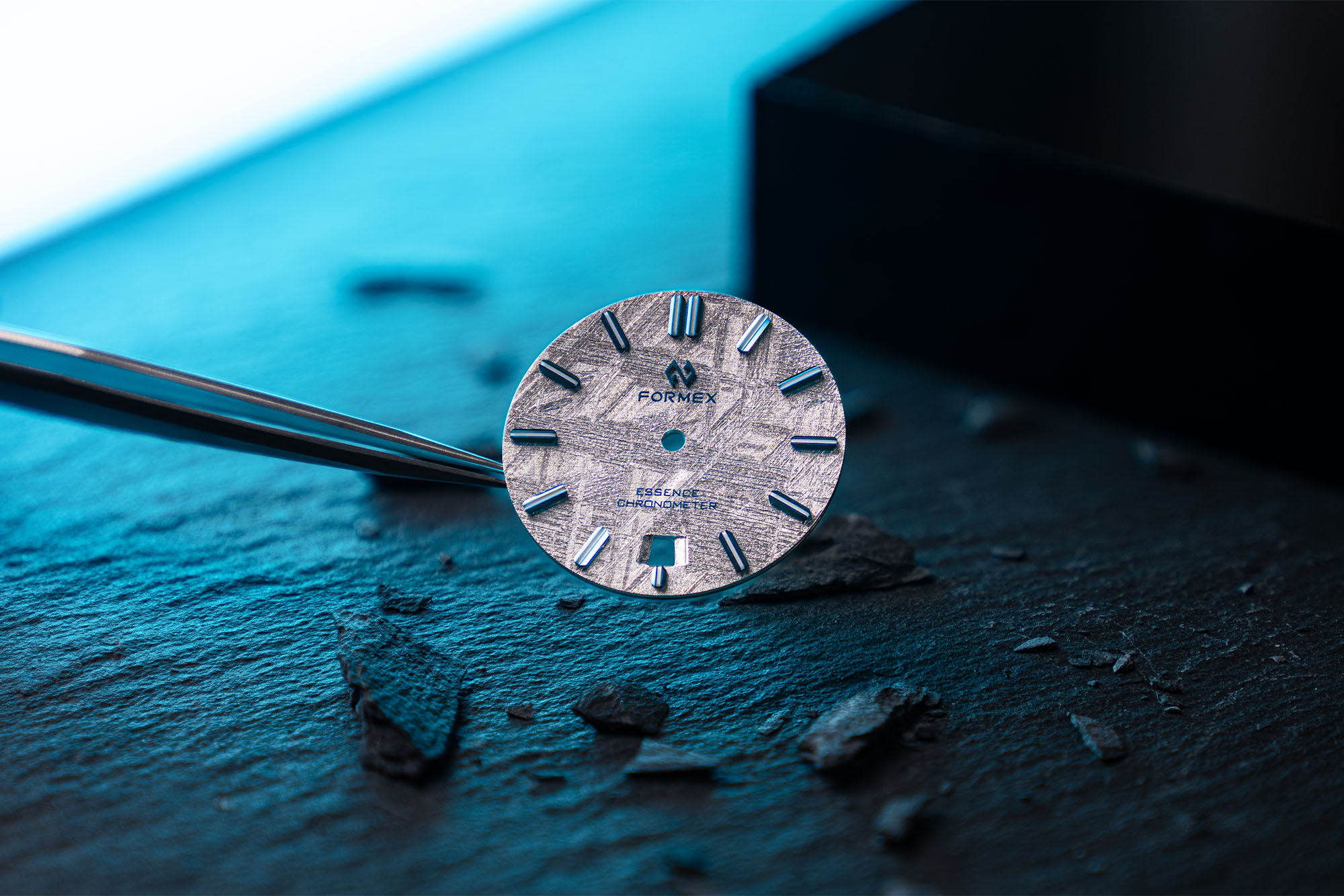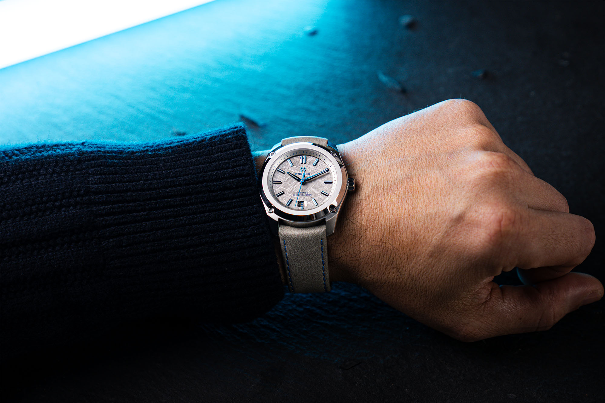 The Formex Essence 39 Automatic Chronometer "Space Ghost" is a celestial-themed evolution of the brand's flagship model, serving as a highly anticipated follow-up to the previously released 41mm edition. The watch brings the otherworldly aesthetic of a 4.5-billion-year-old Muonionalusta meteorite dial. To preserve the dial's unique Widmanstätten pattern while adding a spectral silvery sheen, the meteorite is treated with rhodium plating and contrasted by thermally blued hands and indices.