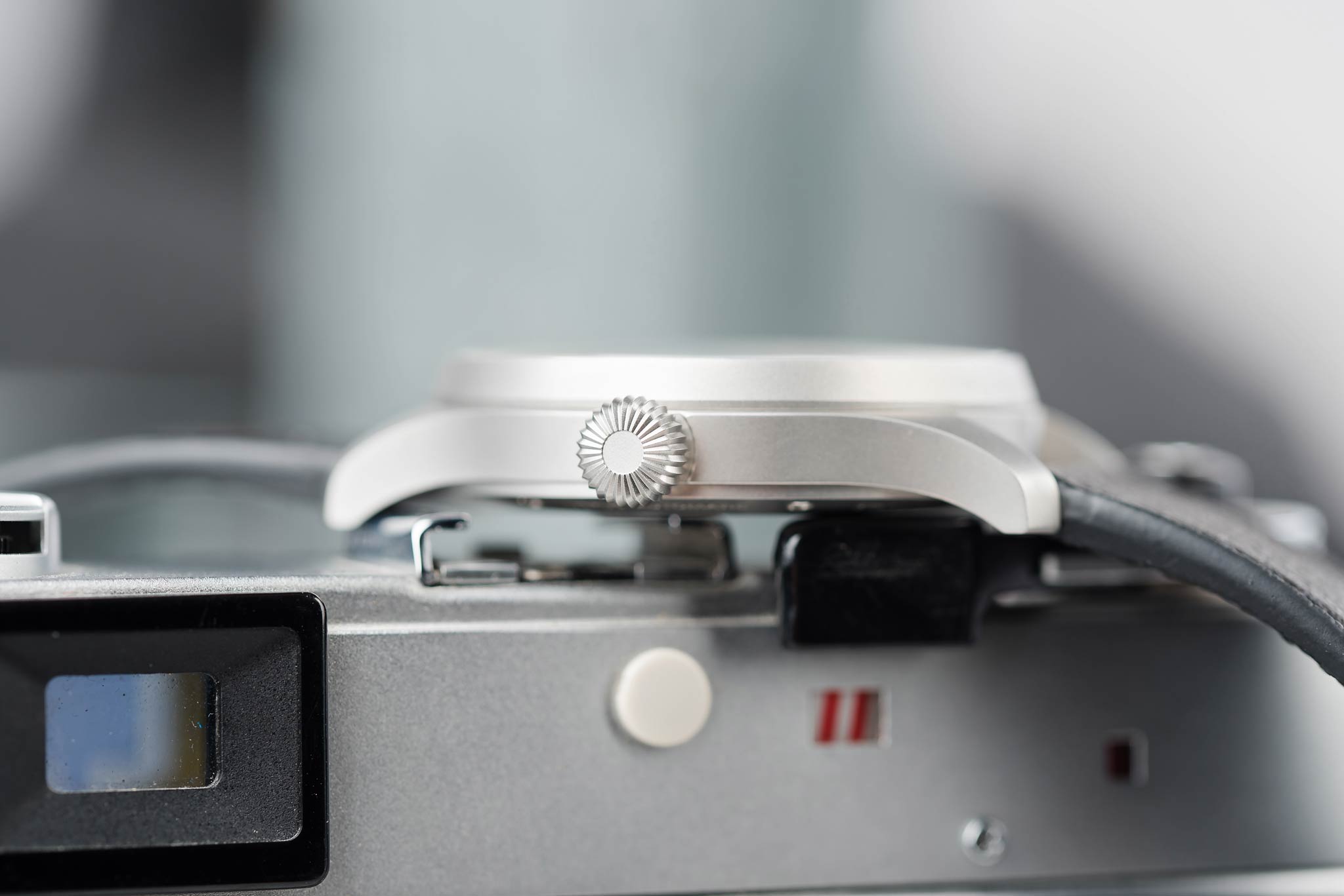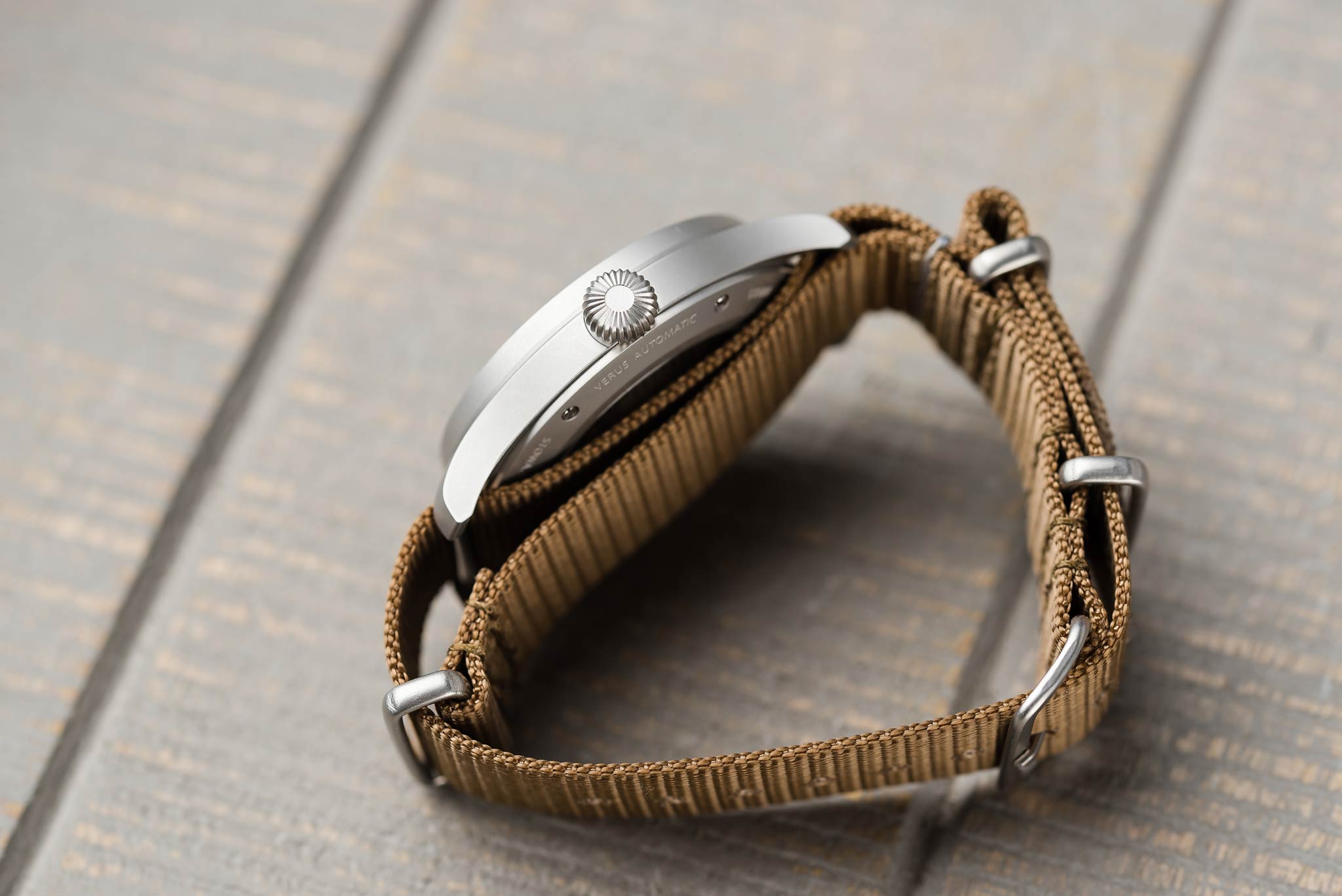 For the limited edition, we made the dial a matte, neutral, medium gray with matching date at six. The monochromatic palette gives the Verus a more urban aesthetic, increasing its everyday wearability. We paired the LE with a black leather strap from Stowa for a classic option, and a modified Coyote ADPT Strap with matte hardware for a sporty take. The gold tone of the Coyote nylon complements the gray dial, adding another layer to the design.
