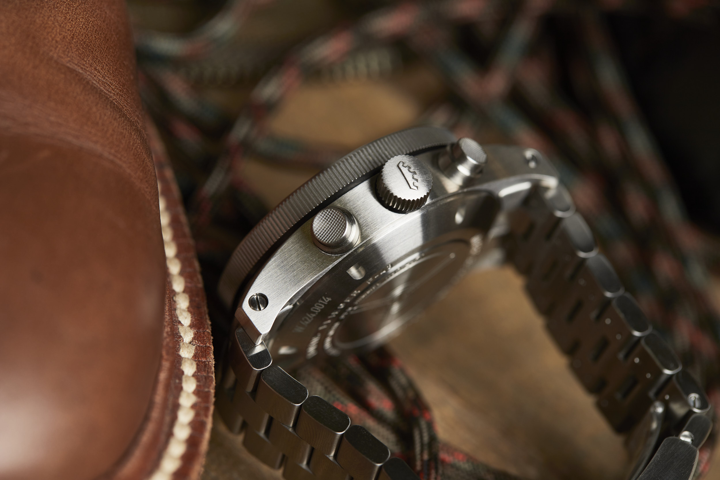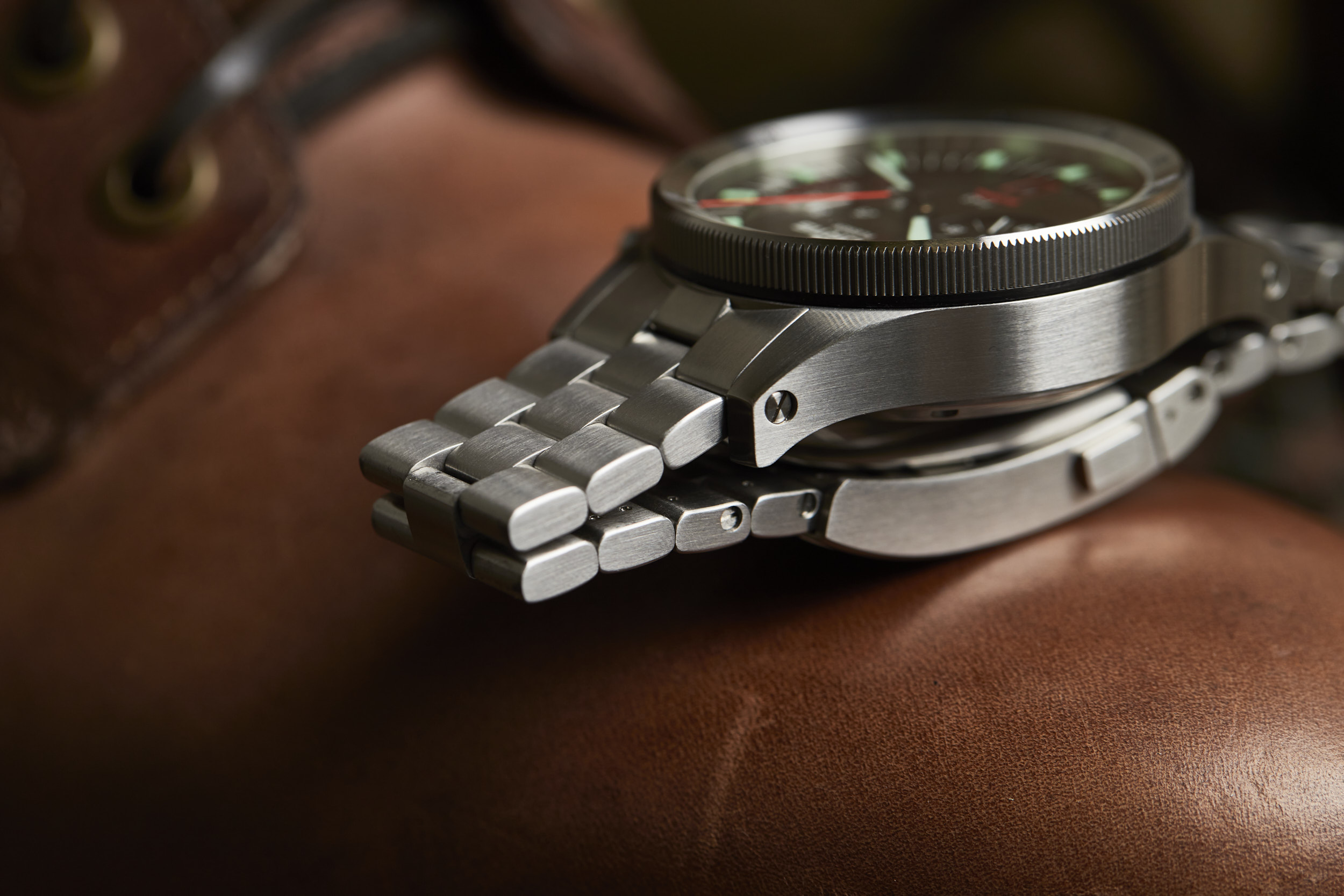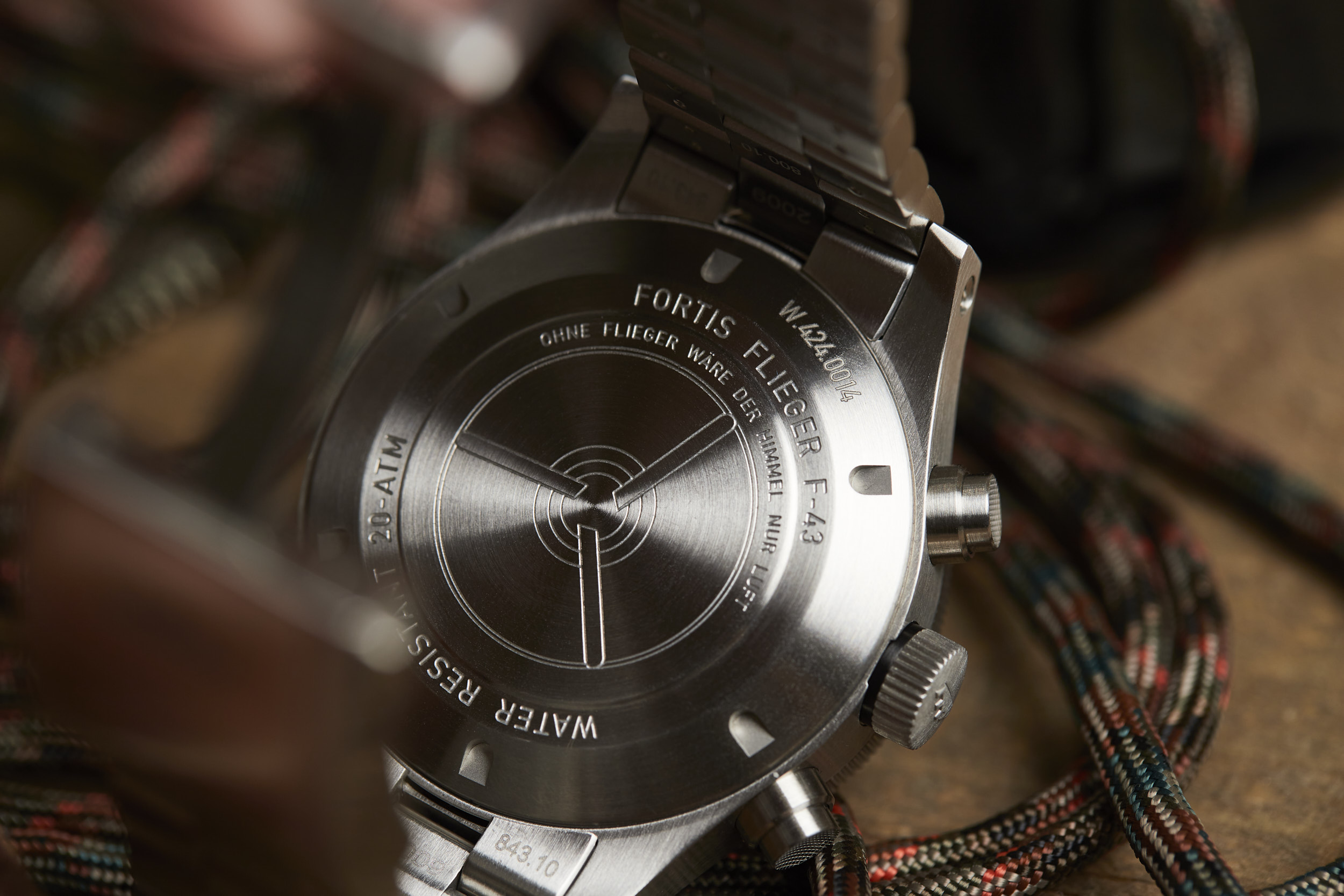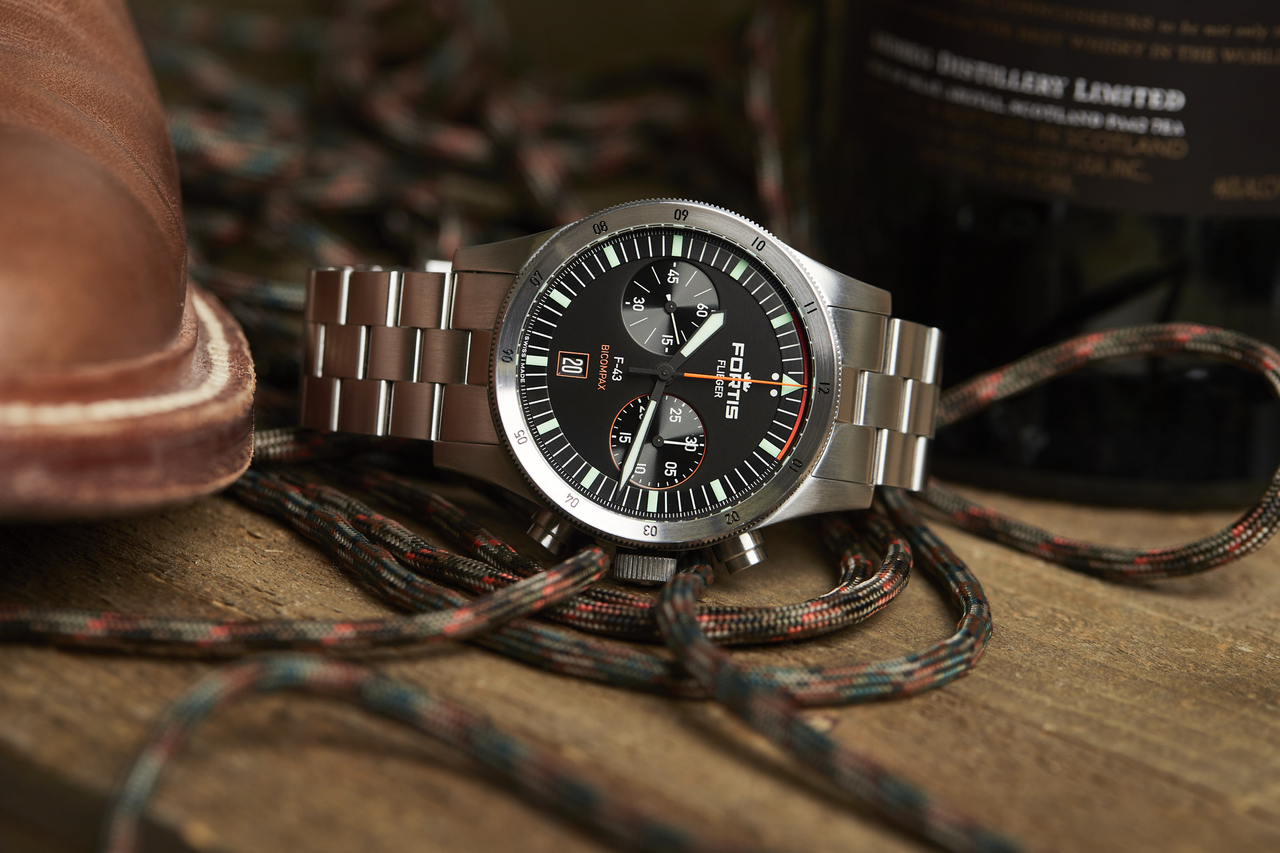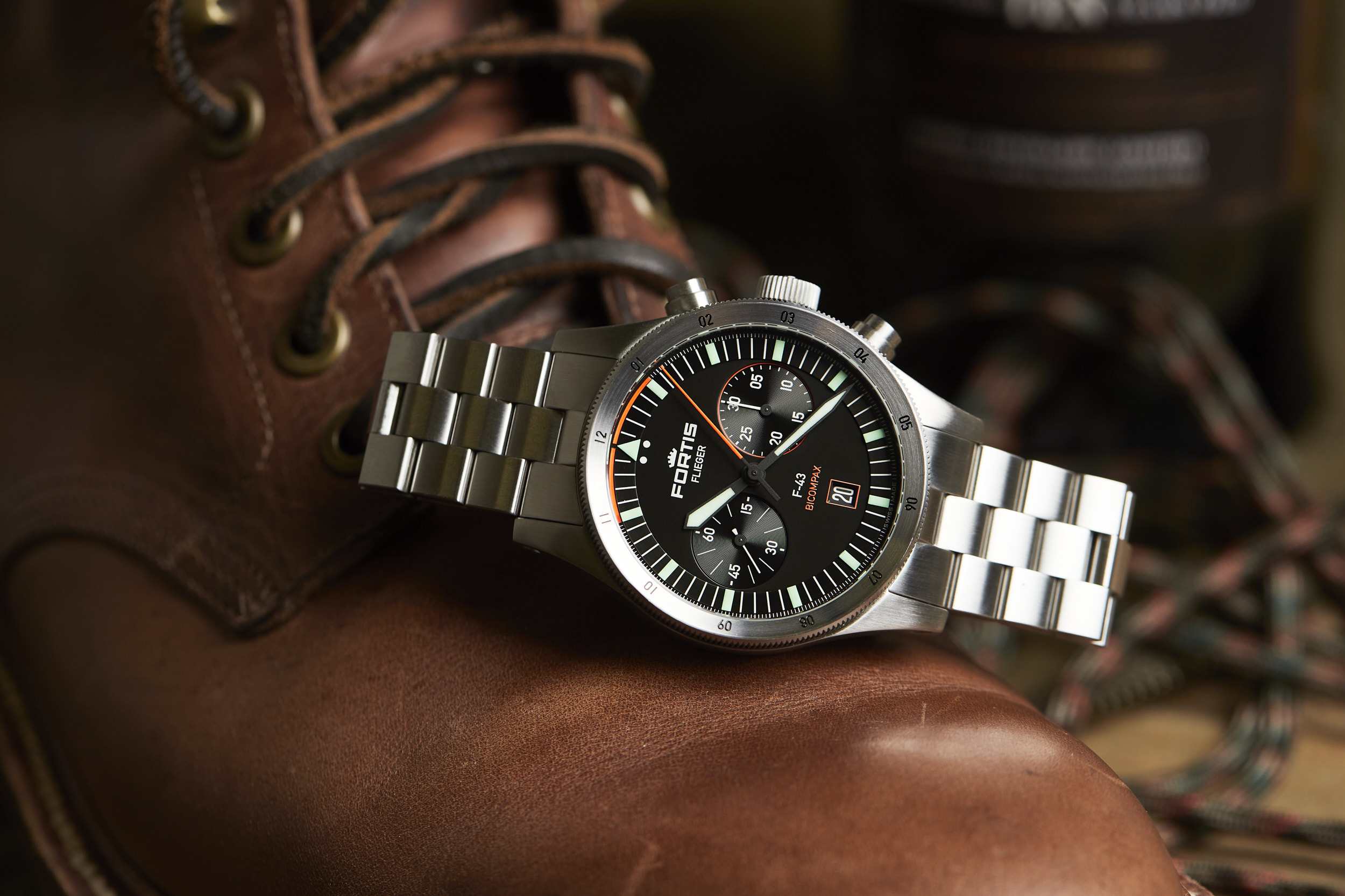 Under the dial beats a Fortis UW-51 automatic movement, based on ETA Valjoux 7750. This Swiss movement features a date at the six o’clock position and a central seconds hand finished in a matched orange tone to the date window, Synchroline marker, thirty-minute tracker accent ring, and “BICOMPAX” text at six o’clock. Other features include a 27-jewel count, frequency of 28,800 bph, and 48-hour power reserve. Much like the brand, this movement is sure to be a reliable companion whether traveling through land, air, or space.