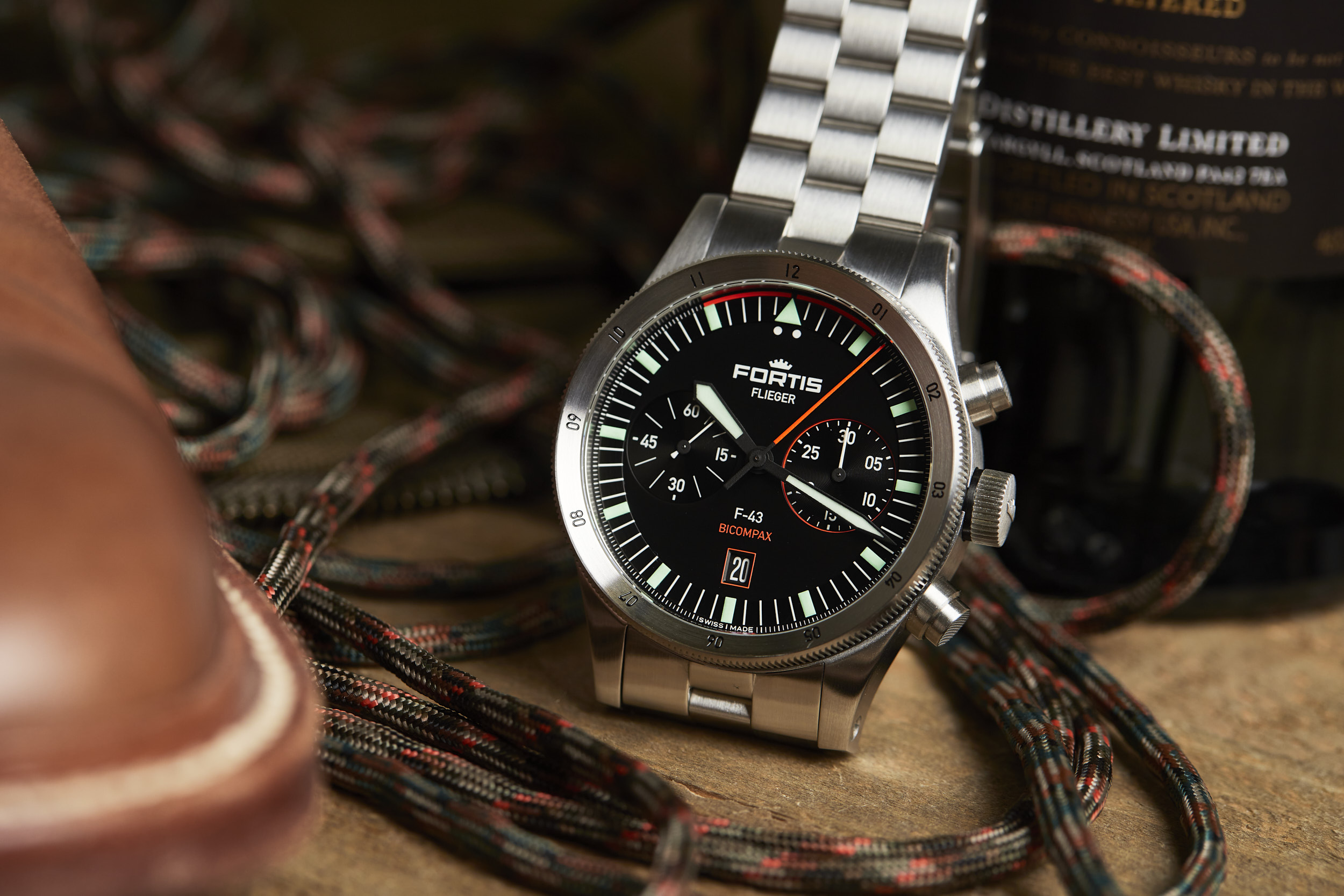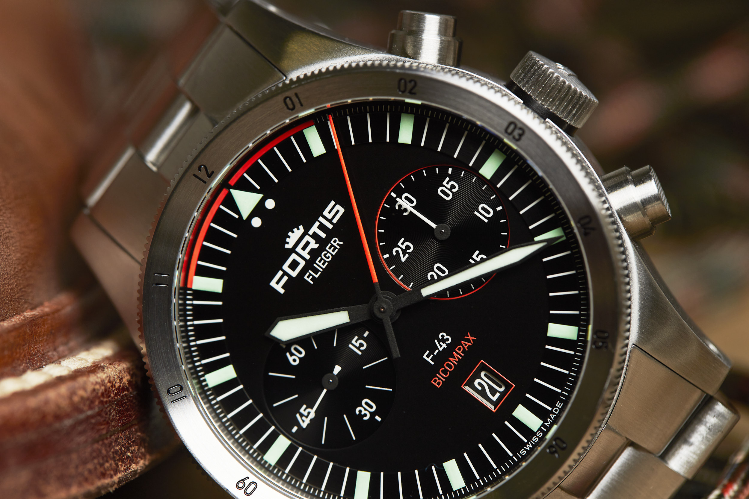 The F-43 Bicompax is a handsome, dual-register chronograph that shares its design cues with the rest of Fortis’s Flieger lineup. As with all of the Fliegers, it boasts a 200m water resistance rating, a finely brushed steel case, a bi-directional turning twelve-hour bezel with 24-positions, and a sapphire top crystal. Other features include the brushed “Brixtrack'' ring that circles the dial exterior and the “Synchroline'' marker between eleven and one: whether simply for orientation or for synchronizing the F-43 Bicompax with other pilots, it’s a welcome touch of color that adds utility to this tool watch.