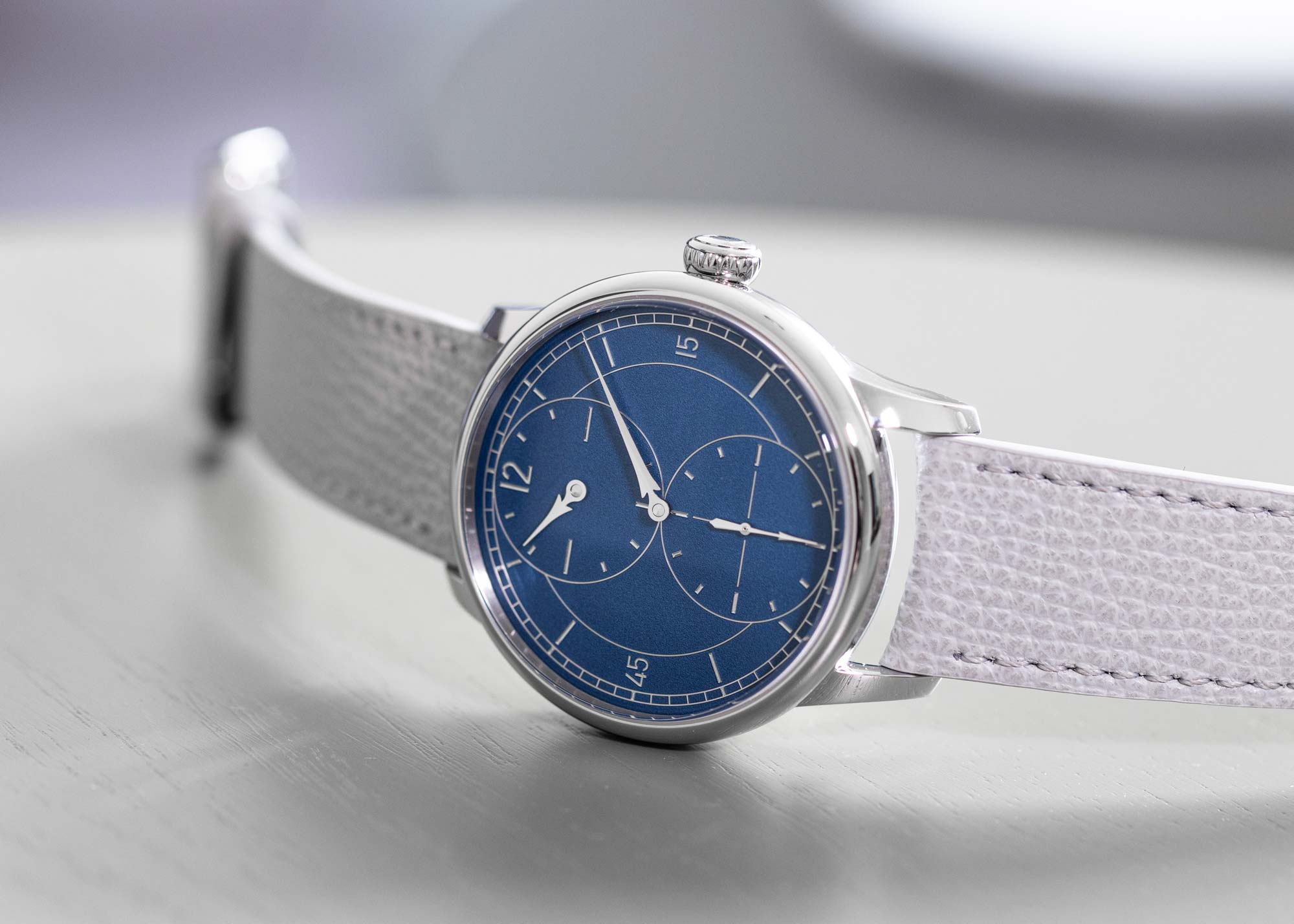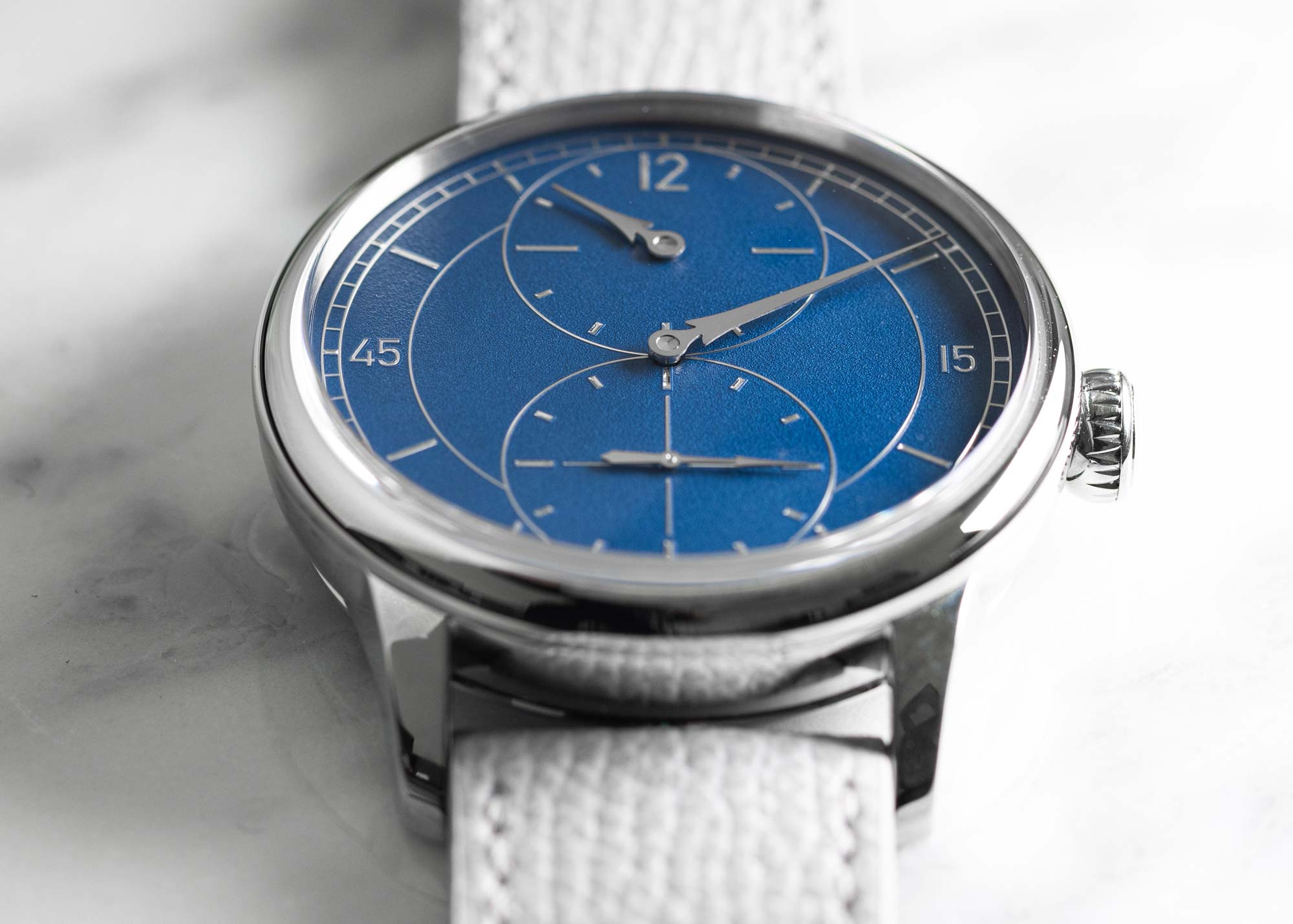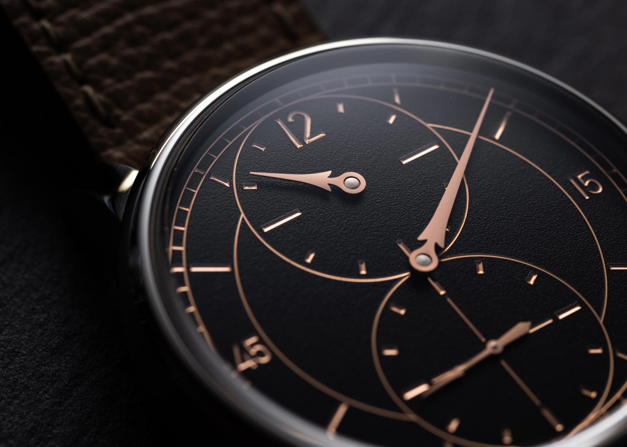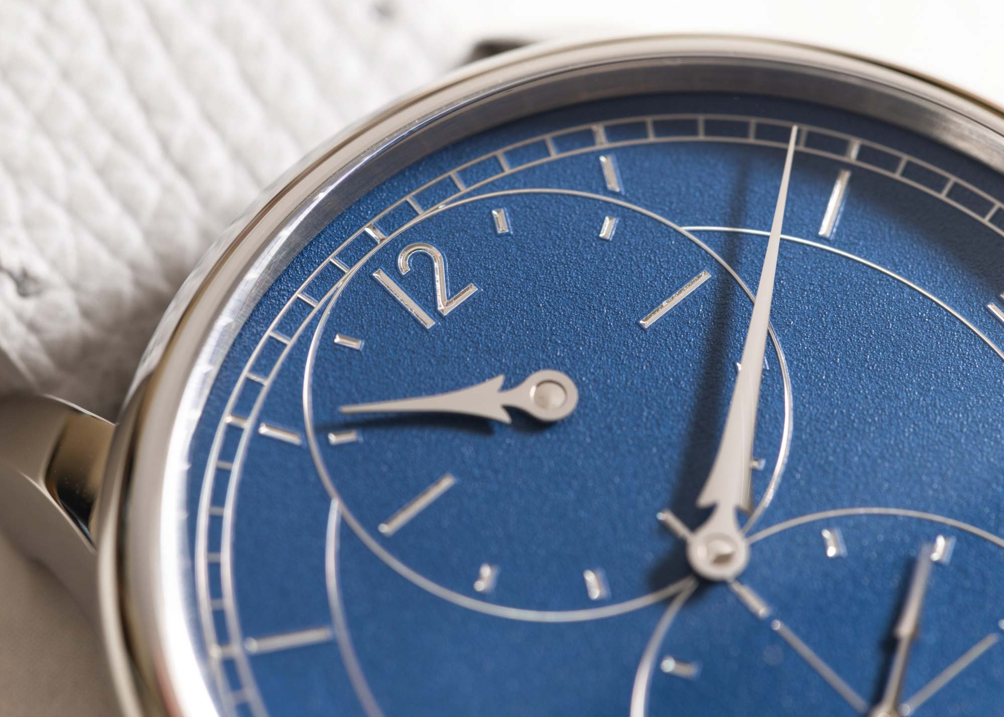 The new sector design adds extra precision to Louis Erard’s distinctive regulator layout. The outer minute track has been expanded for greater presence, creating an appealing moment of intersection with oversized hour and minute subdials. The additional lines are also well utilized to show off the engraving technique, while the layout fills the dial expanse of the 39mm x 45mm x 13.4mm case ideally. Two versions are currently available: Noir, which is black with rose gold accents, and Bleu, which is blue with rhodium accents.