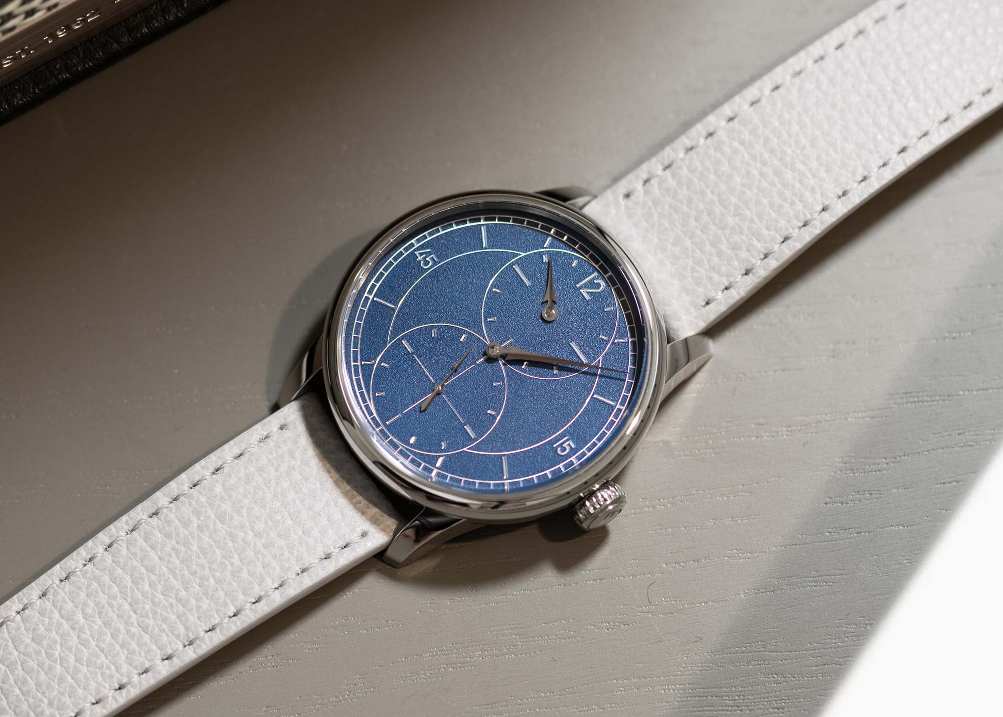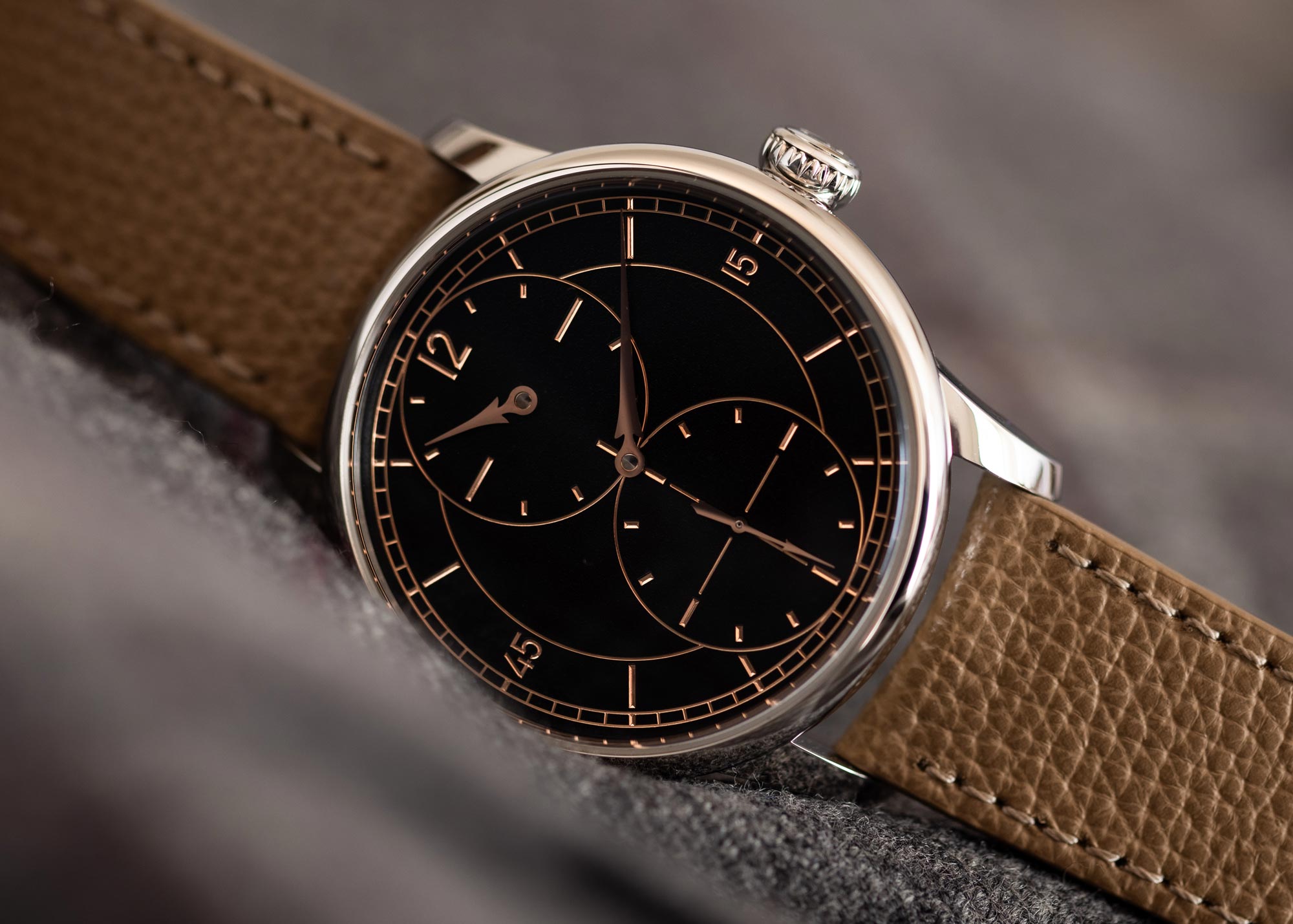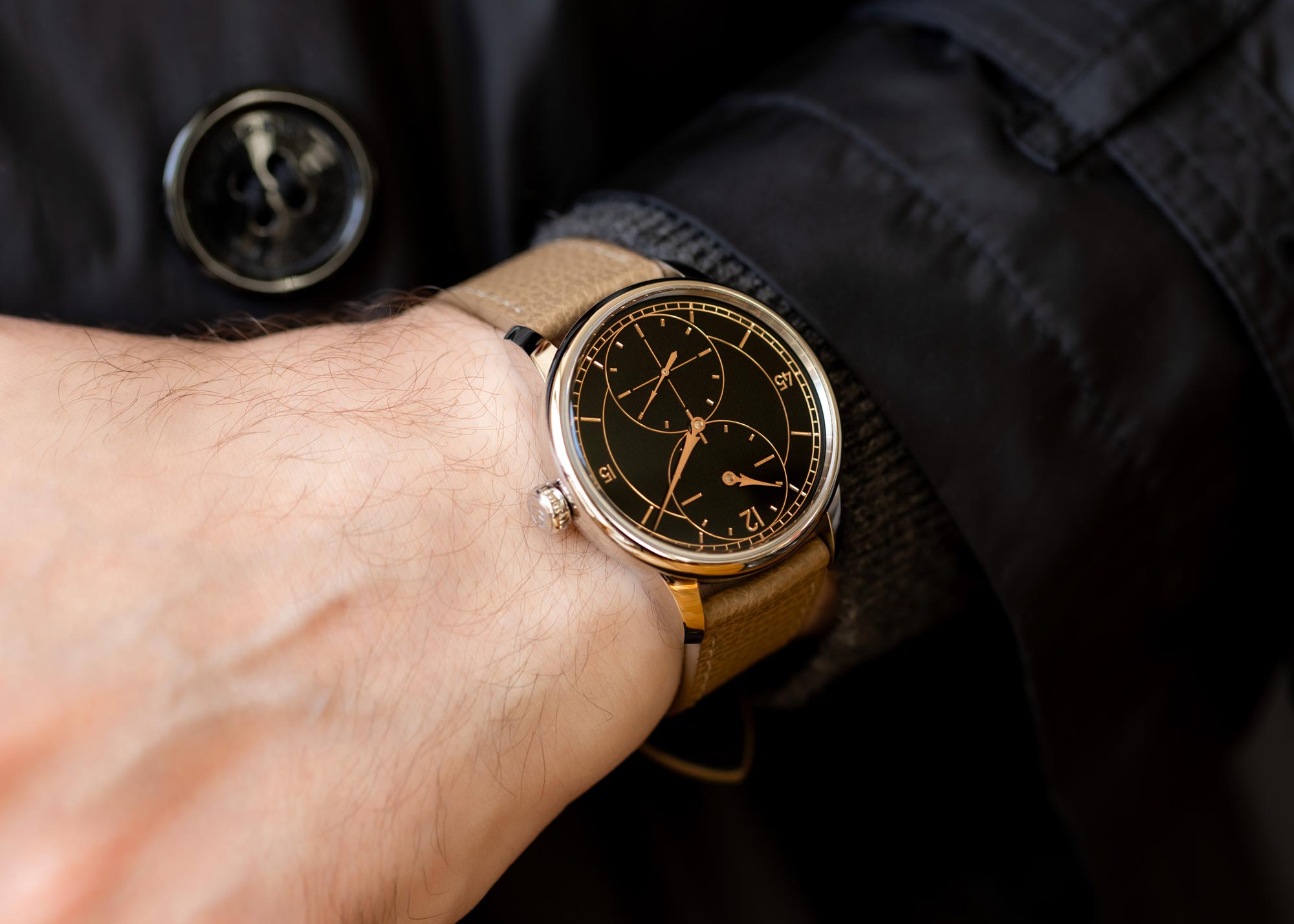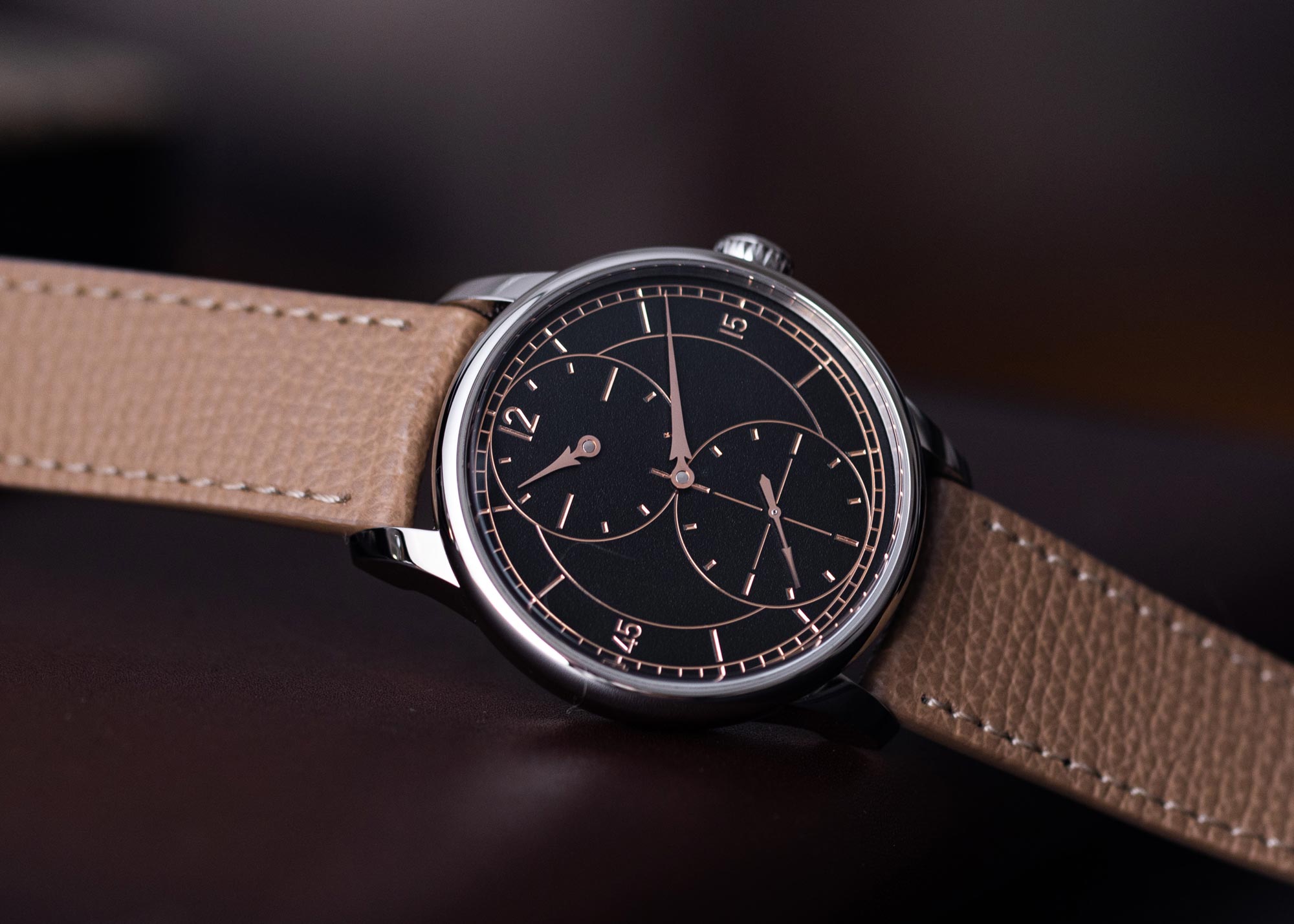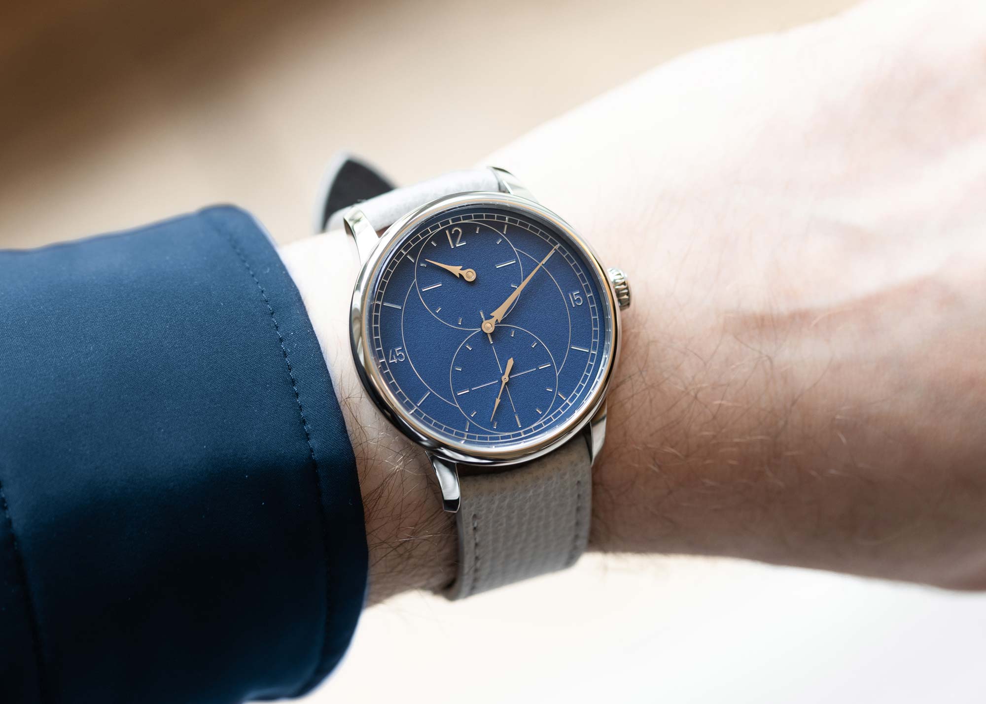 The new sector design adds extra precision to Louis Erard’s distinctive regulator layout. The outer minute track has been expanded for greater presence, creating an appealing moment of intersection with oversized hour and minute subdials. The additional lines are also well utilized to show off the engraving technique, while the layout fills the dial expanse of the 39mm x 45mm x 13.4mm case ideally. Two versions are currently available: Noir, which is black with rose gold accents, and Bleu, which is blue with rhodium accents.