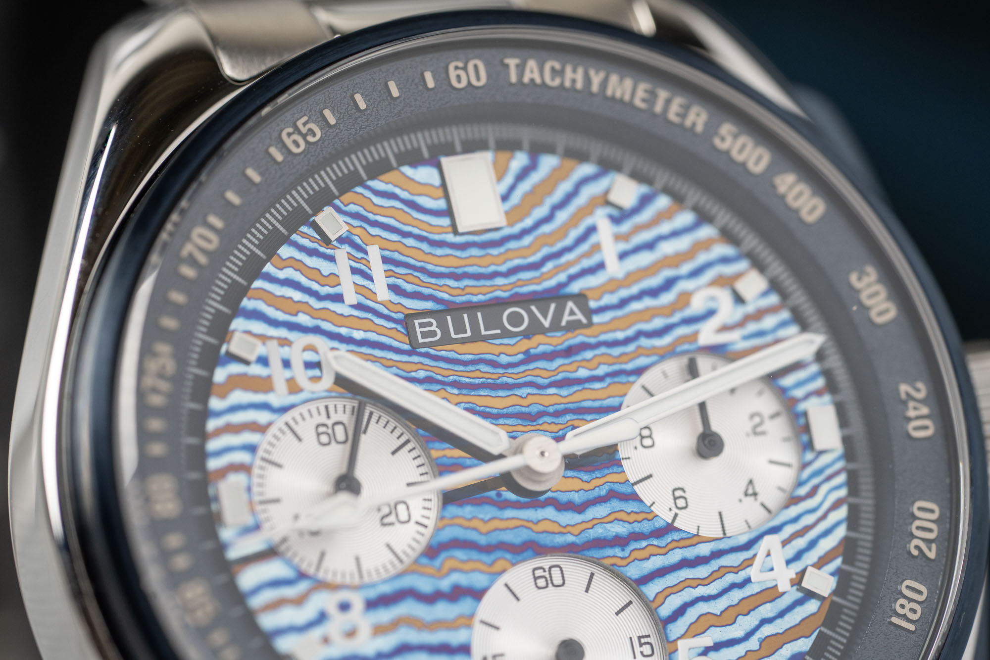 At the heart of this limited-edition piece is a mesmerizing Timascus dial—titanium folded through the Damascus process to produce a striking, naturally occurring pattern, no two exactly alike. Housed in a 43.5mm silver-tone stainless steel case, the dial is framed by a blue tachymeter ring and accented by slim blue chronograph pushers and a crown etched with Bulova’s iconic tuning fork logo. Luminous hands and silver registers track elapsed time with 1/20th second precision, powered by Bulova’s 262kHz high-performance quartz movement, known for its sweeping chronograph hand and extreme accuracy.