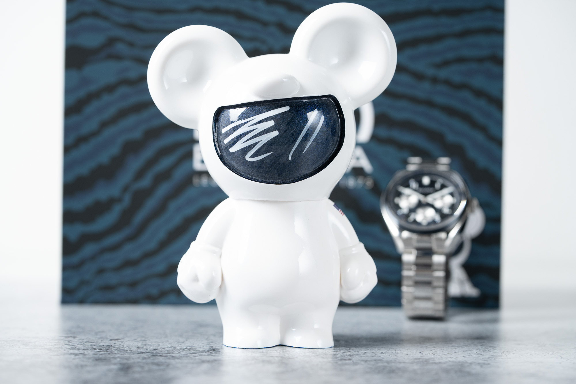 Presented on a matching three-link stainless steel bracelet, this limited edition includes a numbered case back engraved with Rosinhole’s whimsical Budii figure and arrives in special packaging featuring a storybook and a 6-inch collectible Budii figurine created exclusively for this release. Limited to 5,500 pieces worldwide, the Lunar Pilot x Rosinhole is a dynamic fusion of heritage, design, and artistry—a watch built for the explorer with a creative edge.