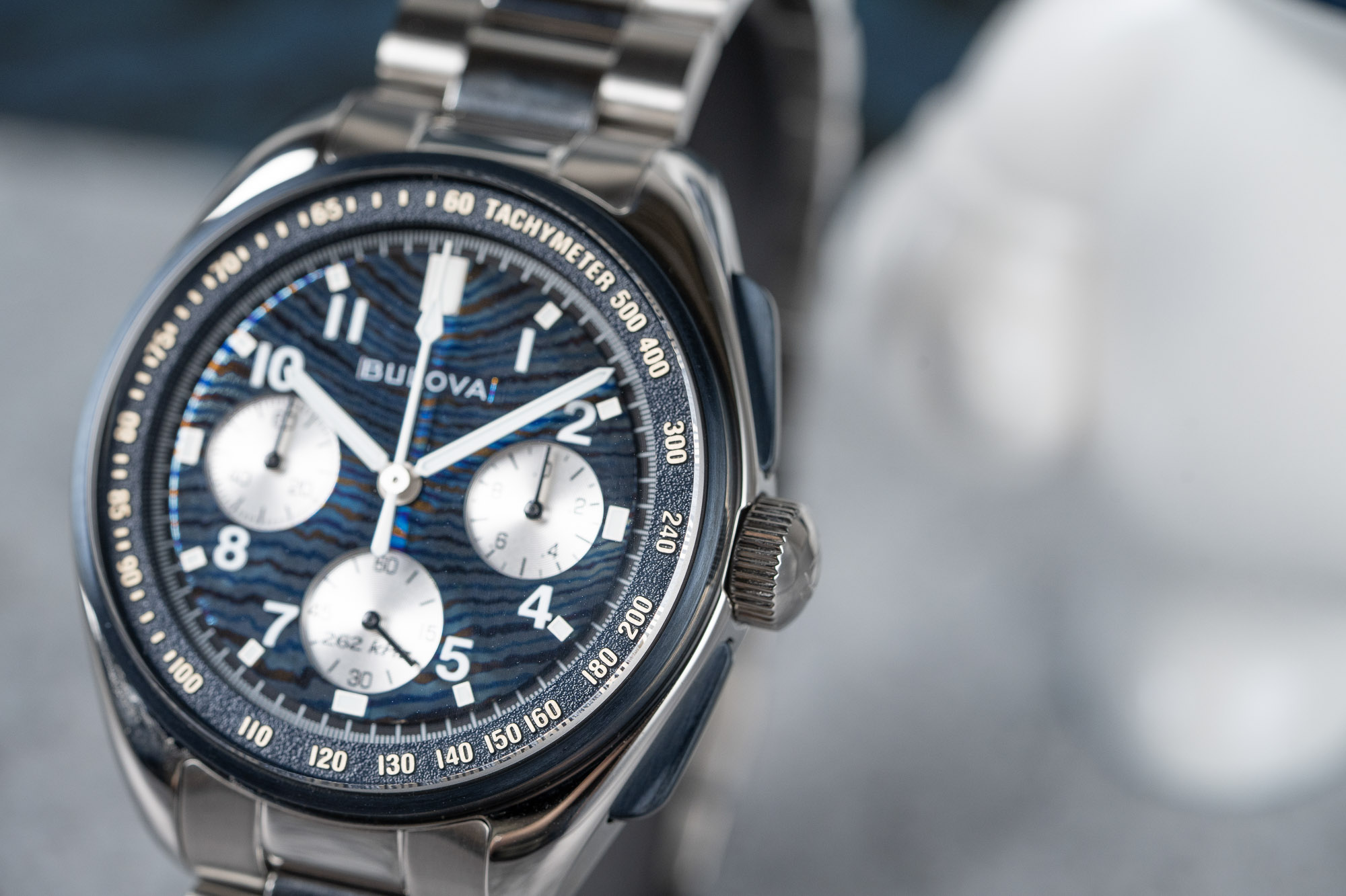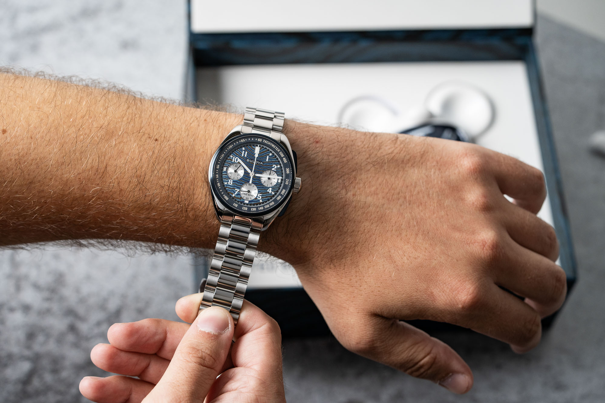 - Pushers & Crown: Blue chronograph pushers and tuning fork crown