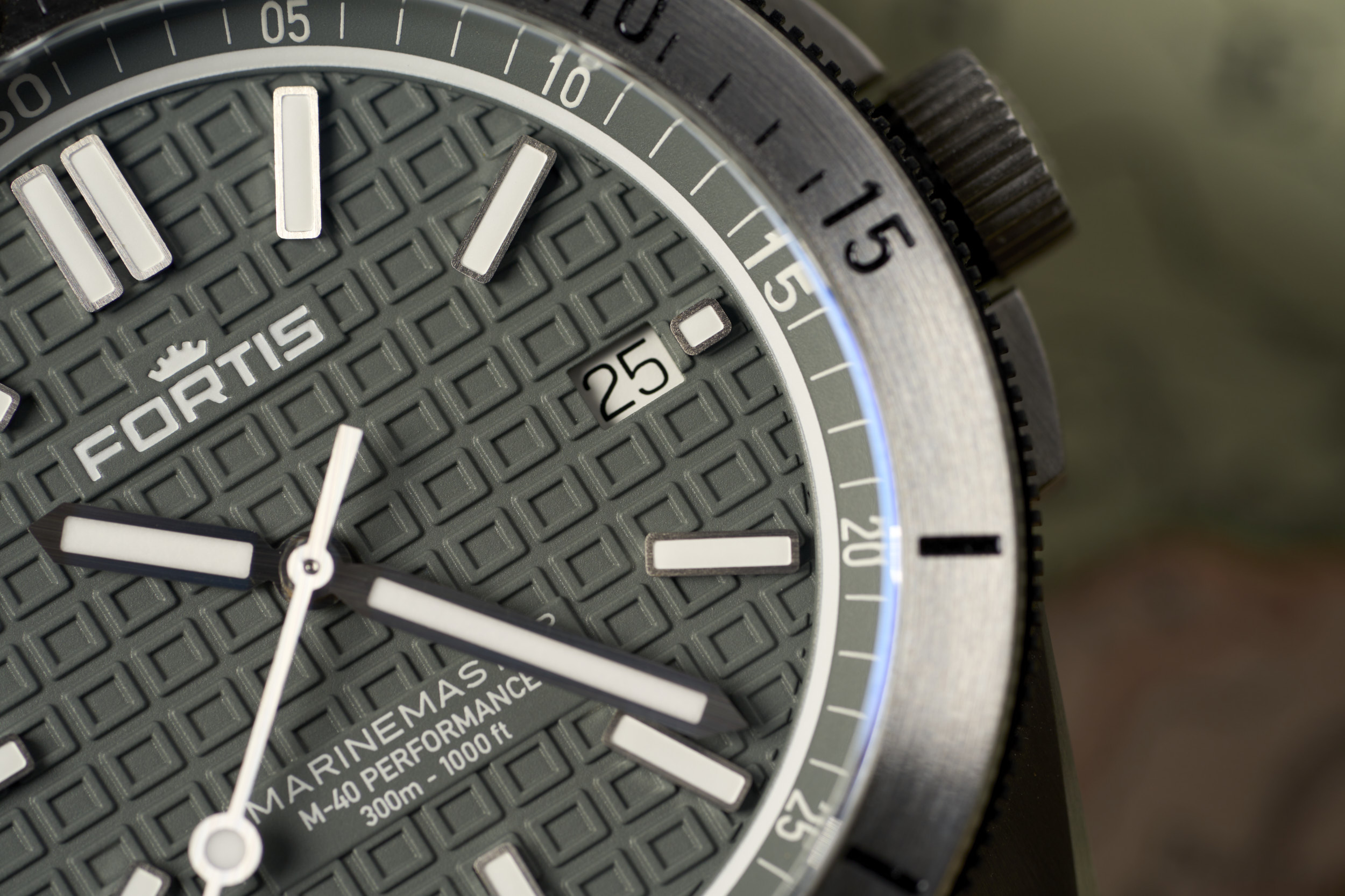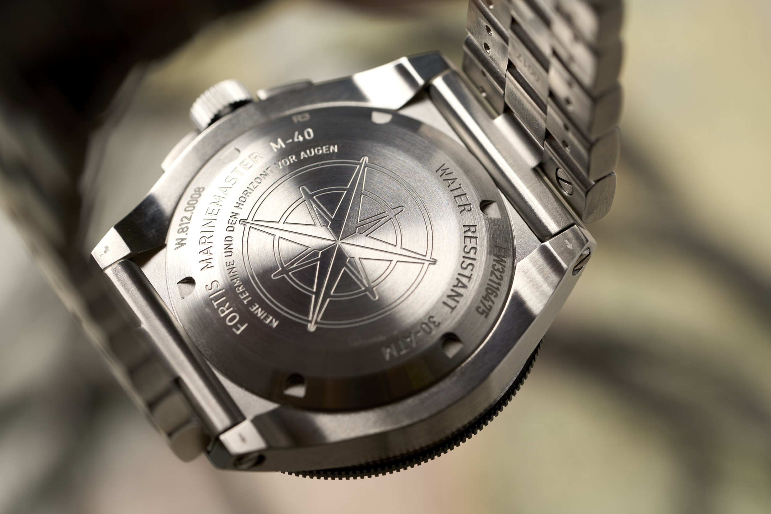 Inside the M-40 is a UW-30 automatic movement, based on the Sellita SW-200. This reliable Swiss made movement has a central hour, minute, and second hand with a date at the three o’clock position. It features hacking, hand-winding, and a 38-hour power reserve. Other features include a 26-jewel count and frequency of 28,800 beats per hour for a smooth sweeping seconds hand.