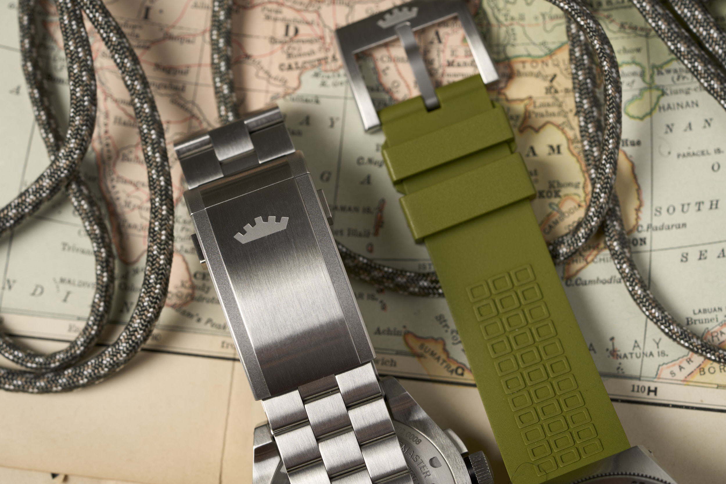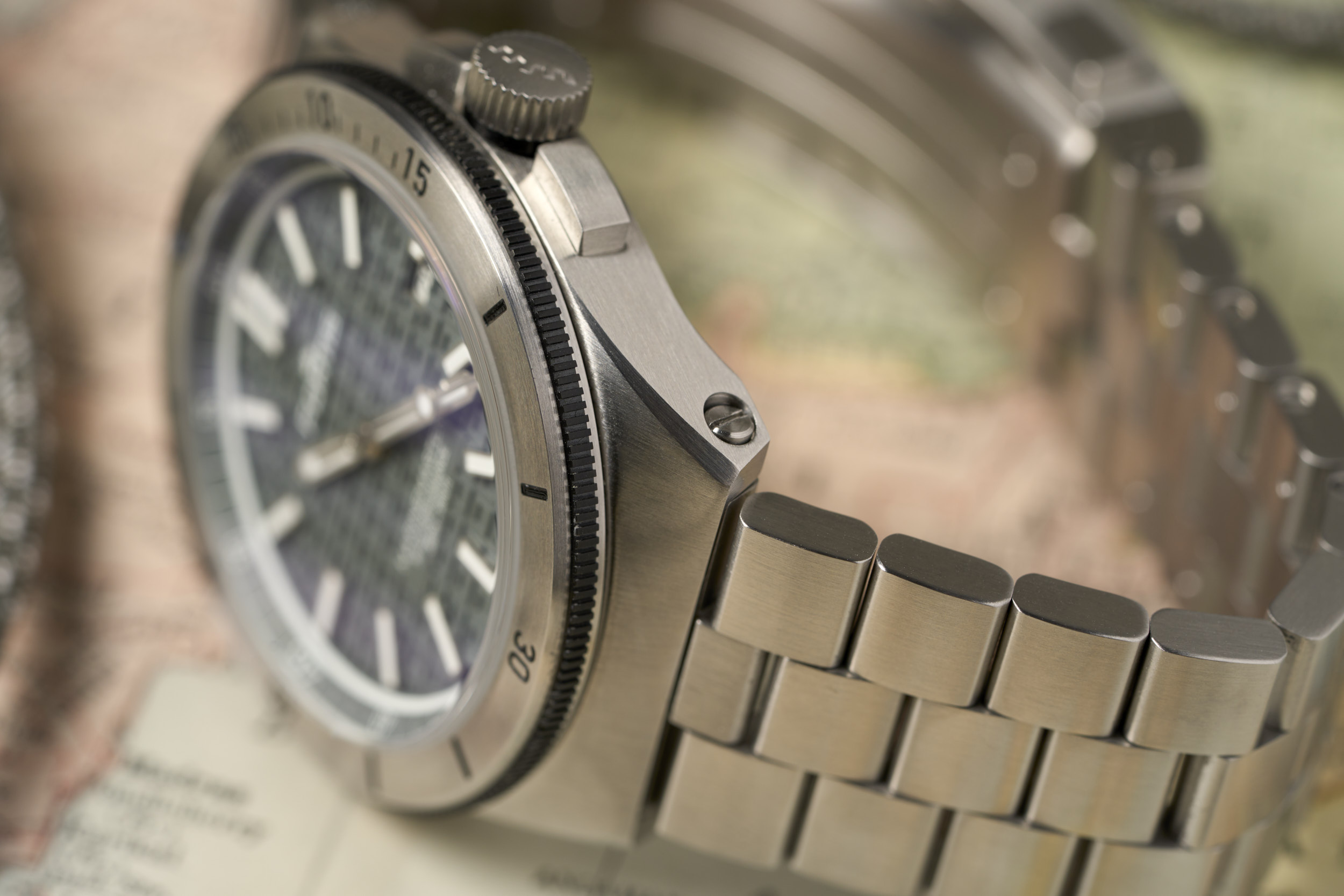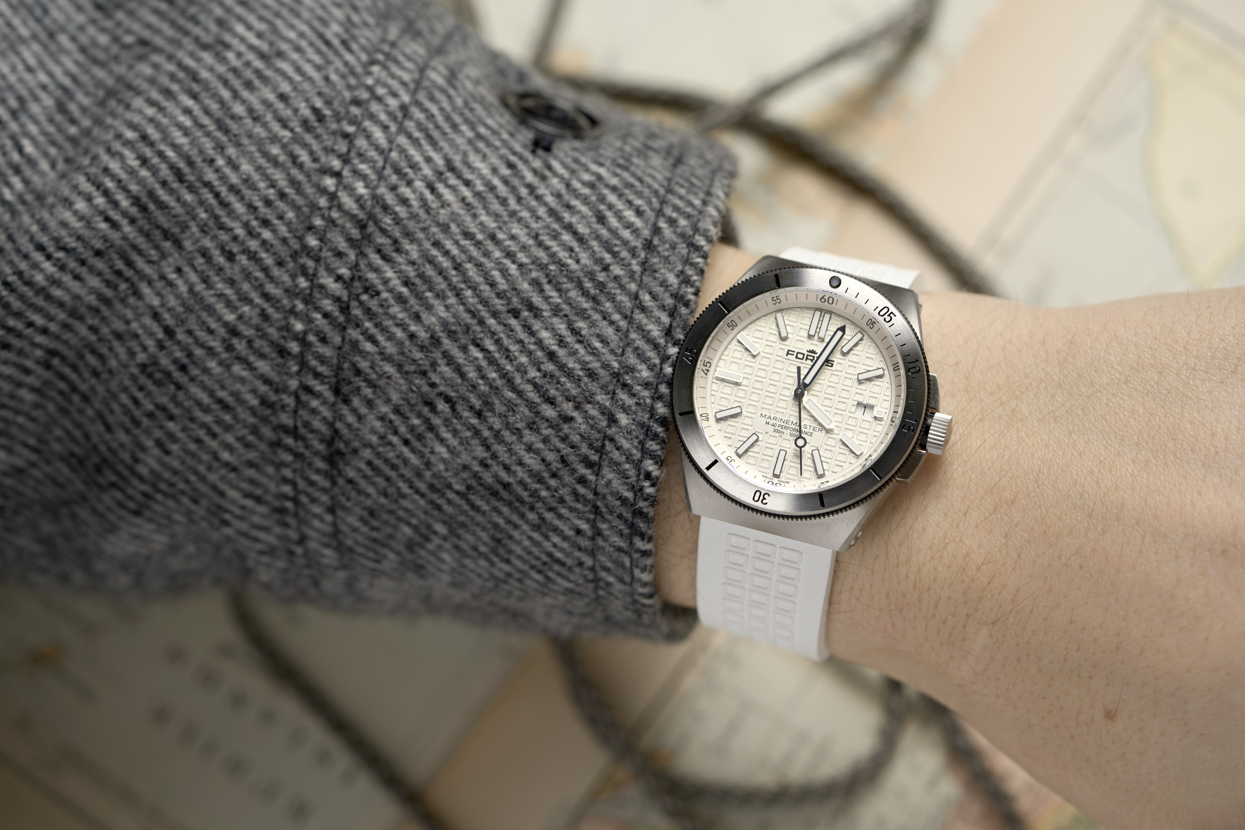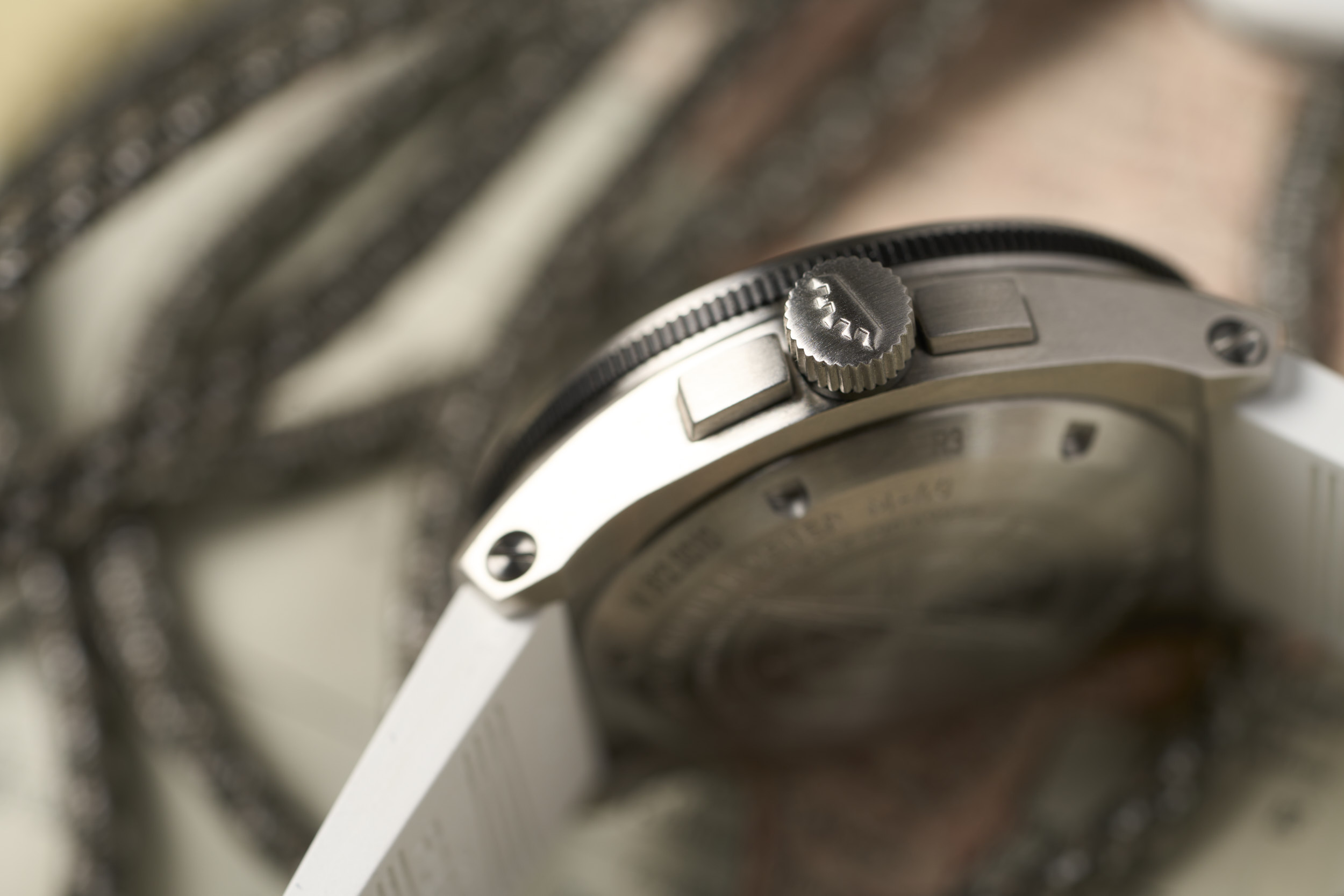 The M-40 model of the Marinemaster is 40mm at the diameter and 43mm from lug-to-lug. It strikes a similar silhouette to the M-44, but in a scaled down package. The case is rated 300m water resistant and features a uni-directional, 120-click elapsed time bezel. Furthermore, details from the dial are carried over to the rubber horizon strap. Optionally, you can equip your Marinemaster with a stainless steel block bracelet.