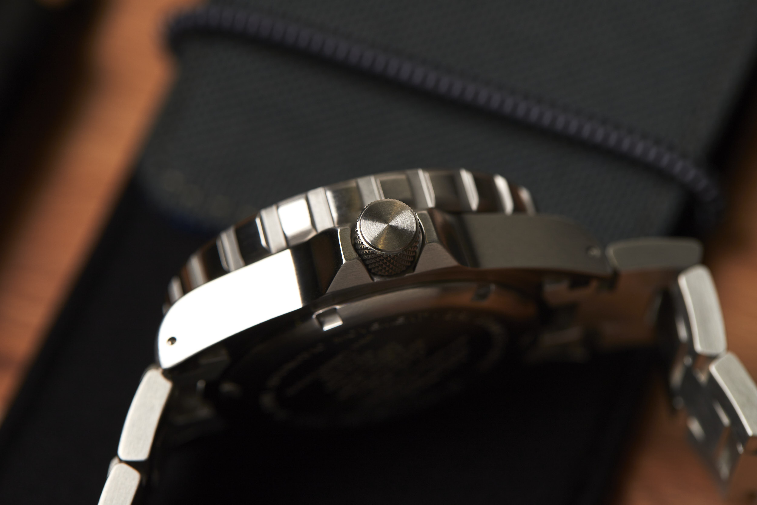 Measuring in at 41mm wide by 14mm thick, the 316L case is stout, with a solid wrist presence. On the side of the case, you’ll find a knurled screw-down metal crown with beefy guards that helps keep the case watertight to a full 300m. Up top, is a unidirectional rotating dive bezel with a wide-toothed edge. The dial is right in line with what you’d expect from a military dive watch — clean and legible with a 12- and 24-hour scale. Bold contrasting color hands really pop out from the surface of the dial. It also features constantly glowing Tritium gas tubes for unparalleled low-light visibility.