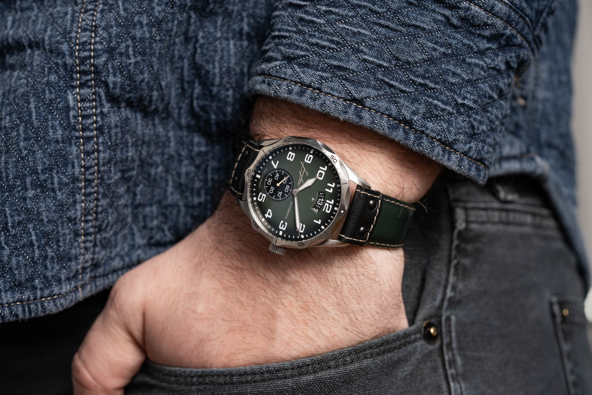 The watch features a striking dark green dial with large Arabic numerals for exceptional legibility, and a small seconds sub-dial with a red hand for a dynamic touch. The bi-directional rotating bezel with a luminous dot enhances its practicality. The stainless steel case measures 43.3mm in diameter and 12.5mm in height, while the green and black leather strap ensures comfort and style. Additionally, the Meister Pilot is water-resistant up to 100 meters, making it versatile enough for various activities.
