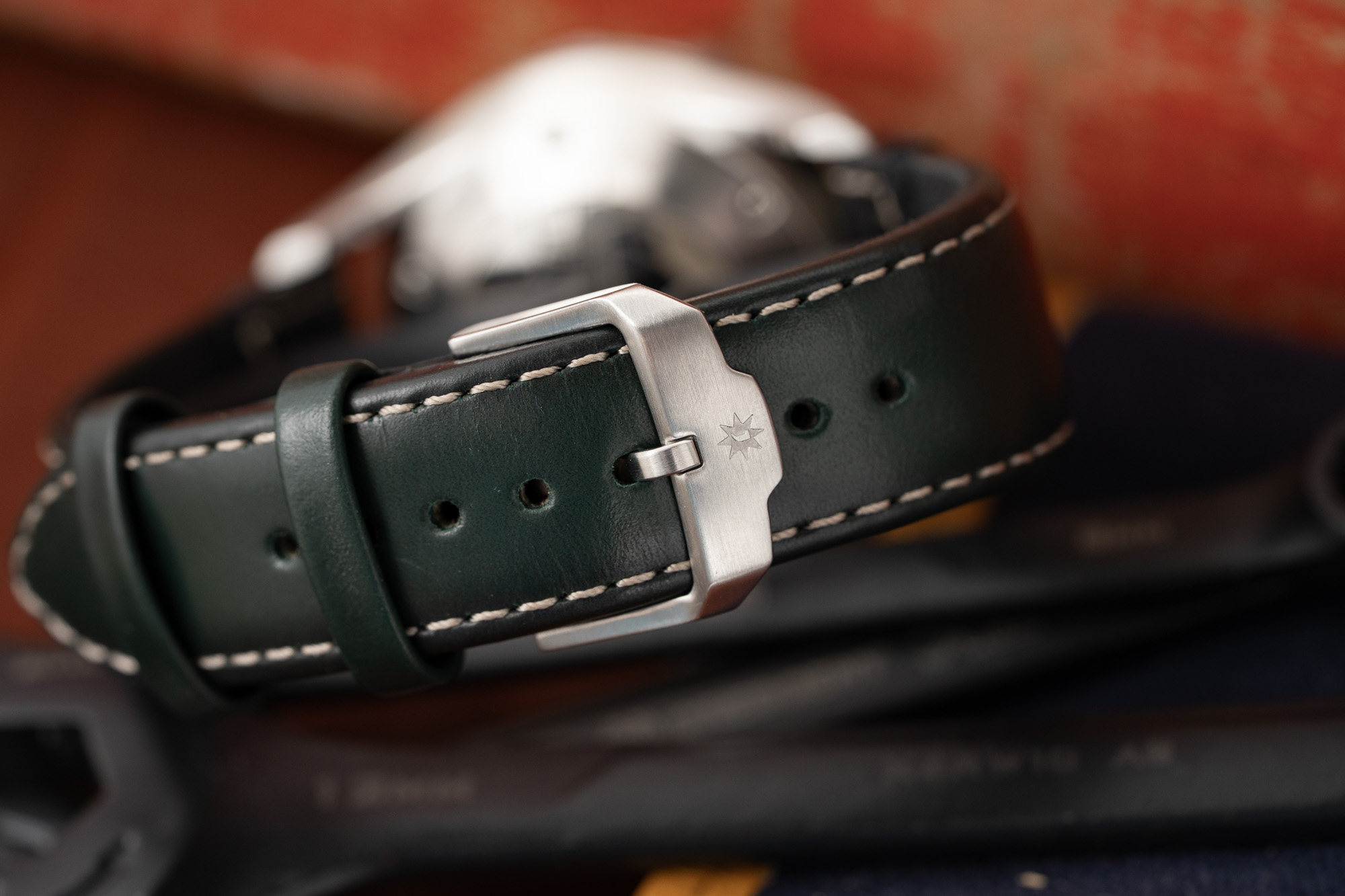 - Strap: Green/Black Leather
