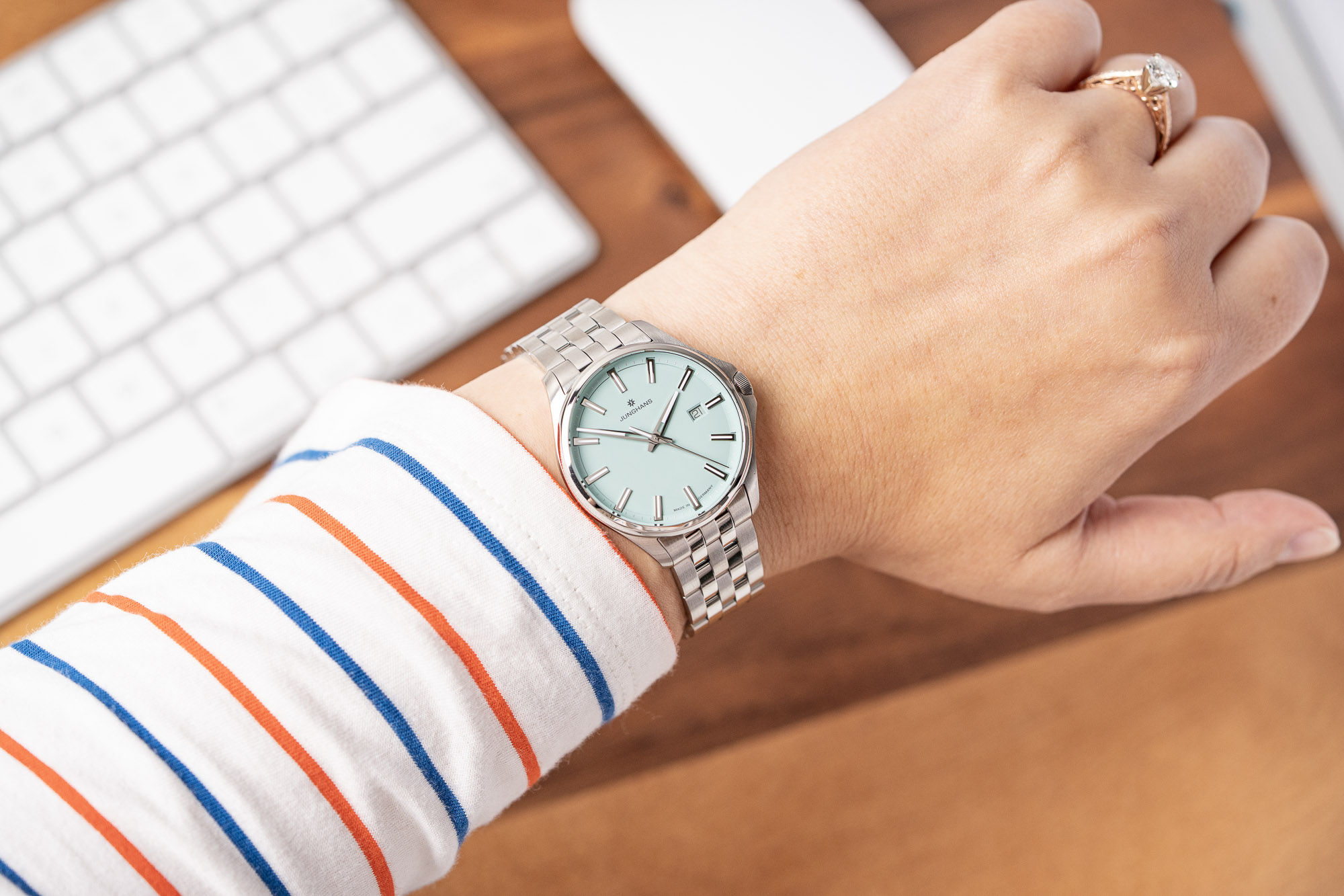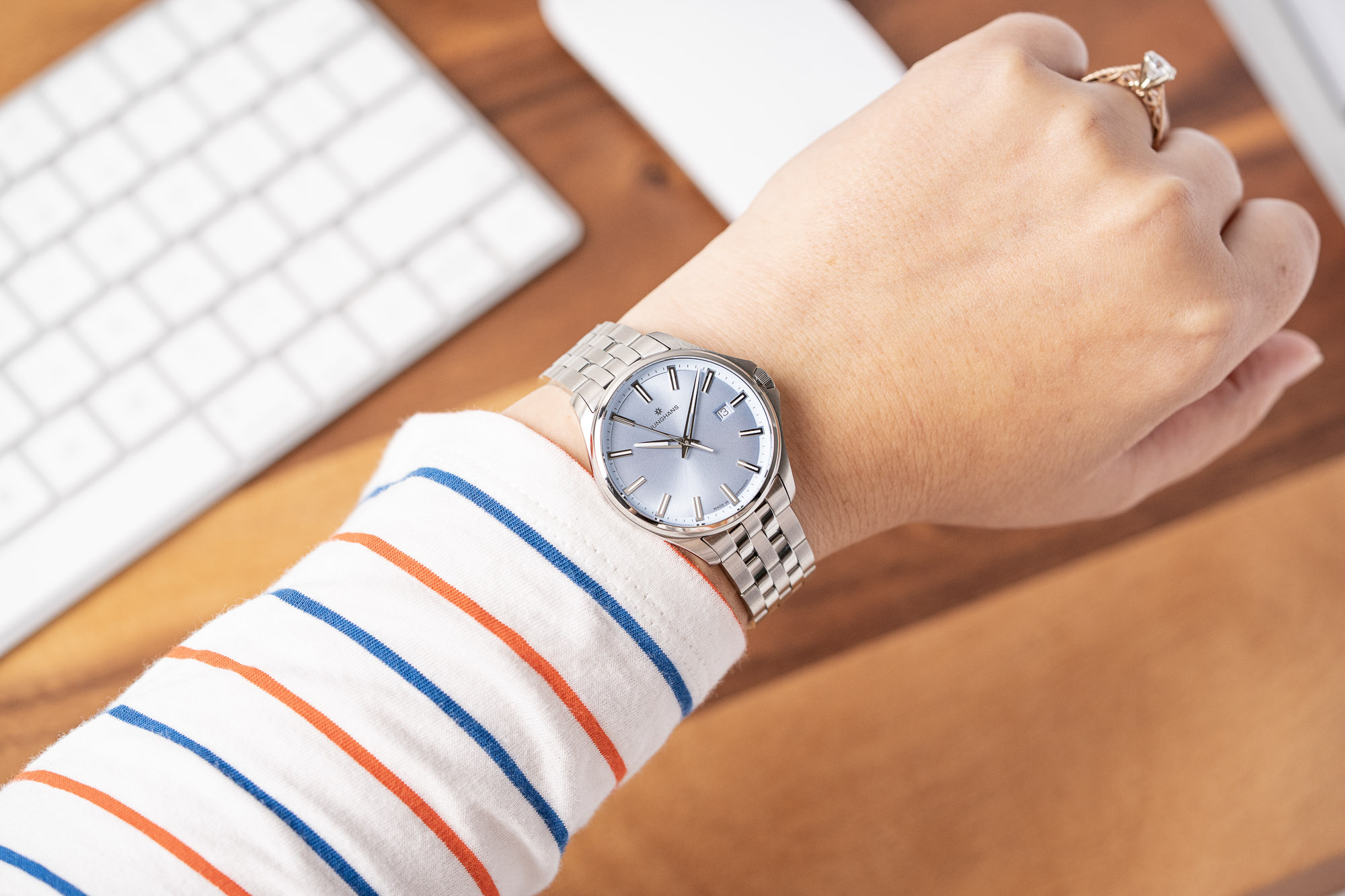 At just 8.75mm thick, the stainless steel case sits comfortably and unobtrusively, yet retains a presence thanks to its satin-brushed surfaces and polished accents. The five-link stainless steel bracelet further enhances wearability with its smooth articulation and folding clasp, giving the piece a balanced, fluid look. With a screw-down caseback and 10 bar (100m) water resistance, the Meister S Quartz 35 isn’t just refined—it’s ready for daily life.