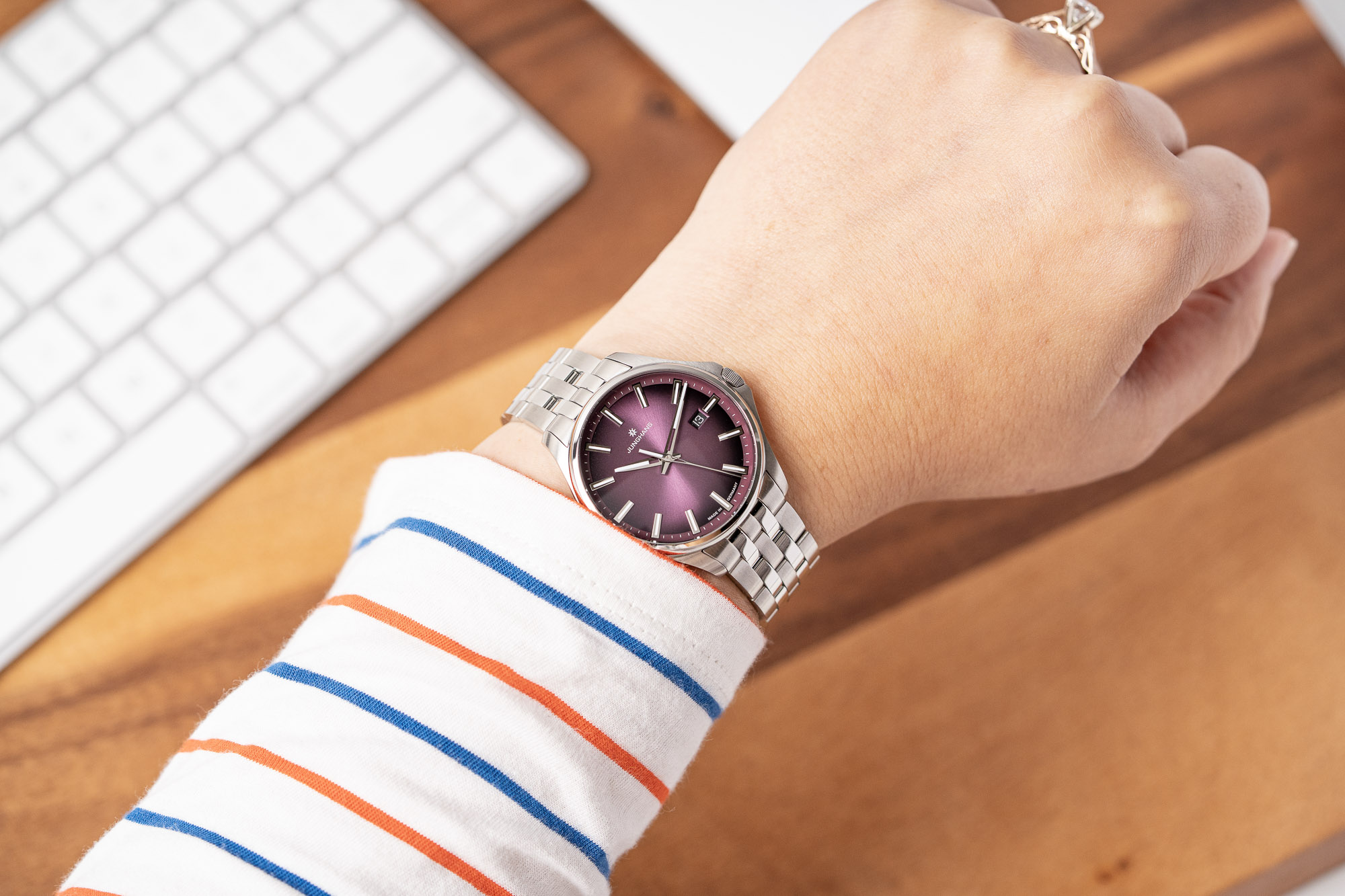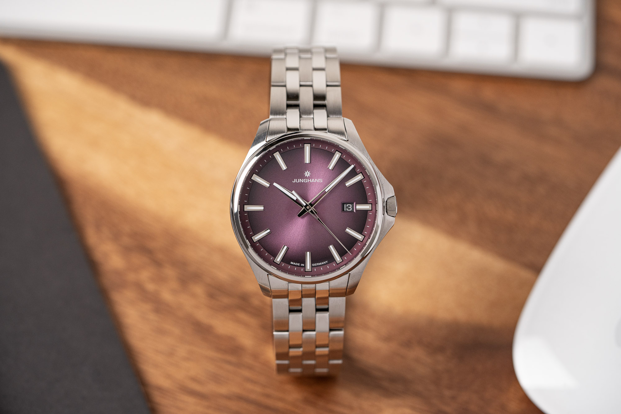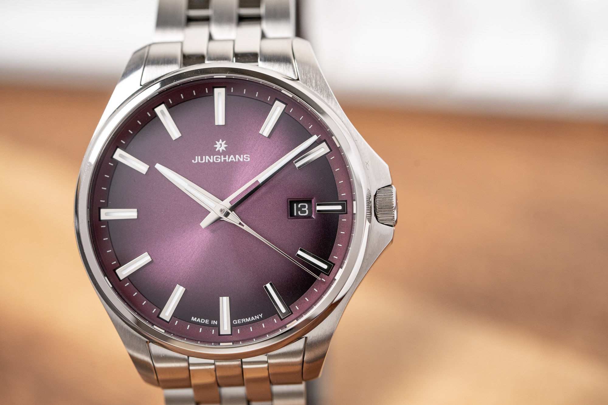Designed with a keen eye for both proportion and practicality, the Junghans Meister S Quartz 35 collection brings a sporty, contemporary energy to the brand’s historically elegant Meister series. Compact at 35mm, each reference presents a dynamic dial—whether in green lacquer, purple lacquer, or ice blue sunburst—that adds character without overwhelming the wrist. The applied luminous markers and partially skeletonized hands ensure daytime legibility and nighttime clarity, all housed under a domed sapphire crystal with anti-reflective coating.