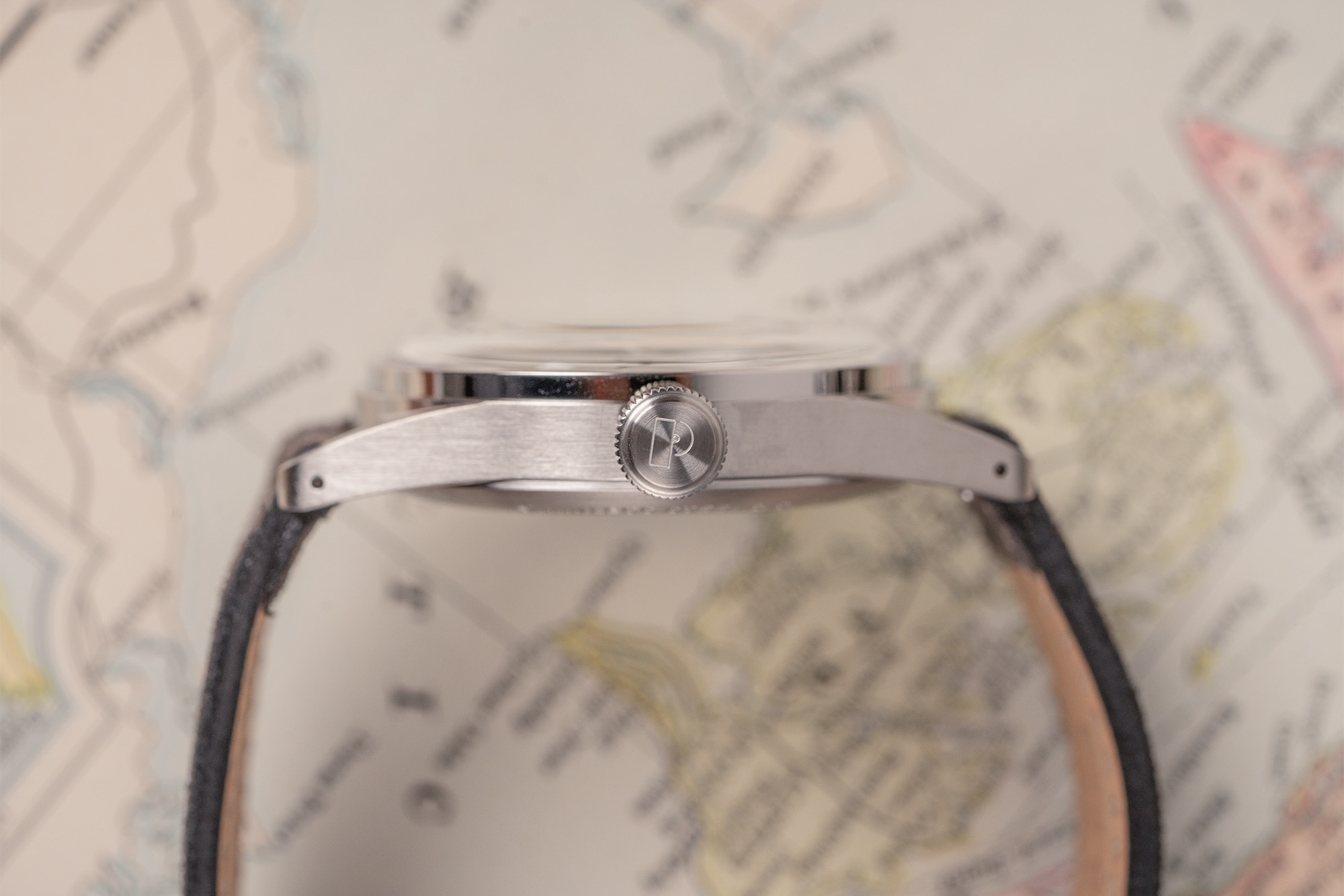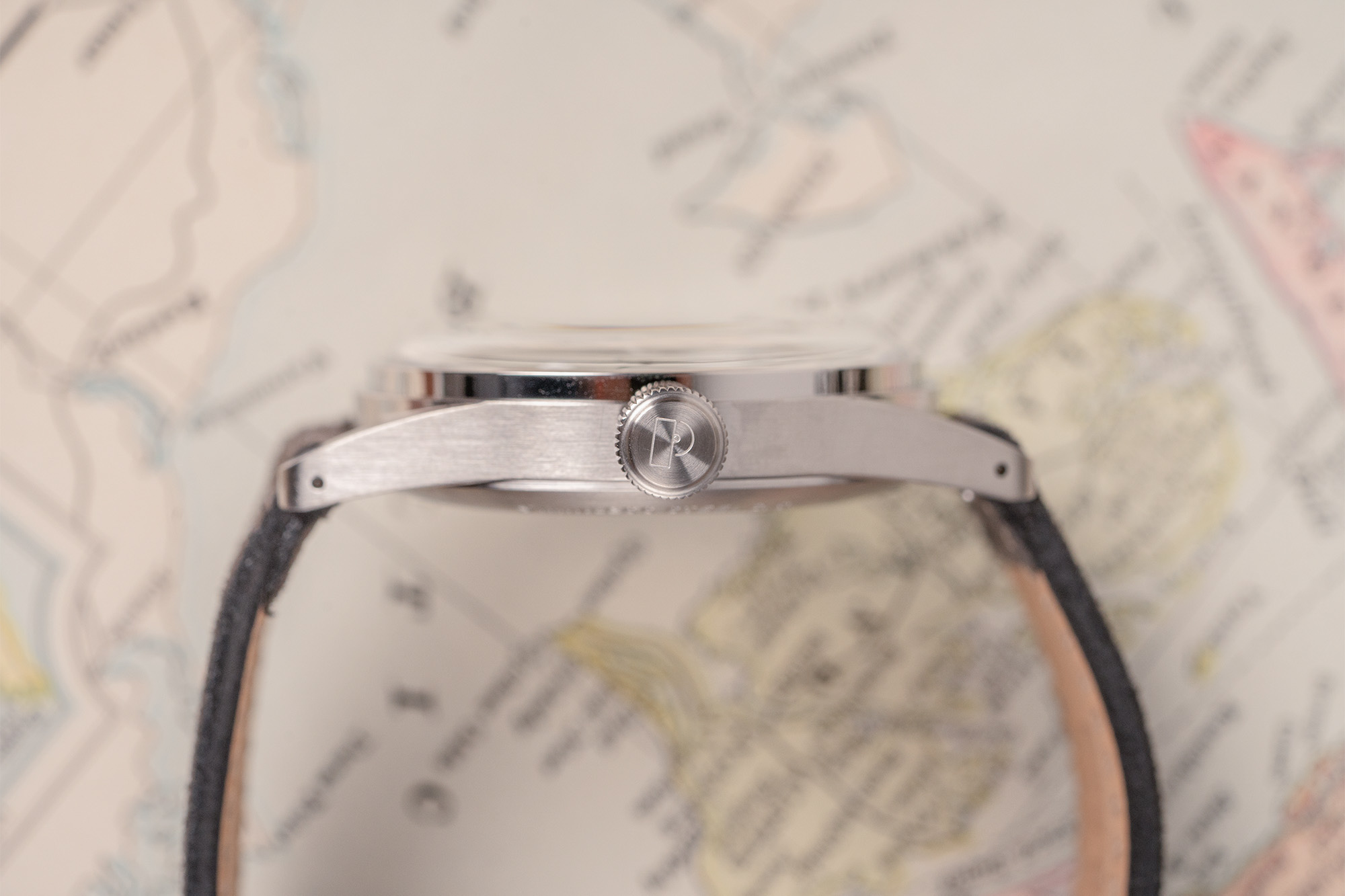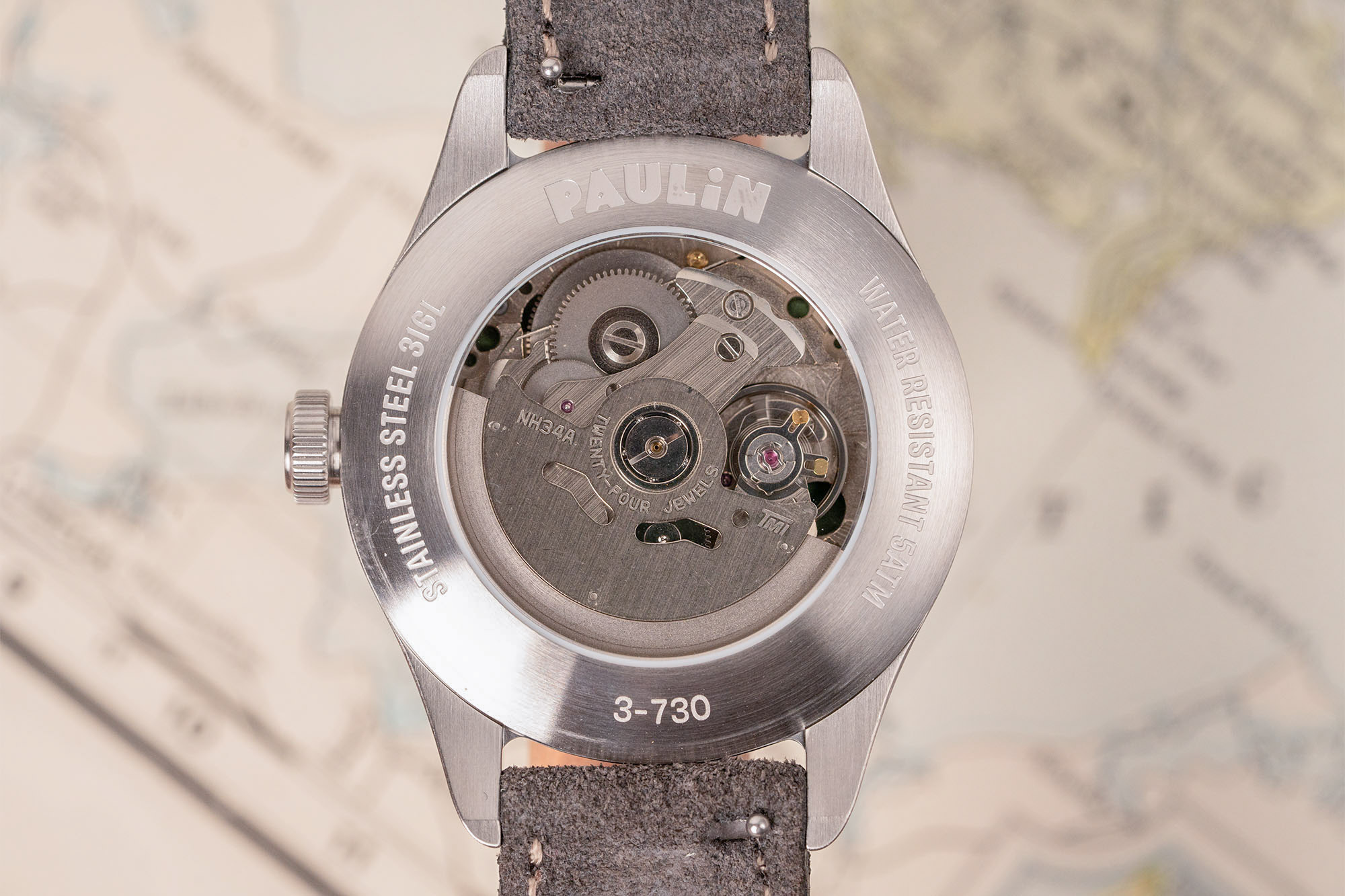 The Neo GMT swaps the original’s Seiko NH35 for a NH34A, modified to remove the ghost date complication. A Japanese-made automatic movement, it features an independent “caller” GMT complication, 24 jewels, hacking, hand winding, small seconds, a frequency of 21,600 beats per hour, and a power reserve of at least 41 hours.