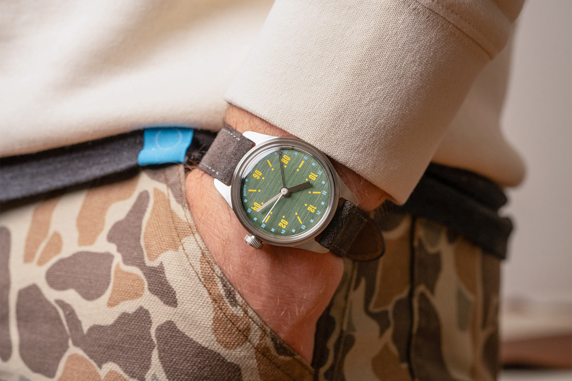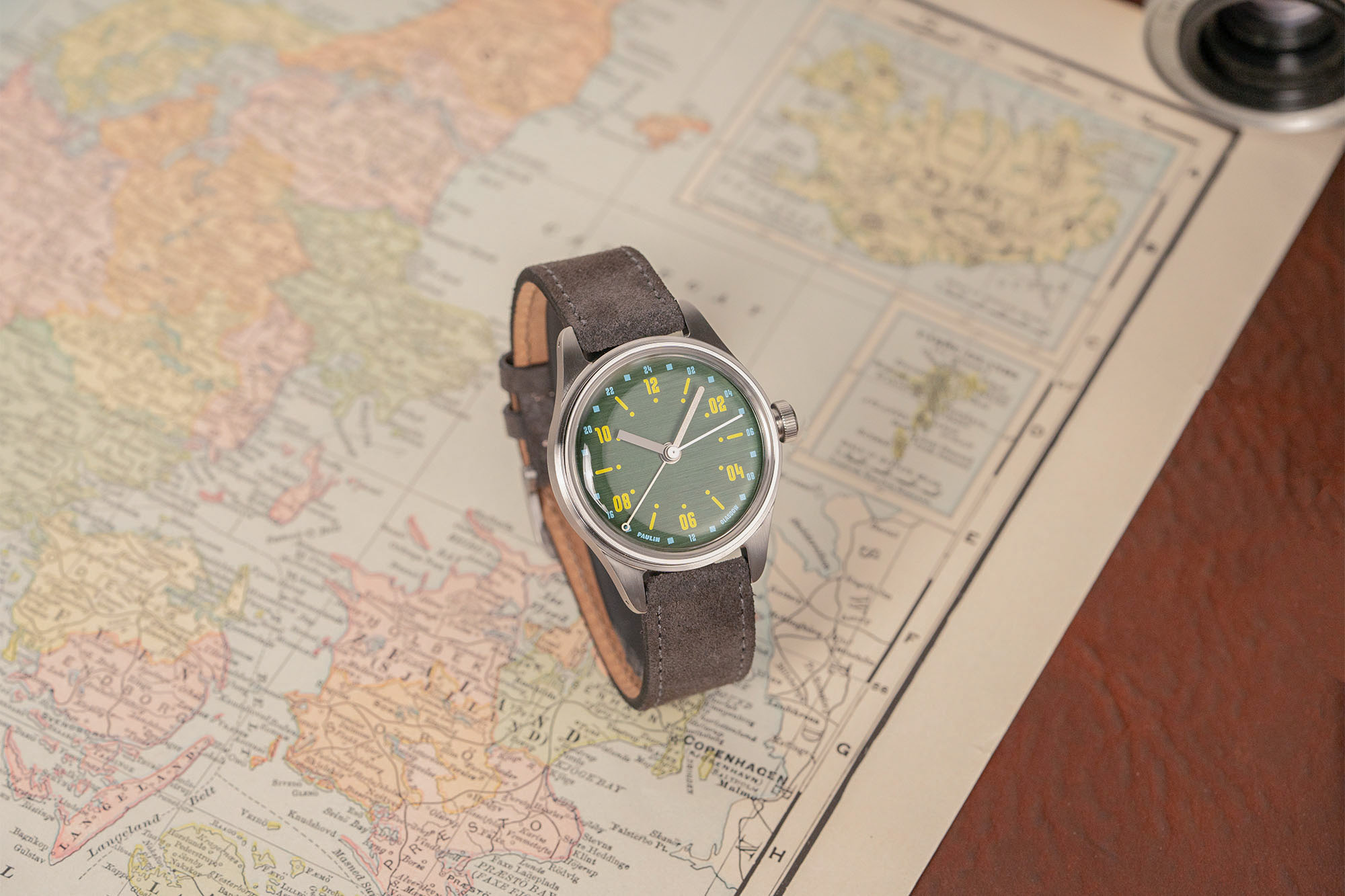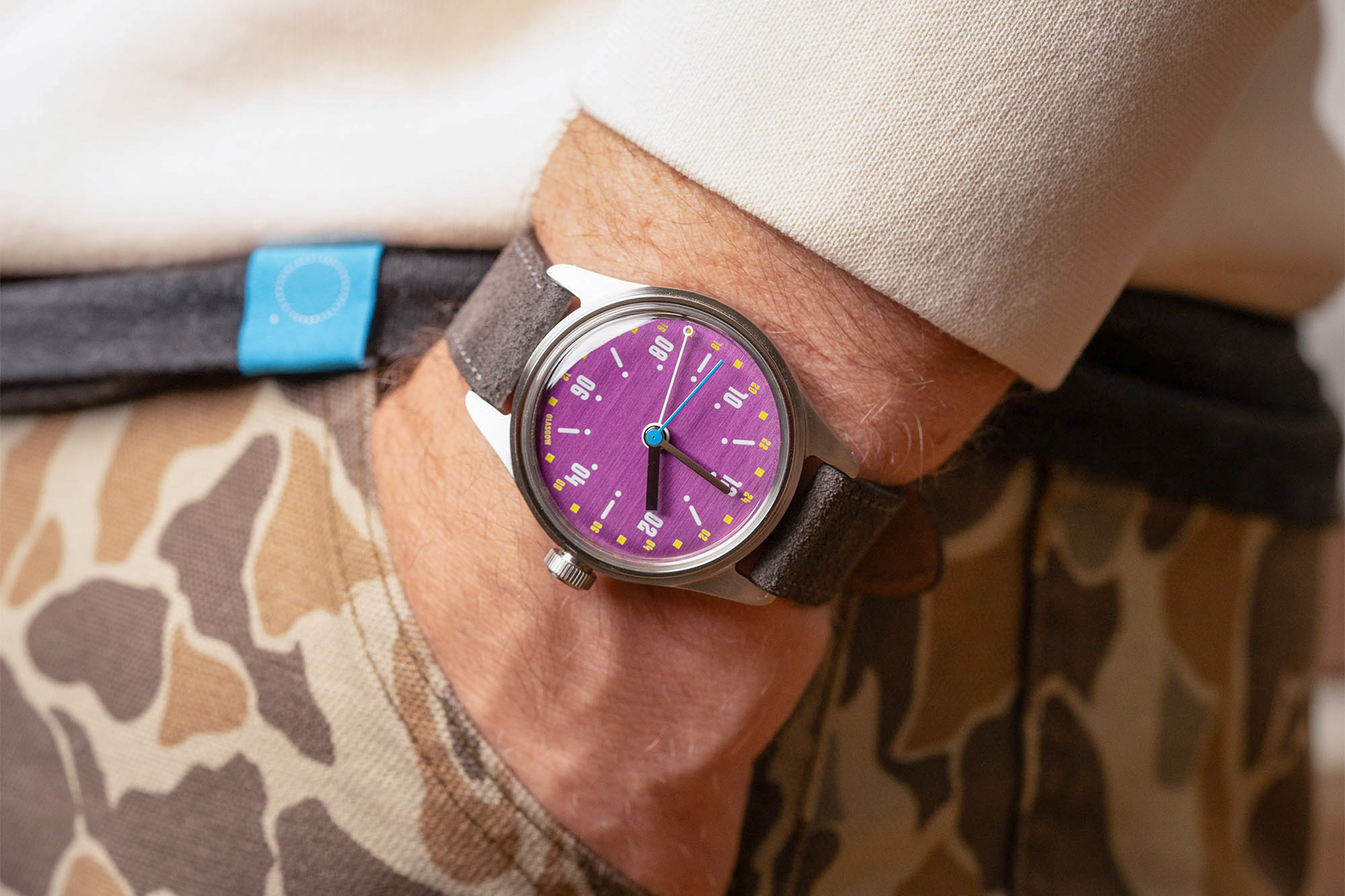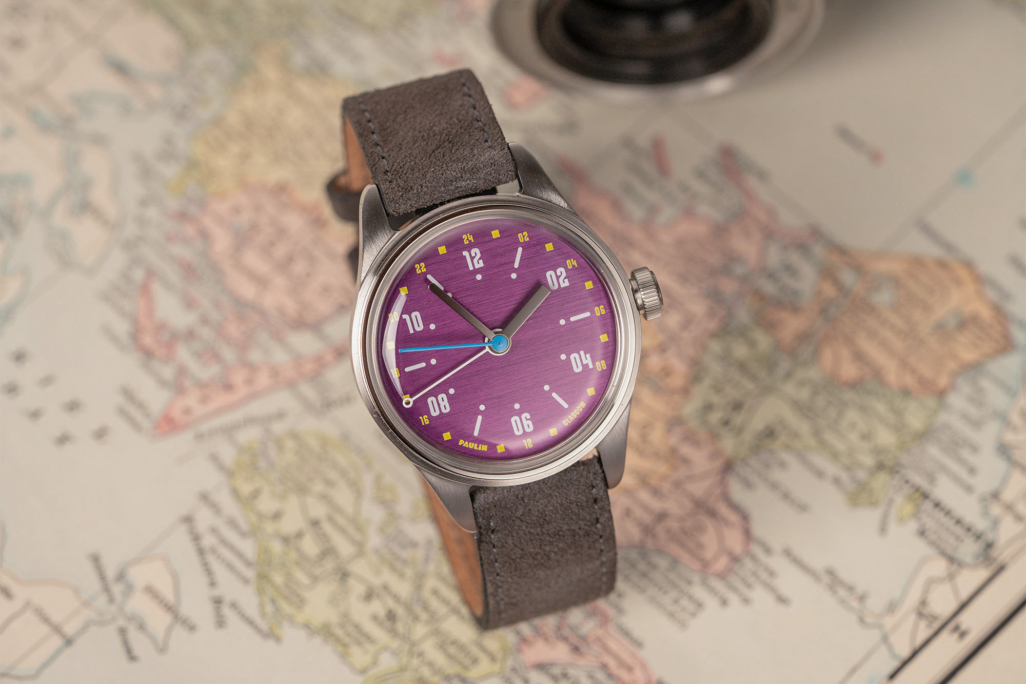The new Neo GMT features the same imminently wearable 38mm stainless steel case, 50m of water resistance, and hesalite box crystal that fans of the brand have come to love; even the thickness is unchanged. Where it differs is the new 24-hour hand independently tracking an additional time The GMT B features a rich olive green dial with yellow, blue, and grey accents, while the GMT C features a vibrant fuchsia dial with white, yellow, and blue accents. Both dials are manufactured in the UK from dyed anodized aluminum, a Paulin signature. Both come standard with a charcoal grey suede strap.