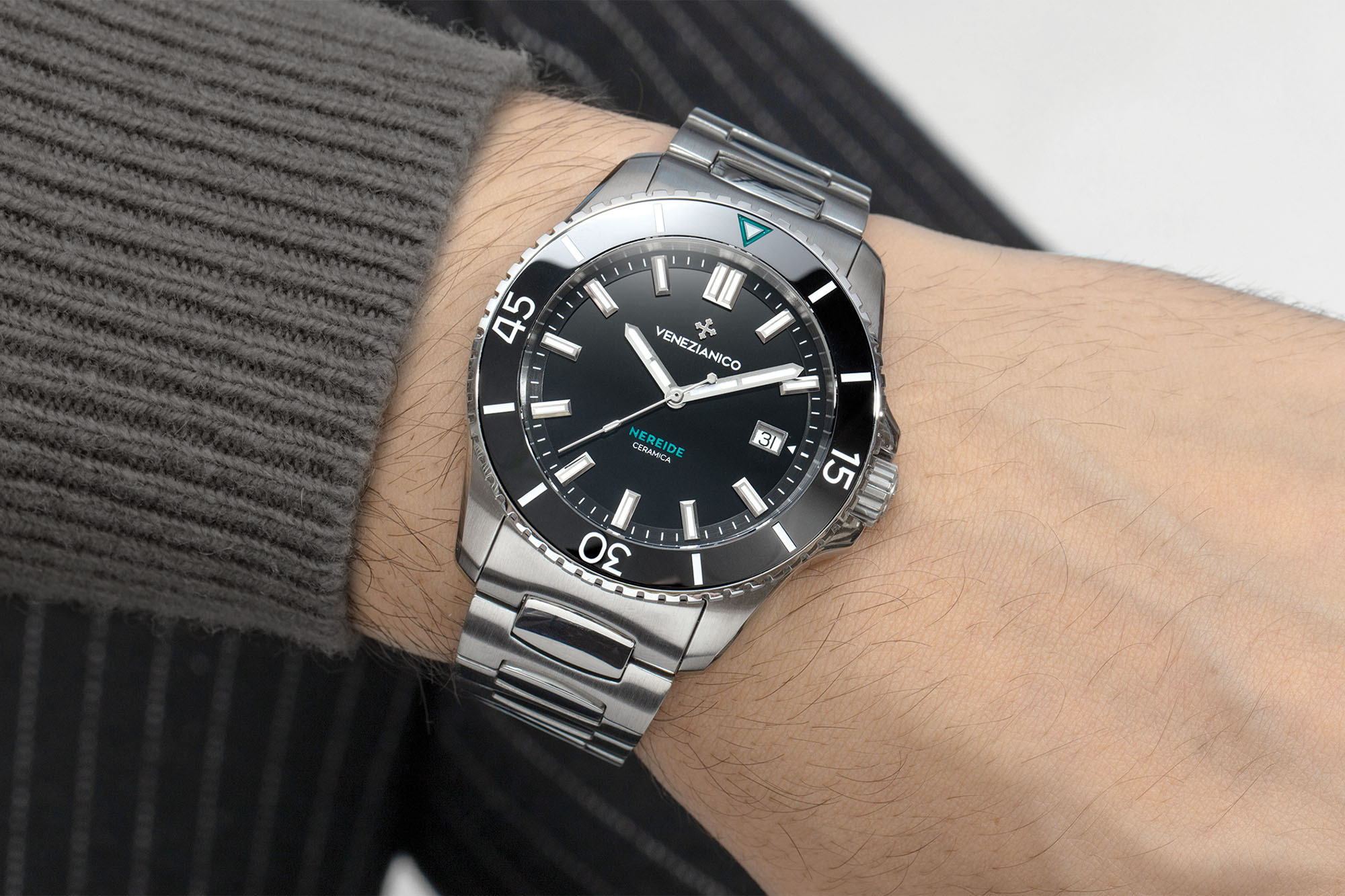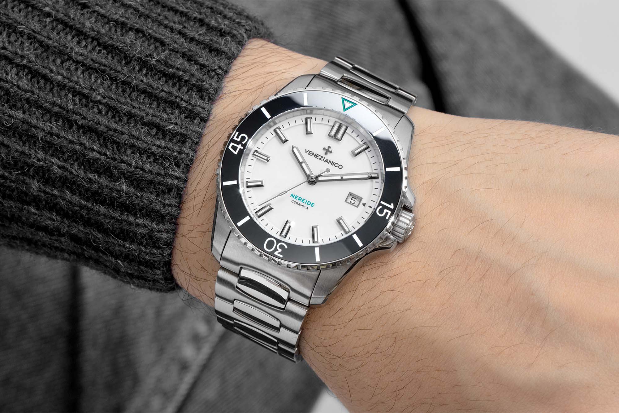 Their dive watch, the Nereide (or “Sea Nymph”), is fittingly inspired by the Venetian-built submarine of the same name launched in 1913. The 42mm Ceramica is one of the most traditional in the Nereide collection, featuring a pair of classic enamel dials in black and white with aquamarine accents. Both are paired with a black ceramic bezel and feature flat sapphire crystals. With 200m of water resistance, the sleek design is ready for more than topside duty. The Ceramica is fitted to a three-link stainless steel bracelet that effortlessly blends style and performance.