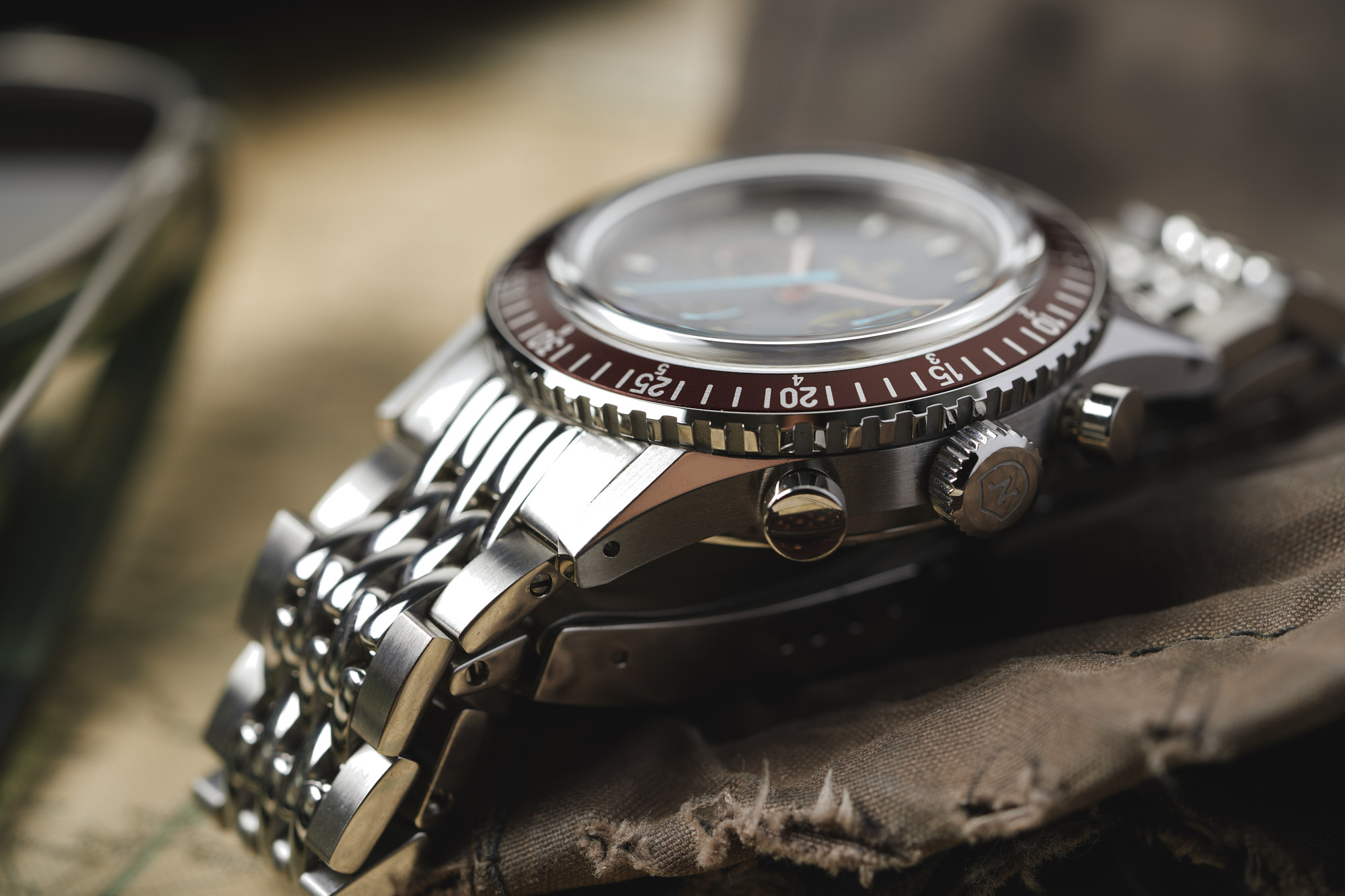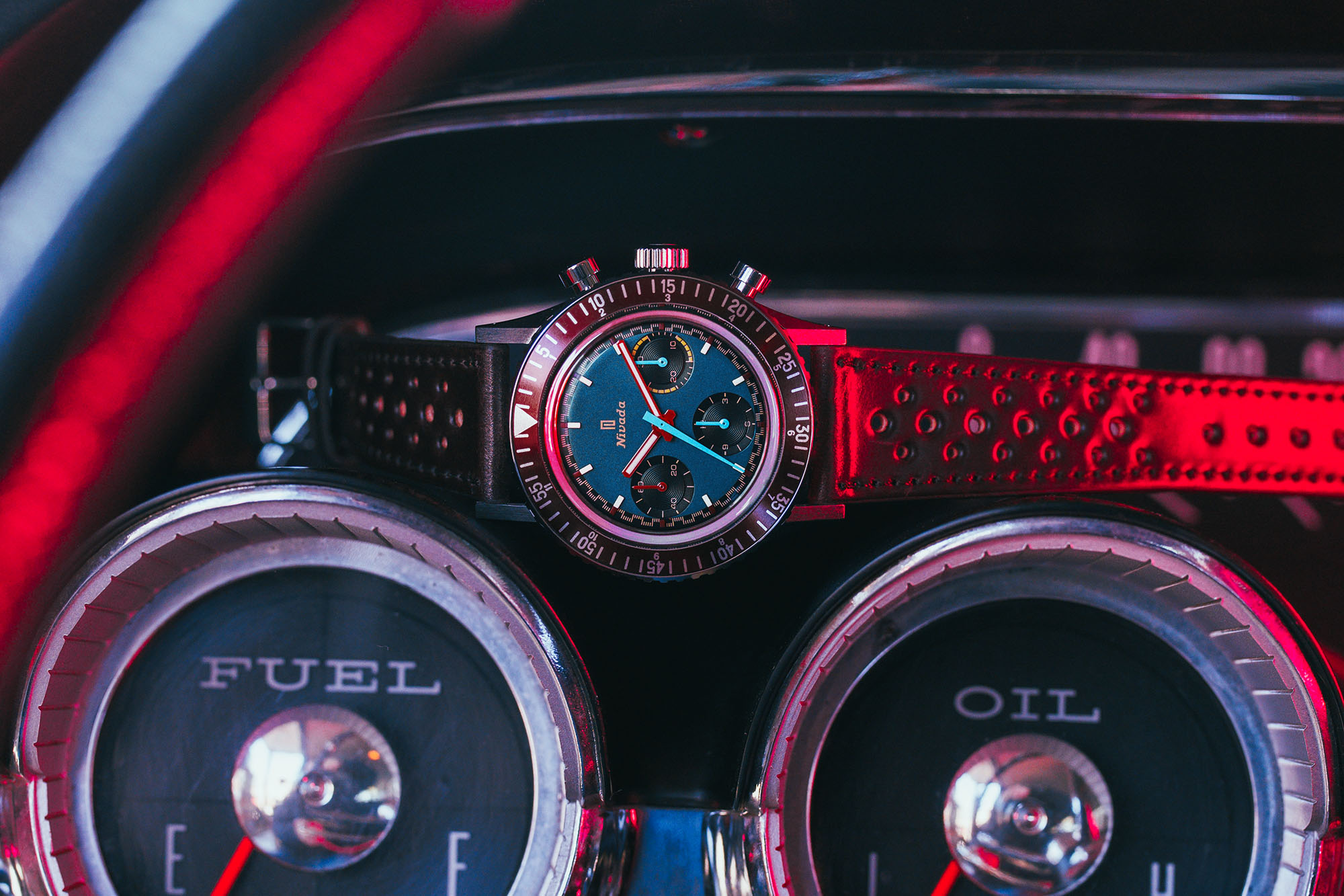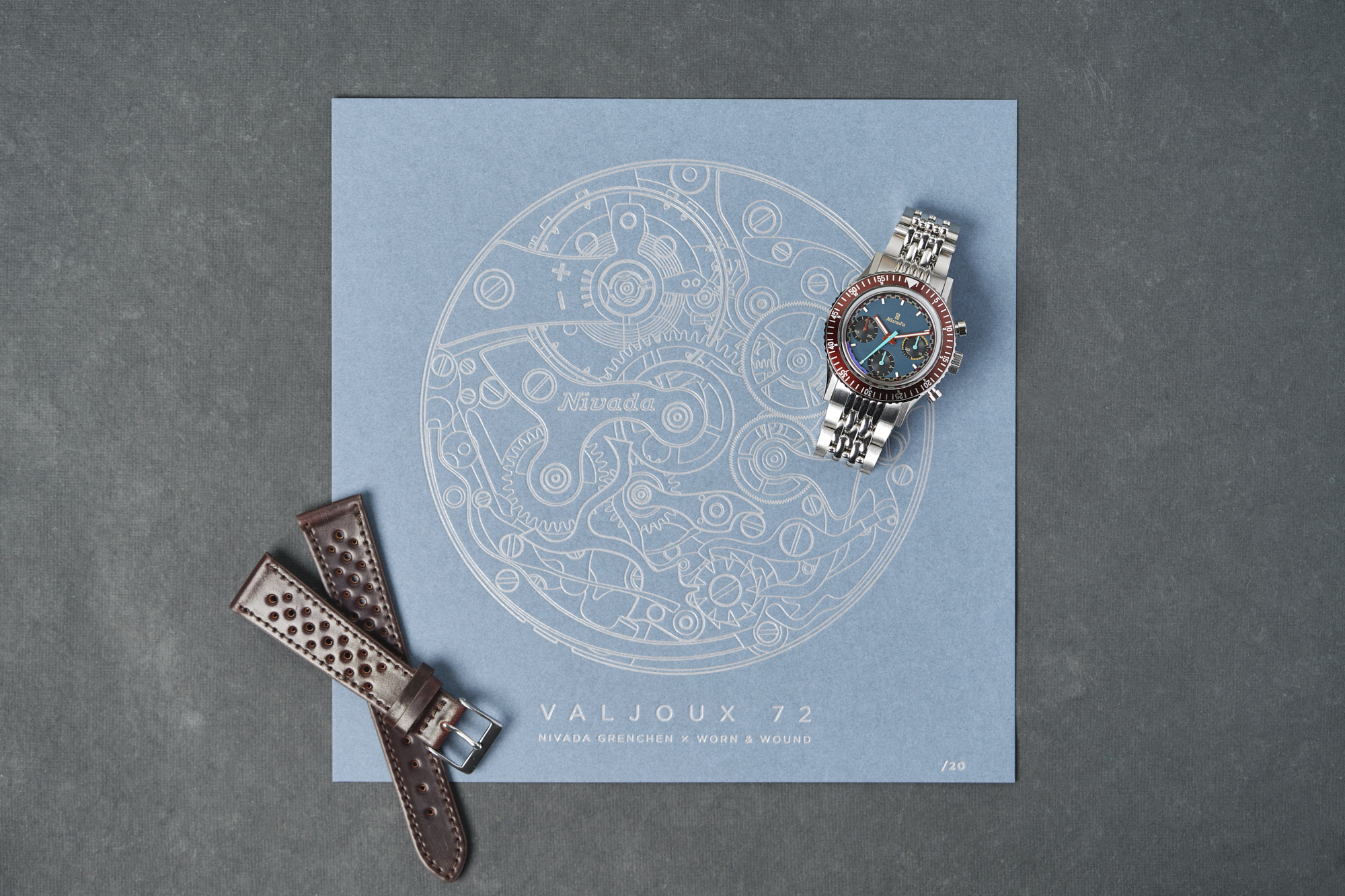 Limited to 20 pieces, the Nivada Grenchen x Worn & Wound Chronomaster Valjoux 72 includes a steel “beads of rice” bracelet, a German-made rally strap in Horween Color 8 shell cordovan, and a numbered letterpress print of the Valjoux 72 movement by Springs + Gears.