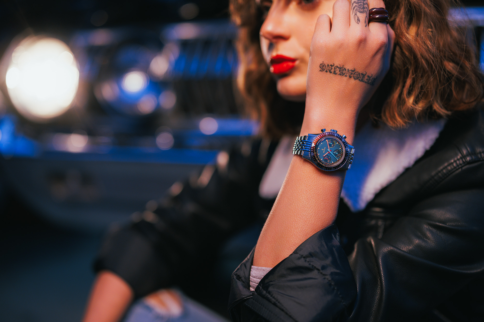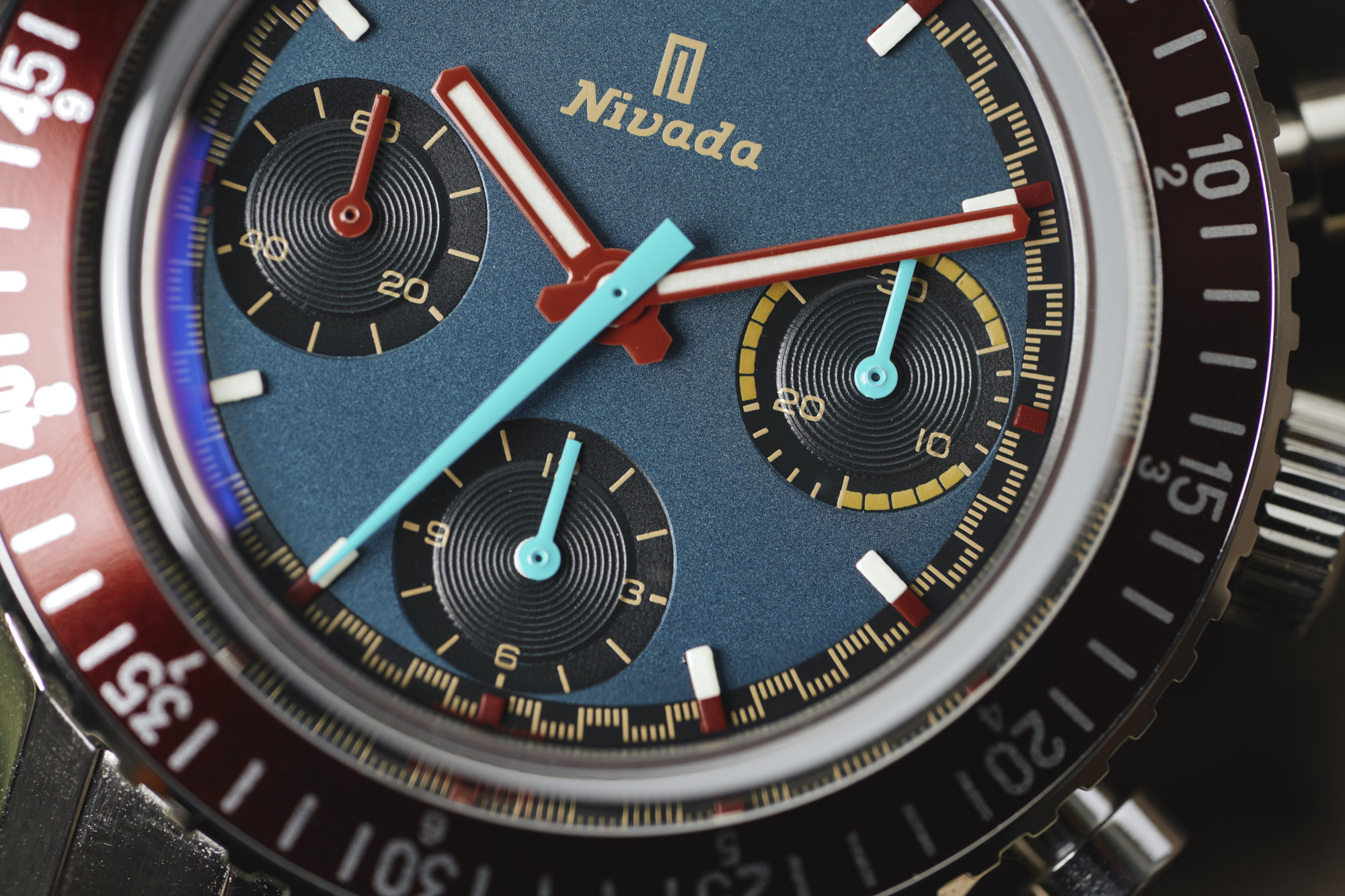 Based on Nivada’s classic 38mm (39mm at the bezel) x 46.5mm x 14mm Chronomaster case, the Worn & Wound Valjoux 72 limited edition features a black cherry aluminum bezel and a “racing-dial” layout from Nivada’s archives. The primary dial surface is rendered in deep fog gray with a strong blue undertone, and a racing-style chrono-seconds index is printed in undulating khaki lines on a black outer ring with dark red breaks at 5-second marks. Black sub-dials with khaki indexes break up the surface, and large applied lume plots mark the hours, day or night. The timing hands are painted deep cherry red, while the chronograph hands are in bright, cyan blue.