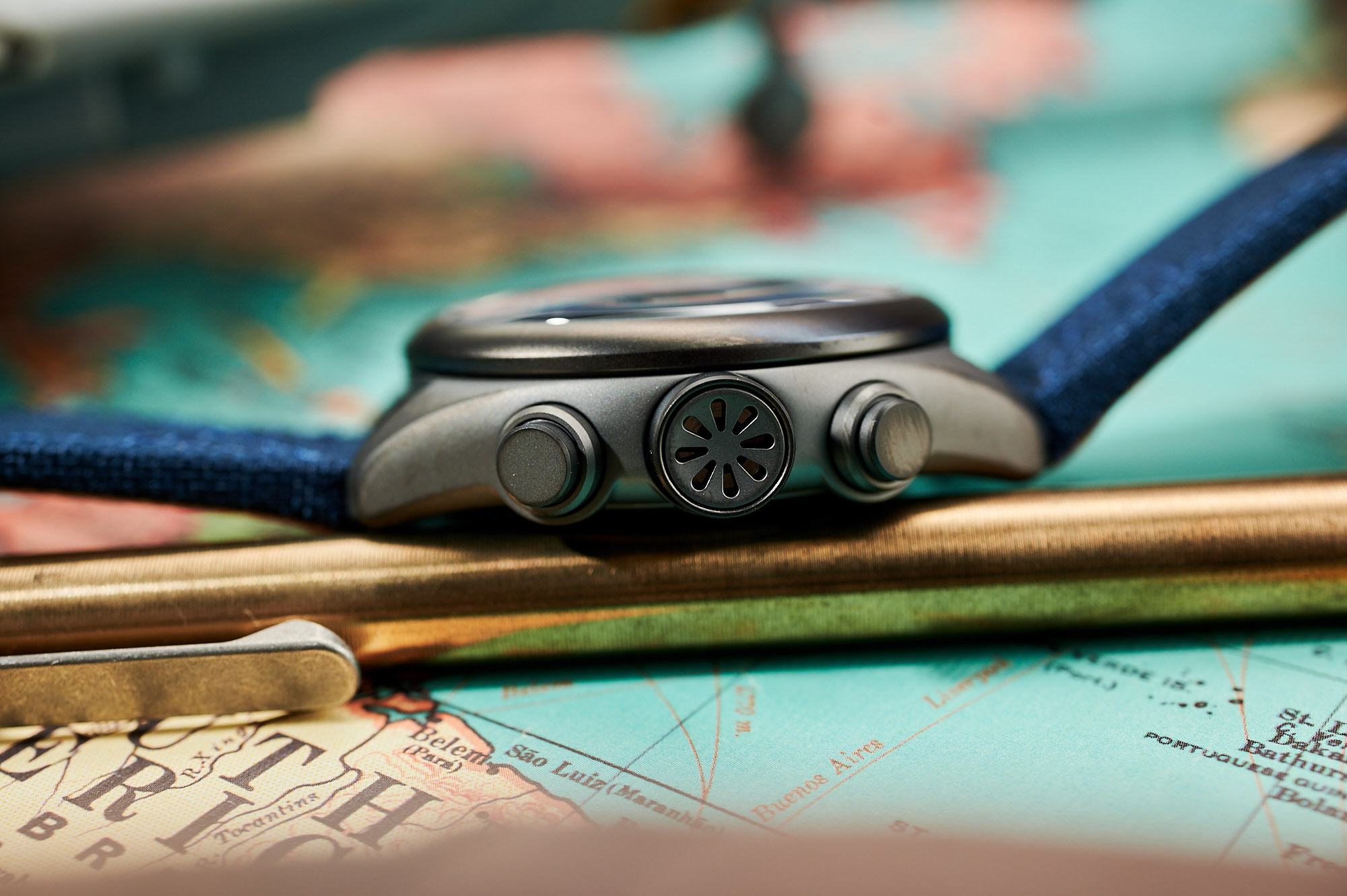 The case of the Altichron is 47 mm of black DLC-coated titanium, contrasted by the dial with its yellow accents. An aperture around the center of the dial in conjunction allows the metric altimeter to measure between 1,000 and 32,000 ft. At 9 o’clock is the second sub-altimeter. The two pushers on the left side of the case activate other functions, including an electronic compass. A date complication can be found at 3 o’clock.