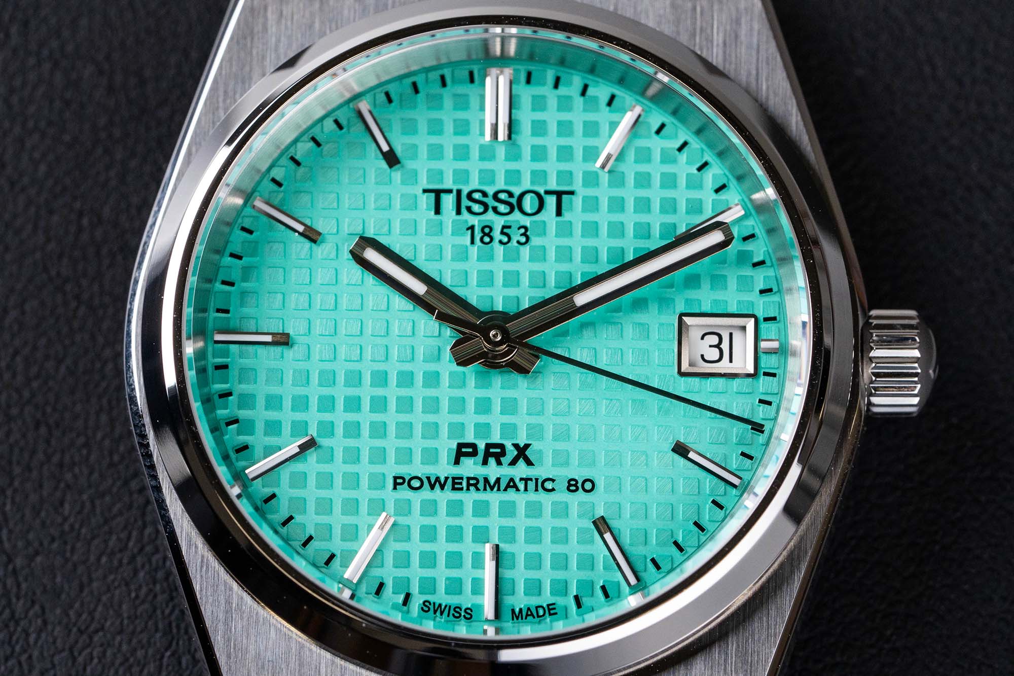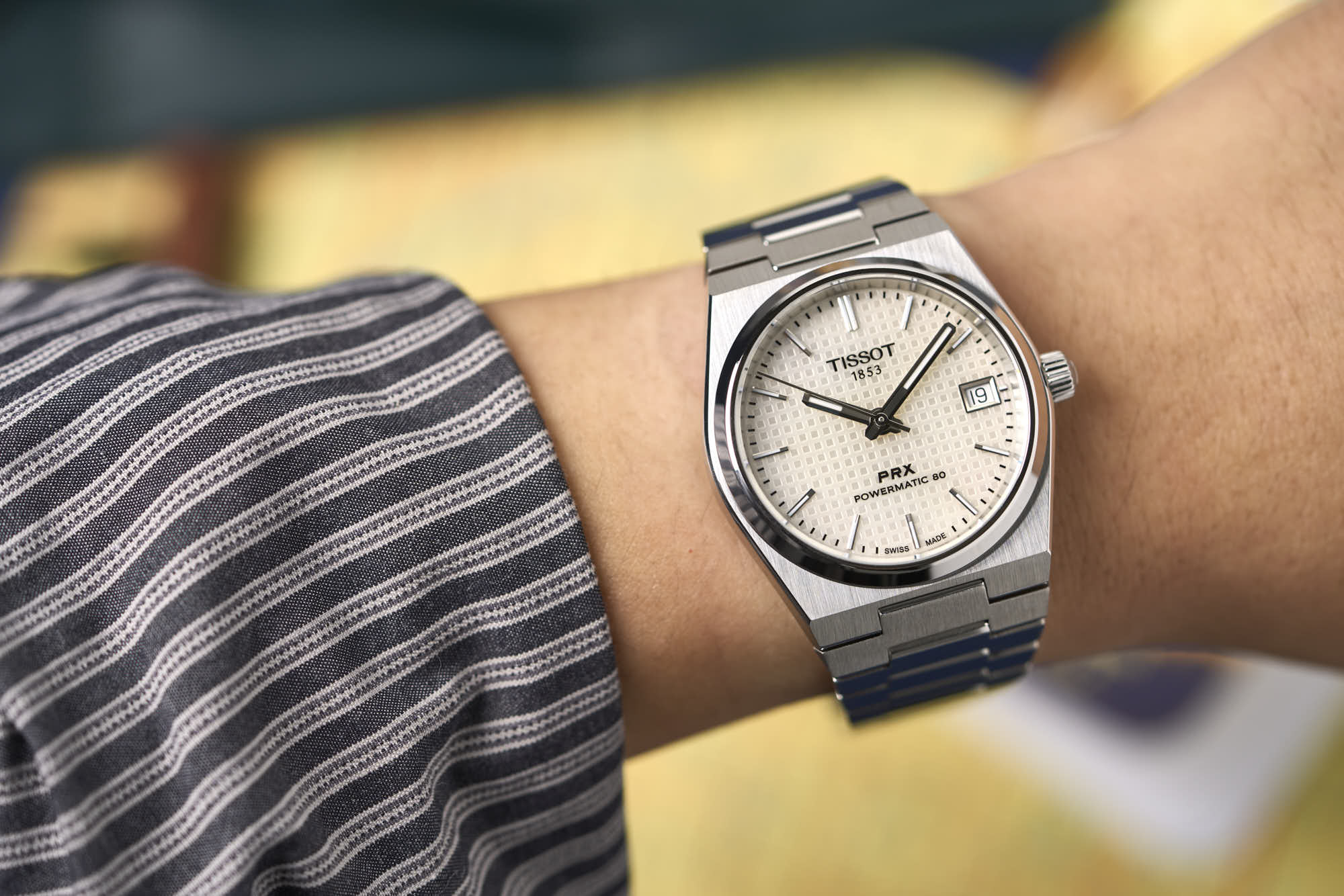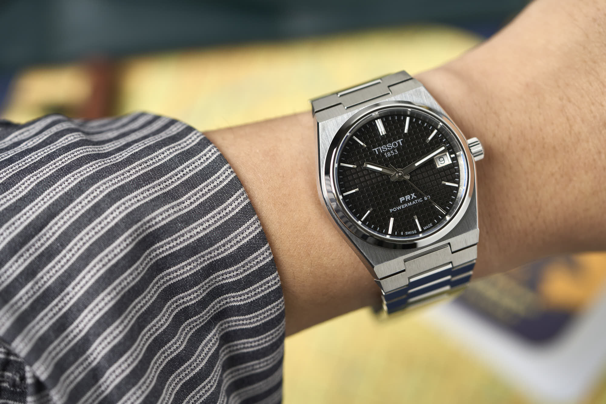 Featuring a stainless 35mm steel case with a mix of expertly executed brushed and polished surfaces, the PRX has a classic barrel shape with faceted sides that cleanly flow into a tapering bracelet or rubber strap. A short 35mm length, 10.9mm height, and integrated bracelet design allow for a comfortable fit on small wrists and will appeal to those who prefer a smaller size in general. The dial features lume-filled batons on top of a textured surface in a variety of colors for a classic and attractive look. Riding the line between dress and sport, the Tissot PRX is a versatile watch that can be worn for any occasion.