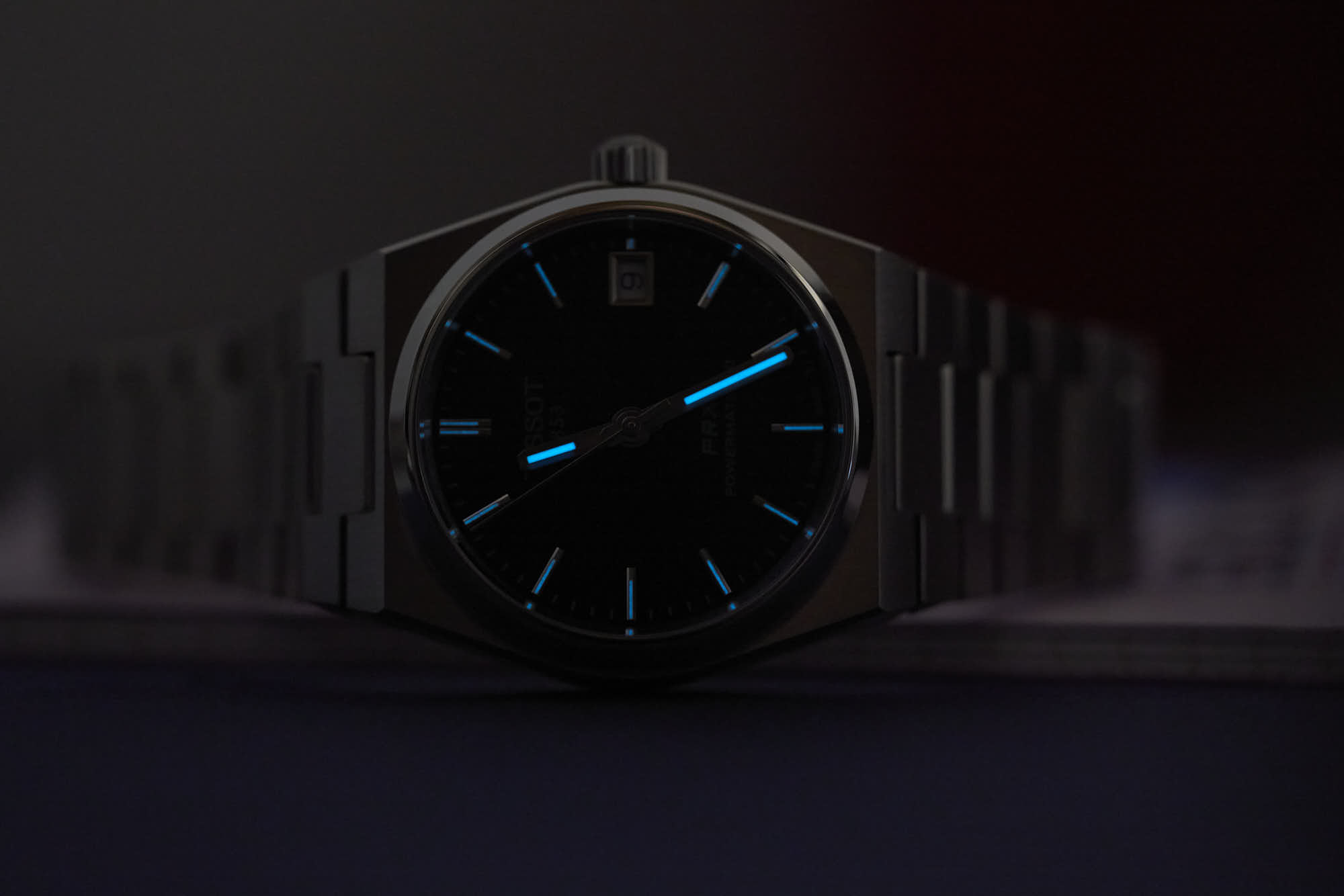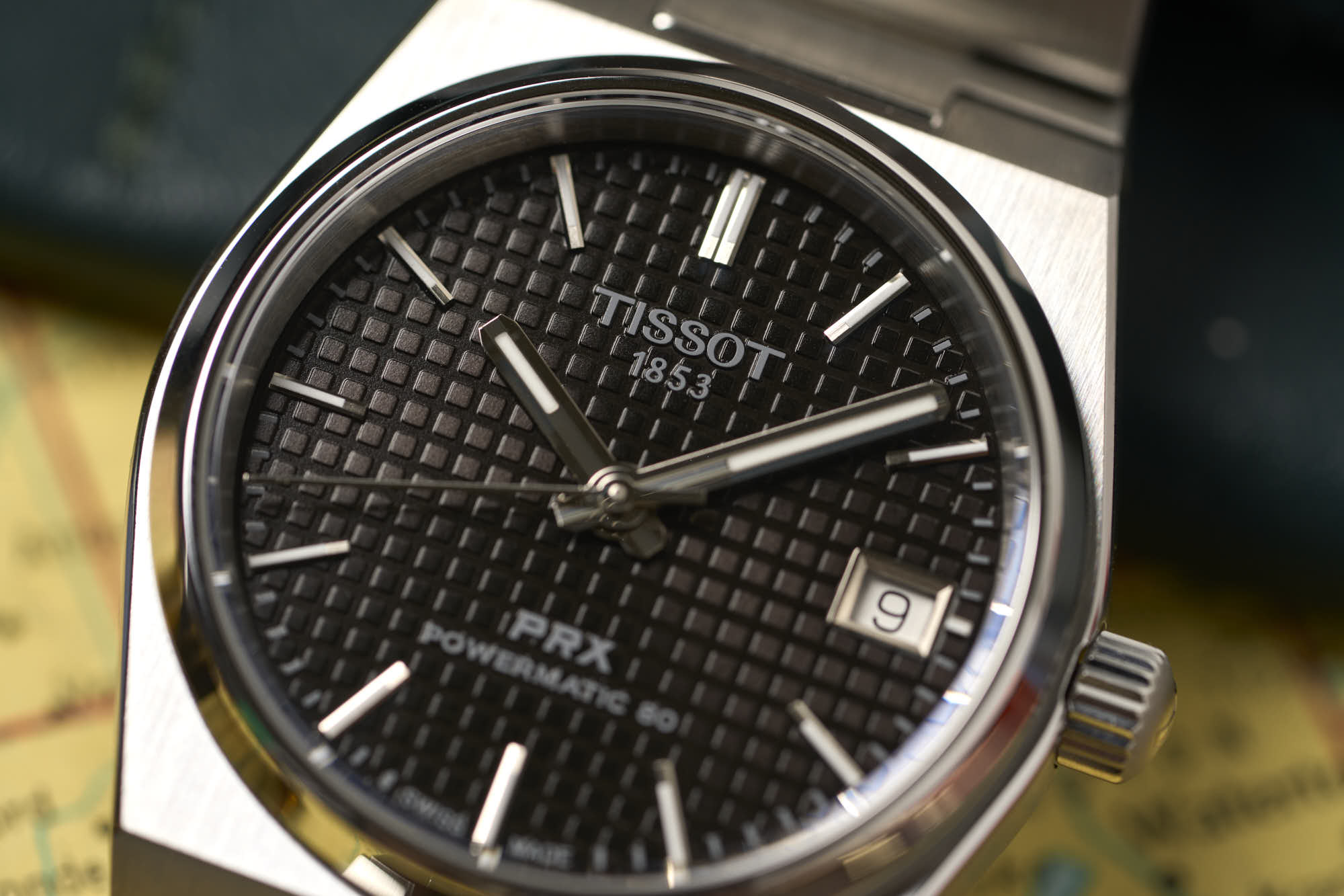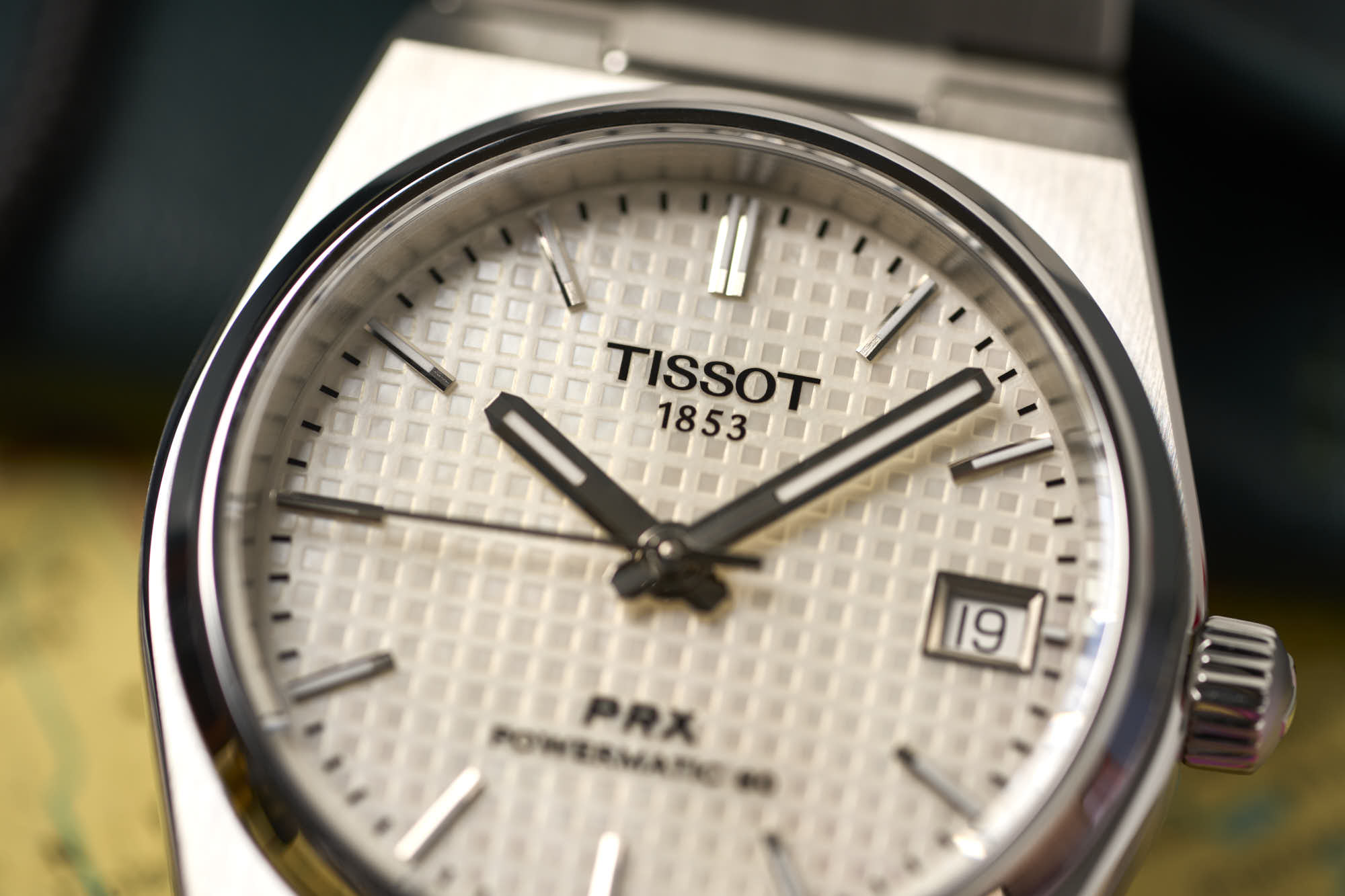 Featuring a stainless 35mm steel case with a mix of expertly executed brushed and polished surfaces, the PRX has a classic barrel shape with faceted sides that cleanly flow into a tapering bracelet or rubber strap. A short 35mm length, 10.9mm height, and integrated bracelet design allow for a comfortable fit on small wrists and will appeal to those who prefer a smaller size in general. The dial features lume-filled batons on top of a textured surface in a variety of colors for a classic and attractive look. Riding the line between dress and sport, the Tissot PRX is a versatile watch that can be worn for any occasion.